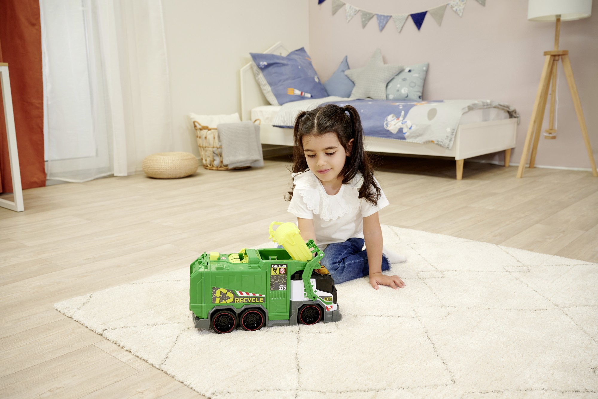 Ta ciężarówka z motywem recyklingu została zaprojektowana, aby wprowadzić malucha w podstawy recyklingu i znaczenia segregacji odpadów.