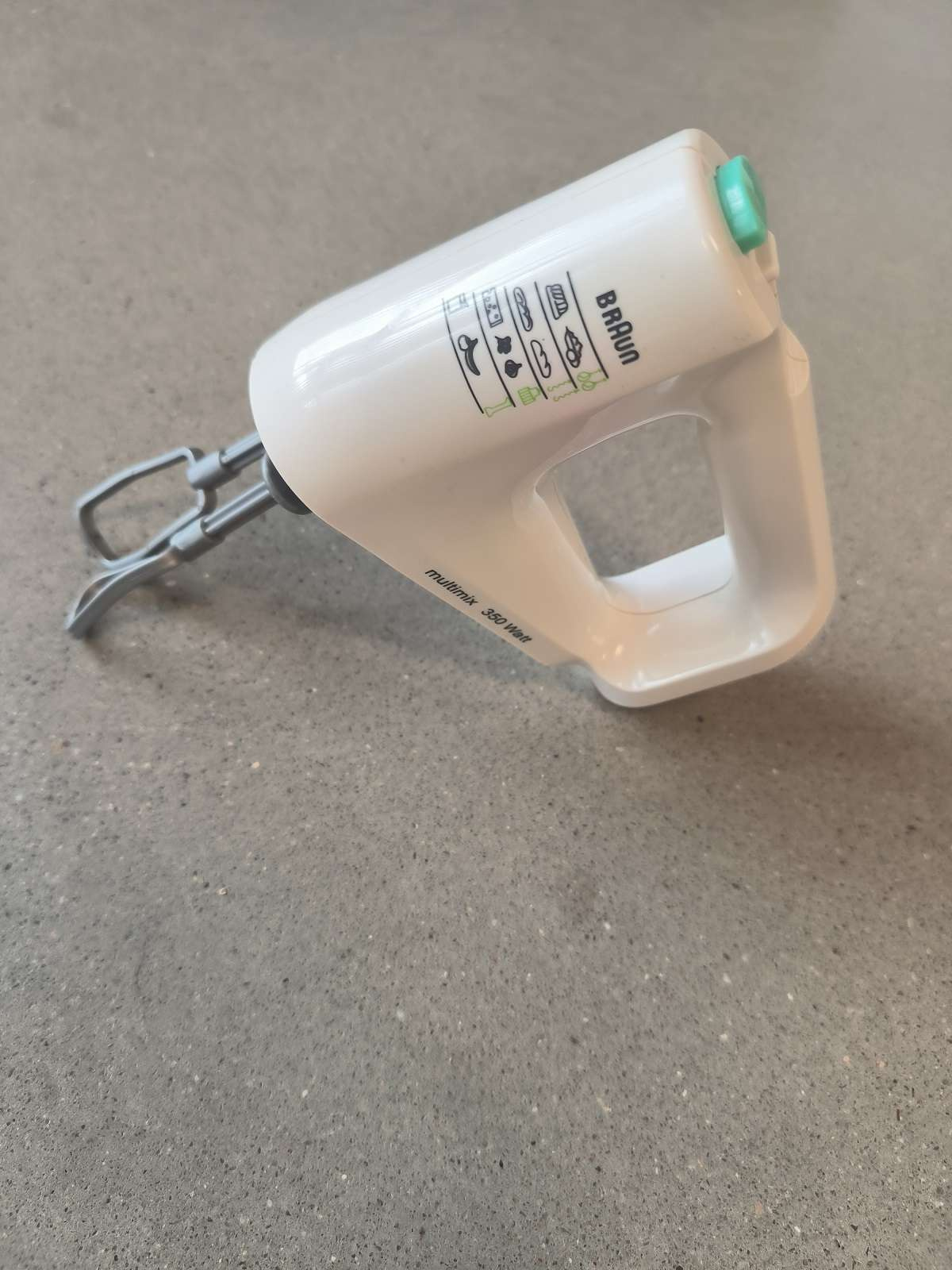 - Zabawkowy mikser ręczny Braun, będący wierną kopią realnego miksera tej marki, wyposażony w końcówki od Theo Kleina.