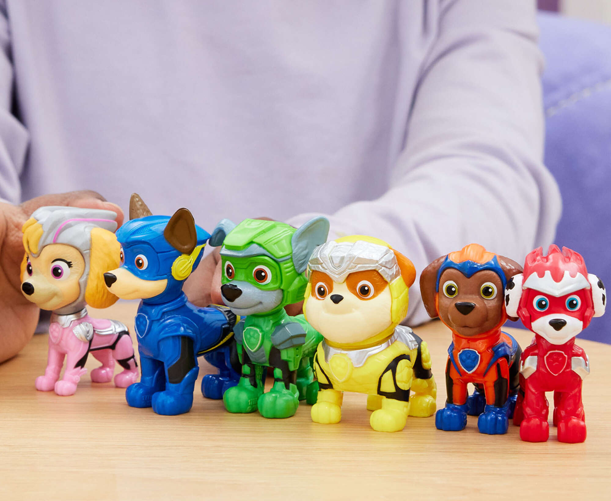 Zestaw składa się z 6 plastikowych figurek, które przedstawiają dzielne pieski Psiego Patrolu. Figurki posiadają ruchome głowy.