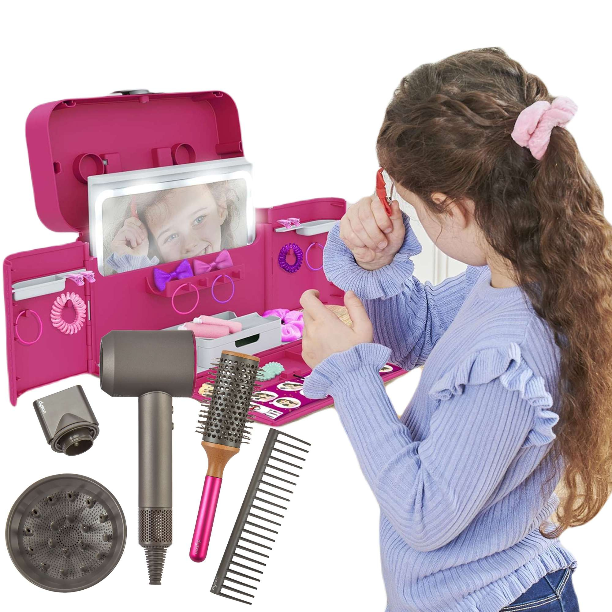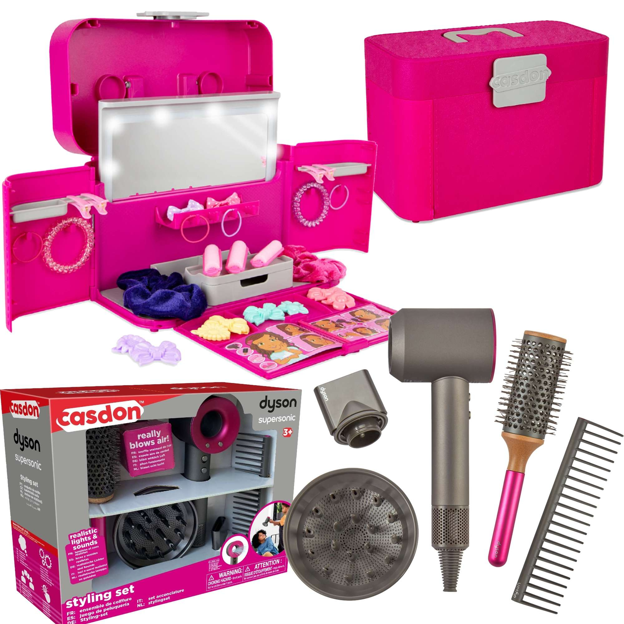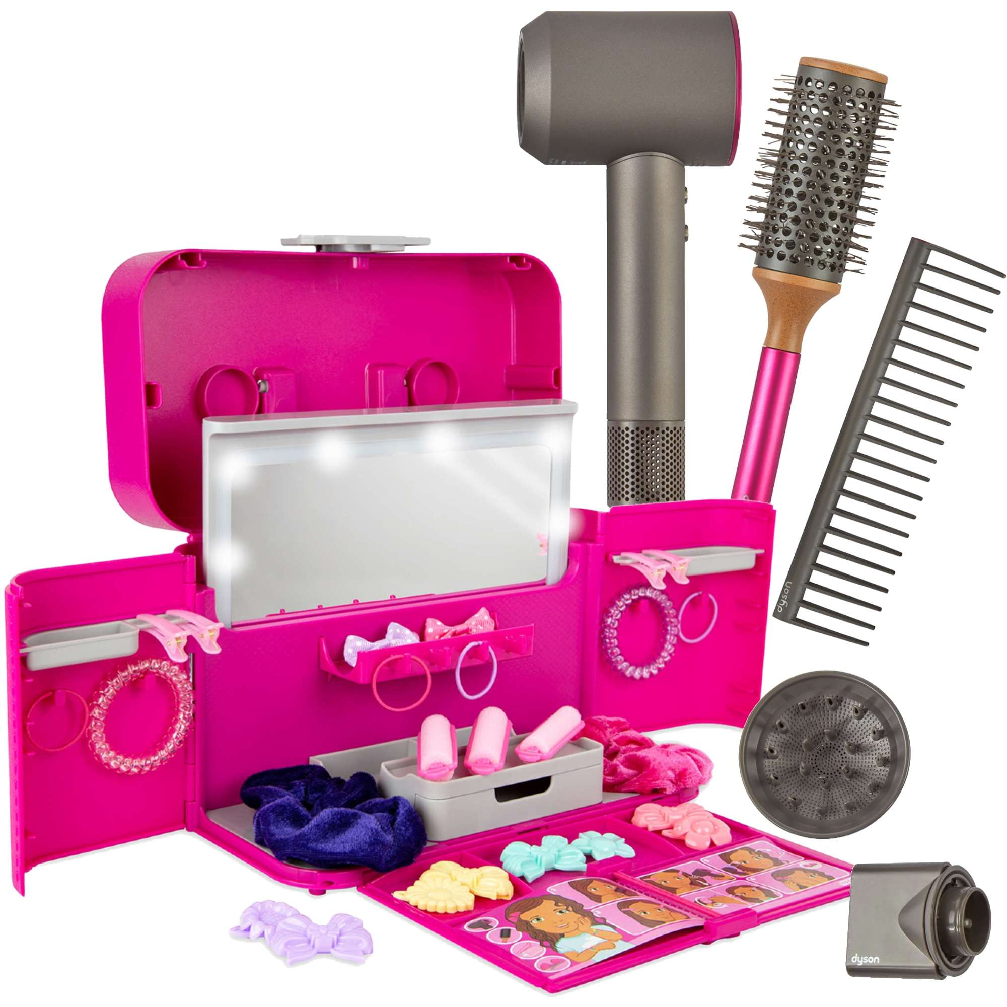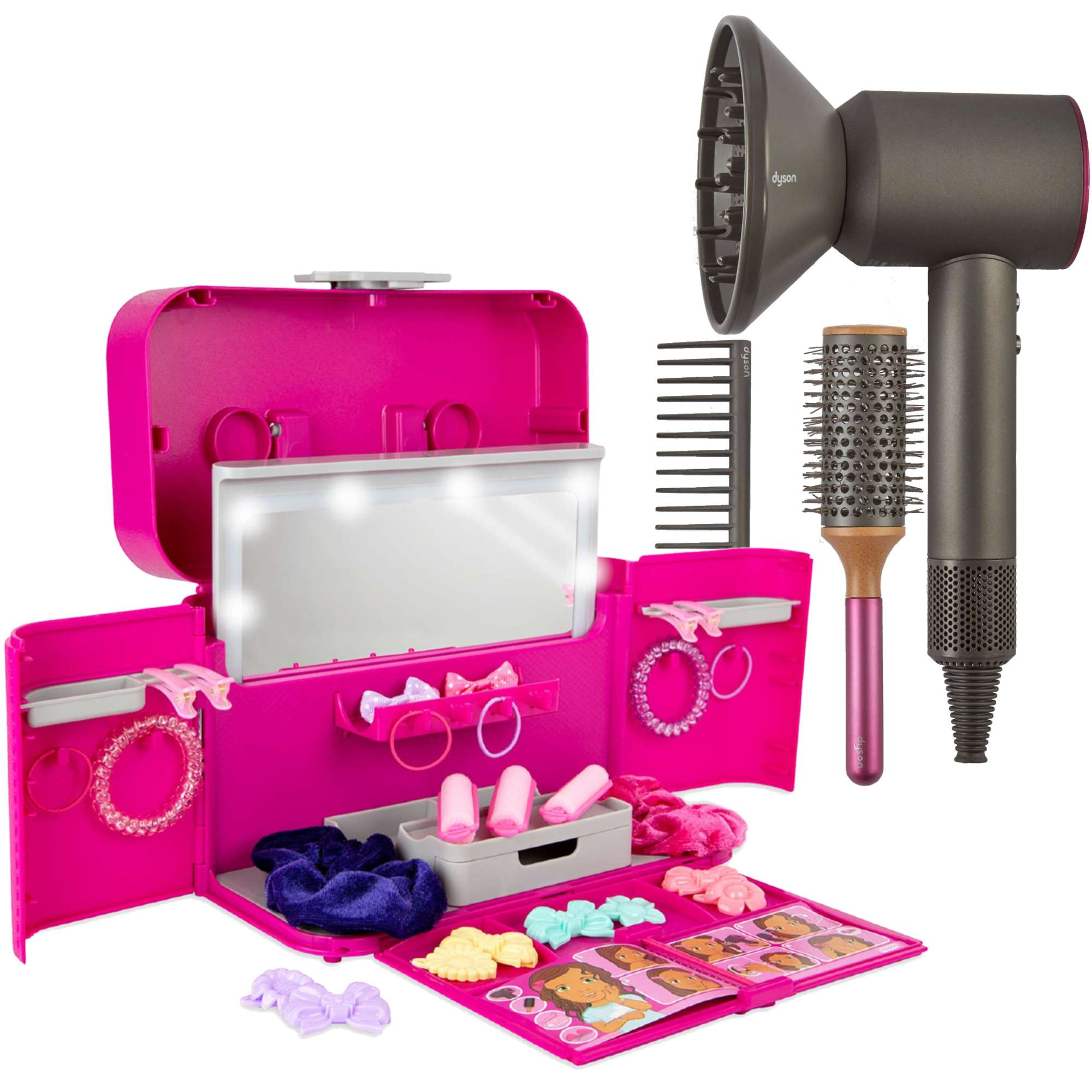 W tym zestawie znajduje się niezwykle stylową zabawkową suszarkę do włosów Dyson Supersonic, która jak działa jak prawdziwa. Po włączeniu suszarka ma panele świetlne i nawet wydmuchuje prawdziwe powietrze. Dodatkowo suszarka ma nasadkę i dyfuzor, aby tworzyć jeszcze więcej eleganckich fryzur.