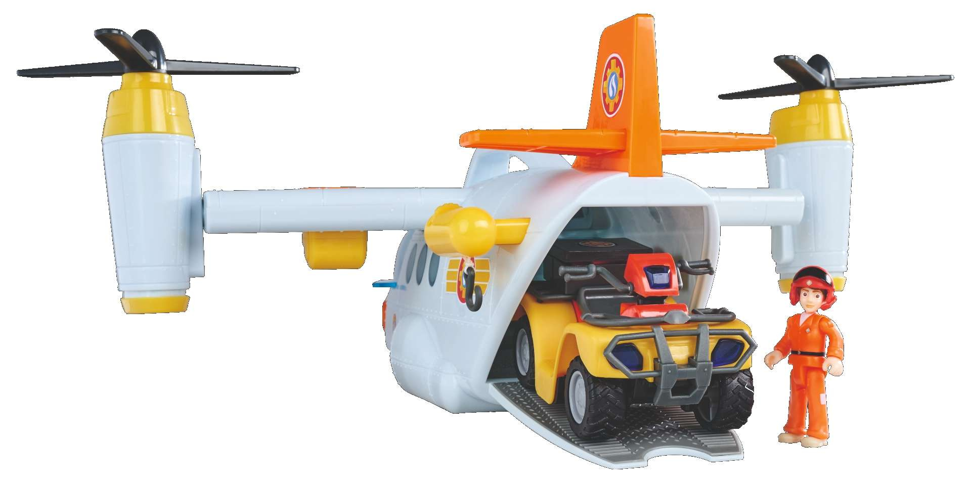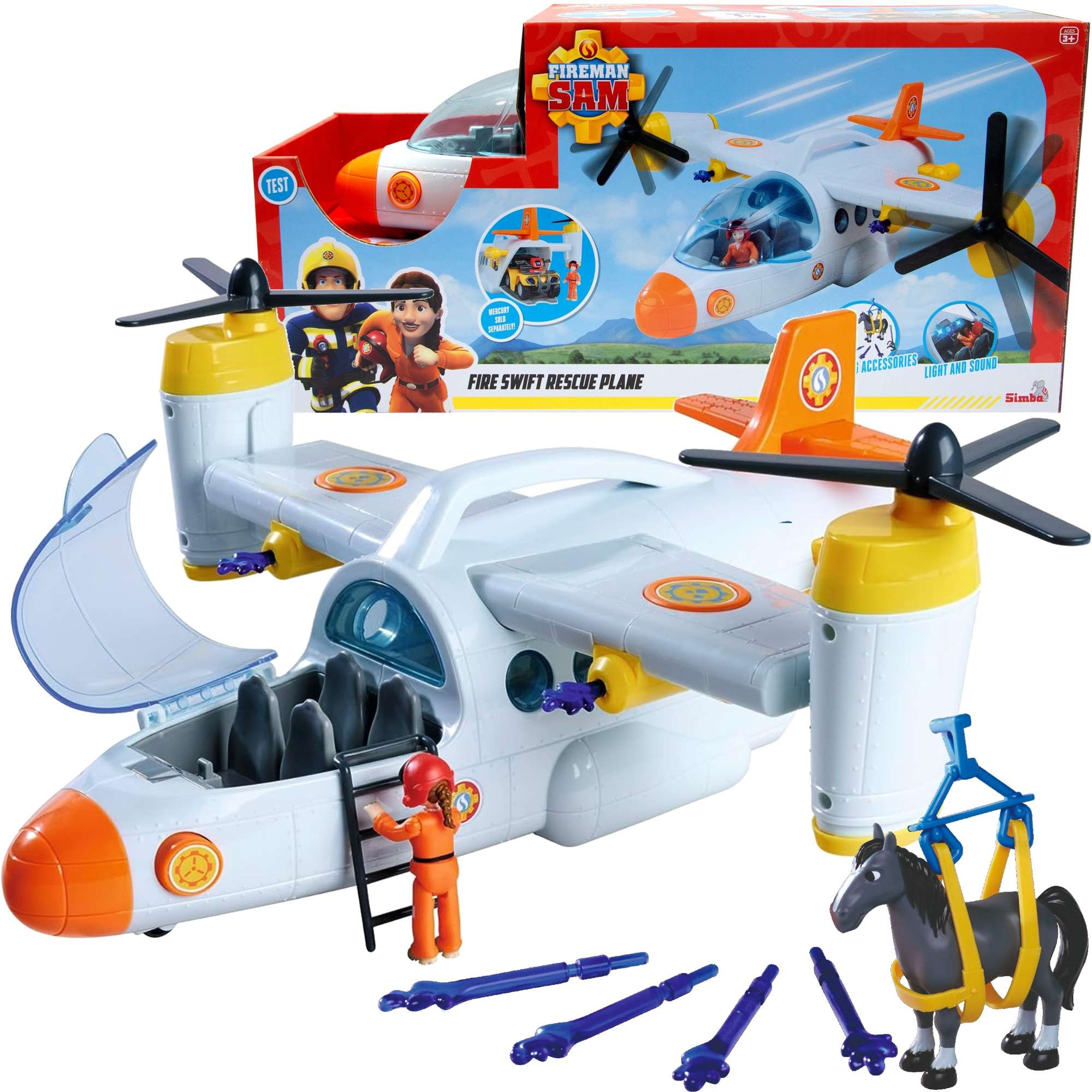W skład zestawu wchodzi wspaniały samolot wiernie odzwierciedlający najnowszy pojazd z serialu, figurka, koń oraz akcesoria. Samolot ratunkowy Strażaka Sama ma uchwyt do przenoszenia i koła umożliwiające idealne lądowanie. Dwa wirniki z boku można obracać. Posiada także wciągarkę linową. Z dźwiękami, a otwierany kokpit oferuje miejsce dla czterech osób. Wejście tam ułatwia czarna drabina. Z tyłu znajduje się otwierana ładownia, w której można przechowywać Mercury Quad (brak w zestawie). Do skrzydeł przyczepione są dwie armatki wodne, wystrzeliwujące wodne pociski za pomocą przycisku.