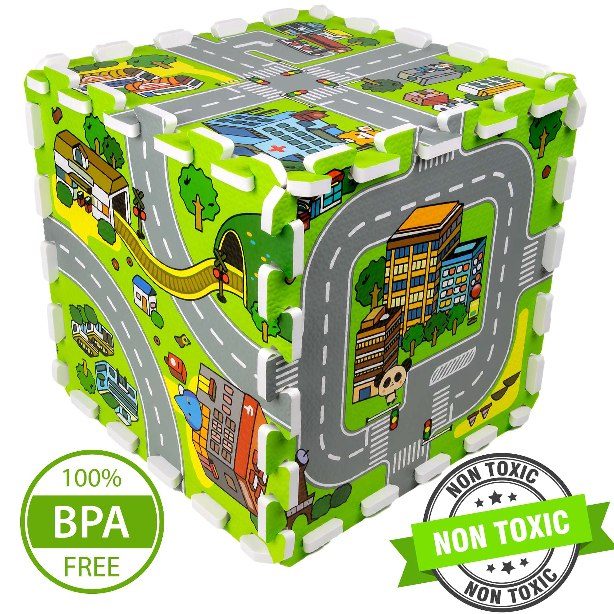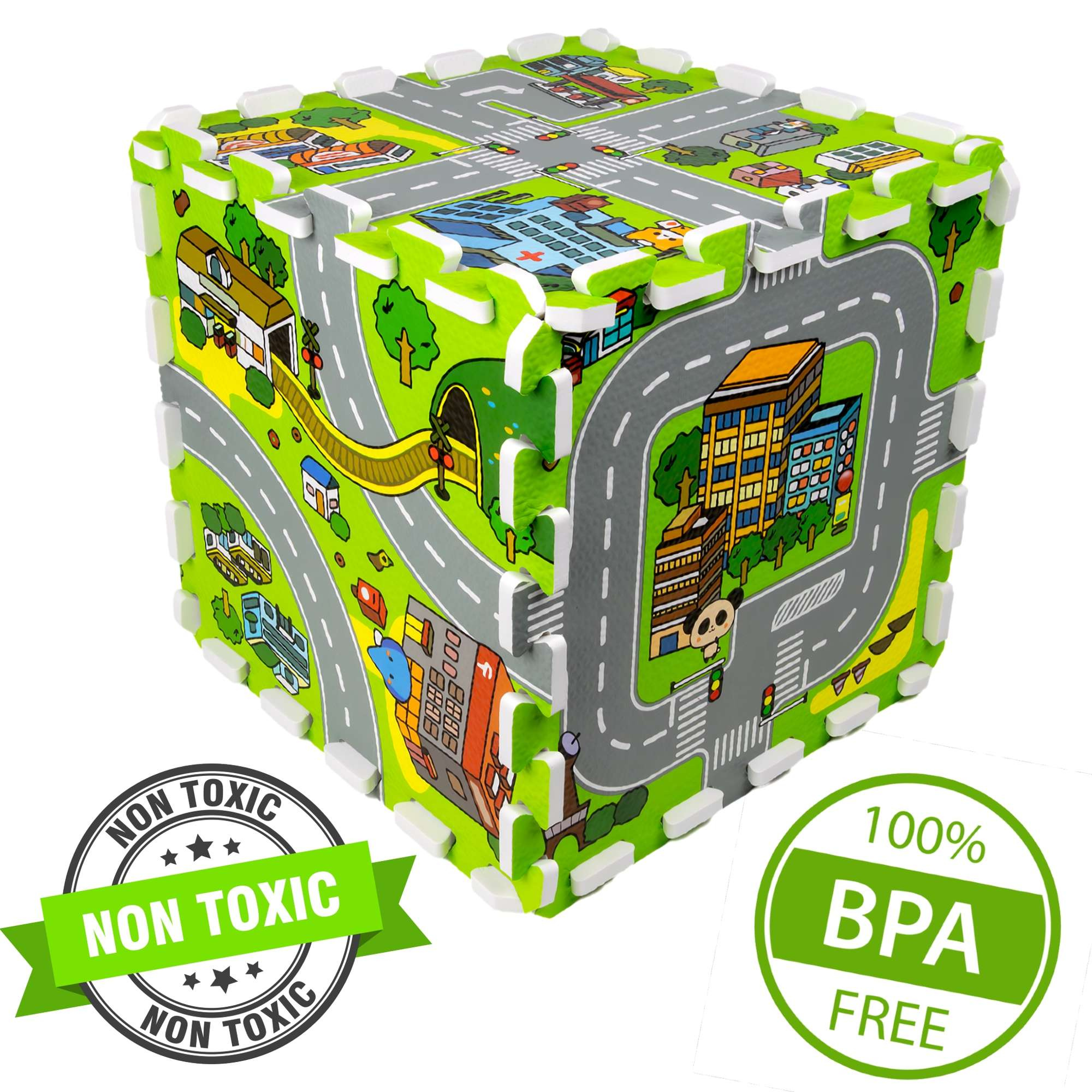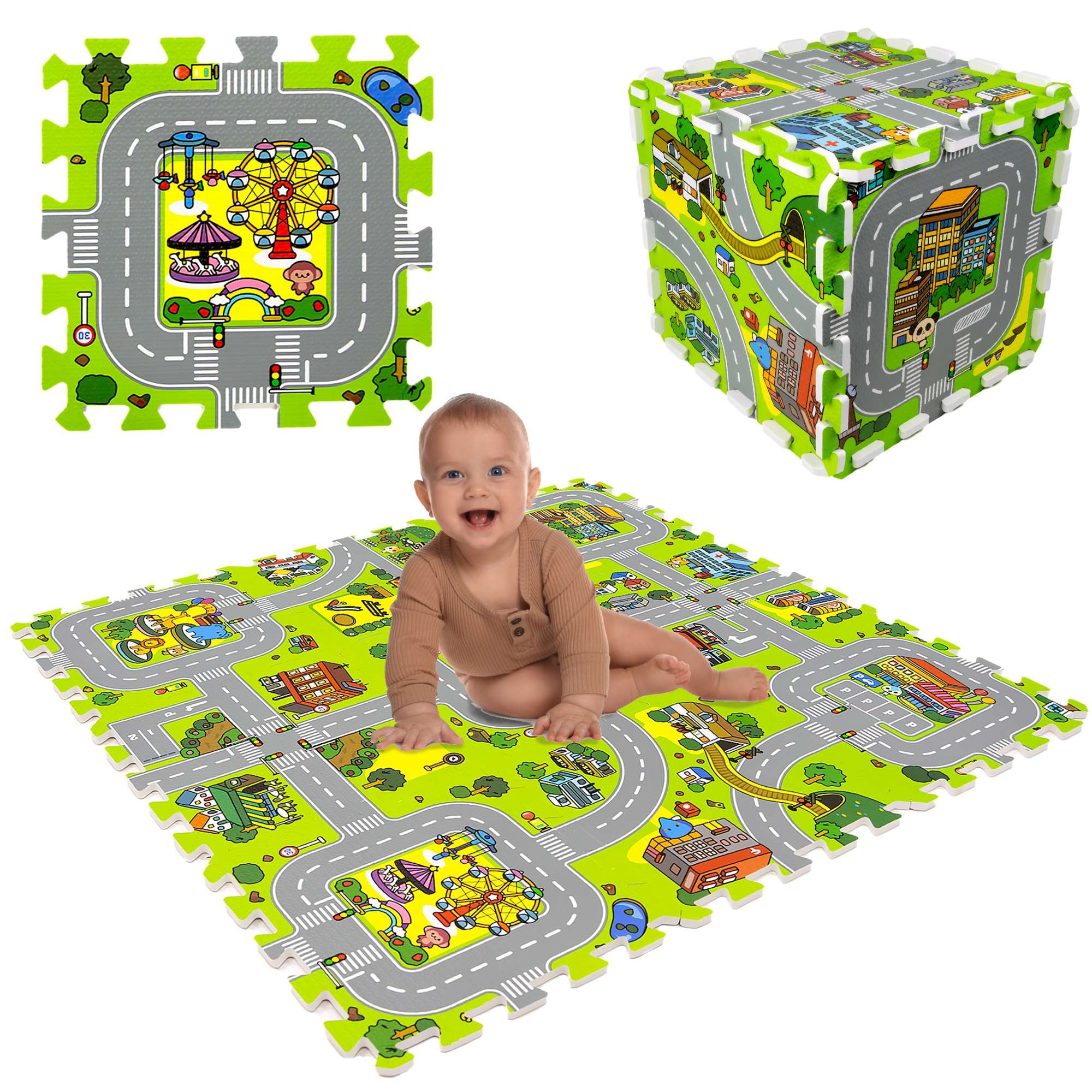 Mata piankowa to nie tylko dbanie o bezpieczeństwo najmłodszych, ale także wspieranie ich rozwoju. Jest wykonana z grubej i sprężystej pianki EVA, która skutecznie amortyzuje każdy upadek. Dziecko bez obaw może ćwiczyć przewracanie się na boki, raczkowanie czy pierwsze kroki. Gdy maluch podrośnie puzzle piankowe mogą służyć jako zabawka. Elementy można łączyć ze sobą na płasko, ale też przestrzennie tworząc np. sześcian. Taki zestaw pobudza dziecięcą wyobraźnię. Każdy z 9 puzzli posiada inny fragment miasteczka oraz liczne uliczki, dzięki czemu po złożeniu mata może posłużyć jako świetna podkładka dla samochodzików i urozmaicić zabawę najmłodszych.
