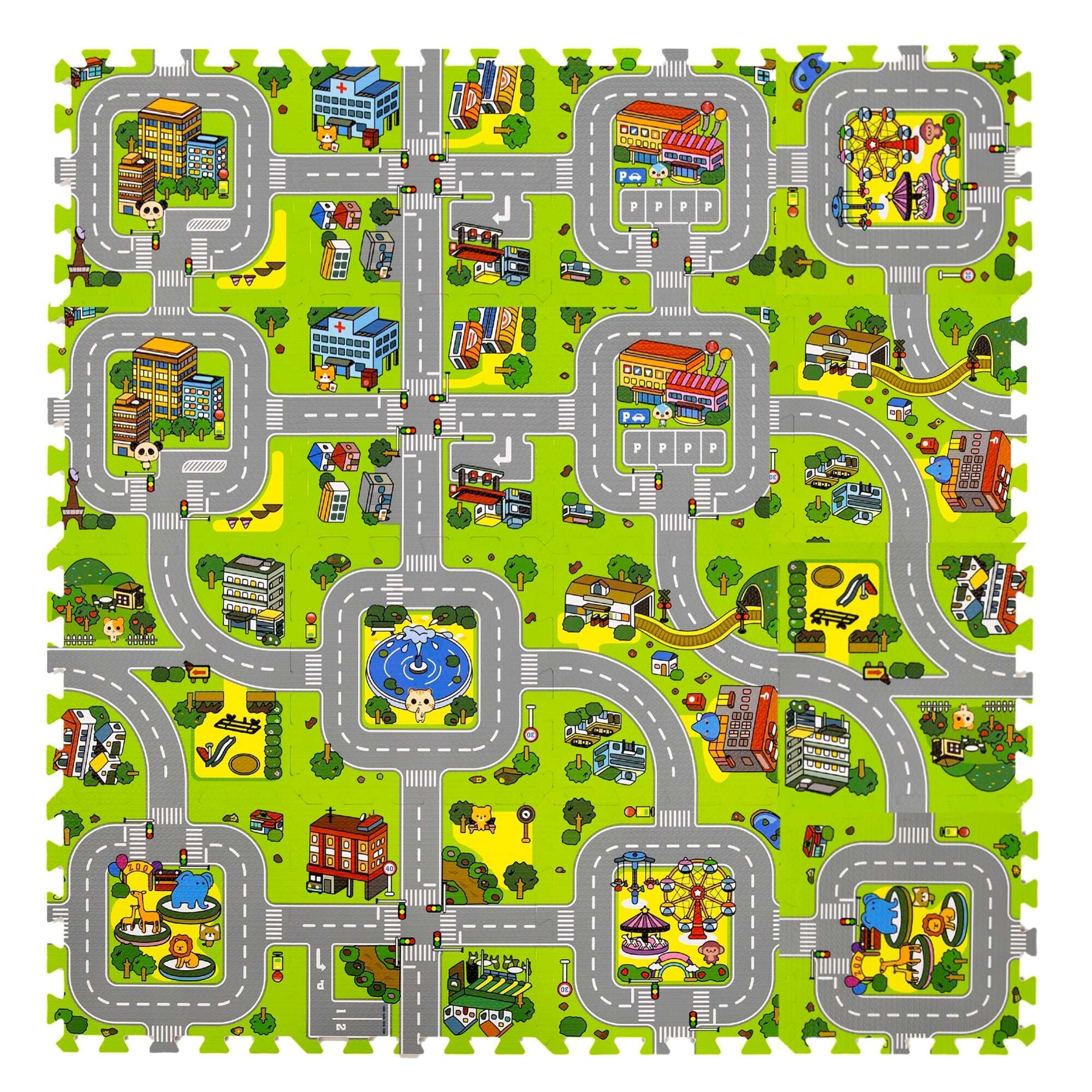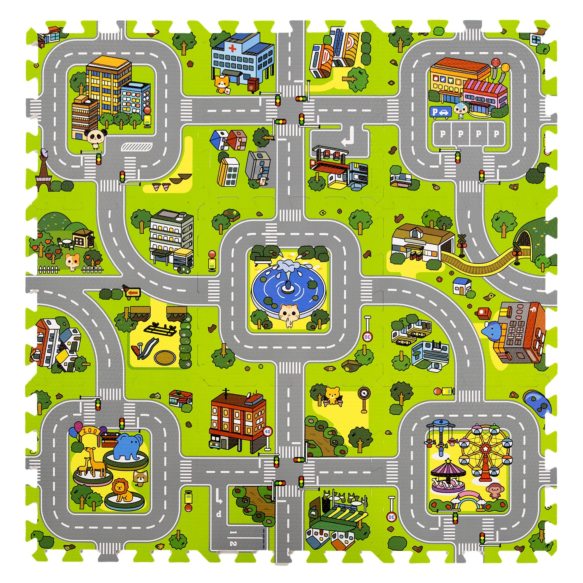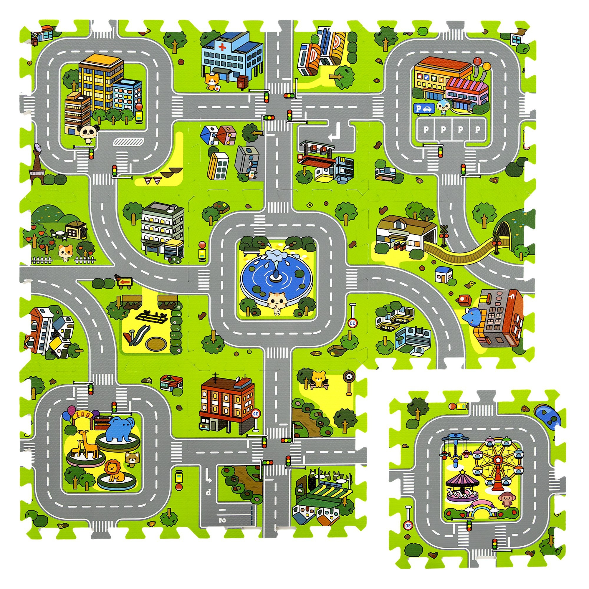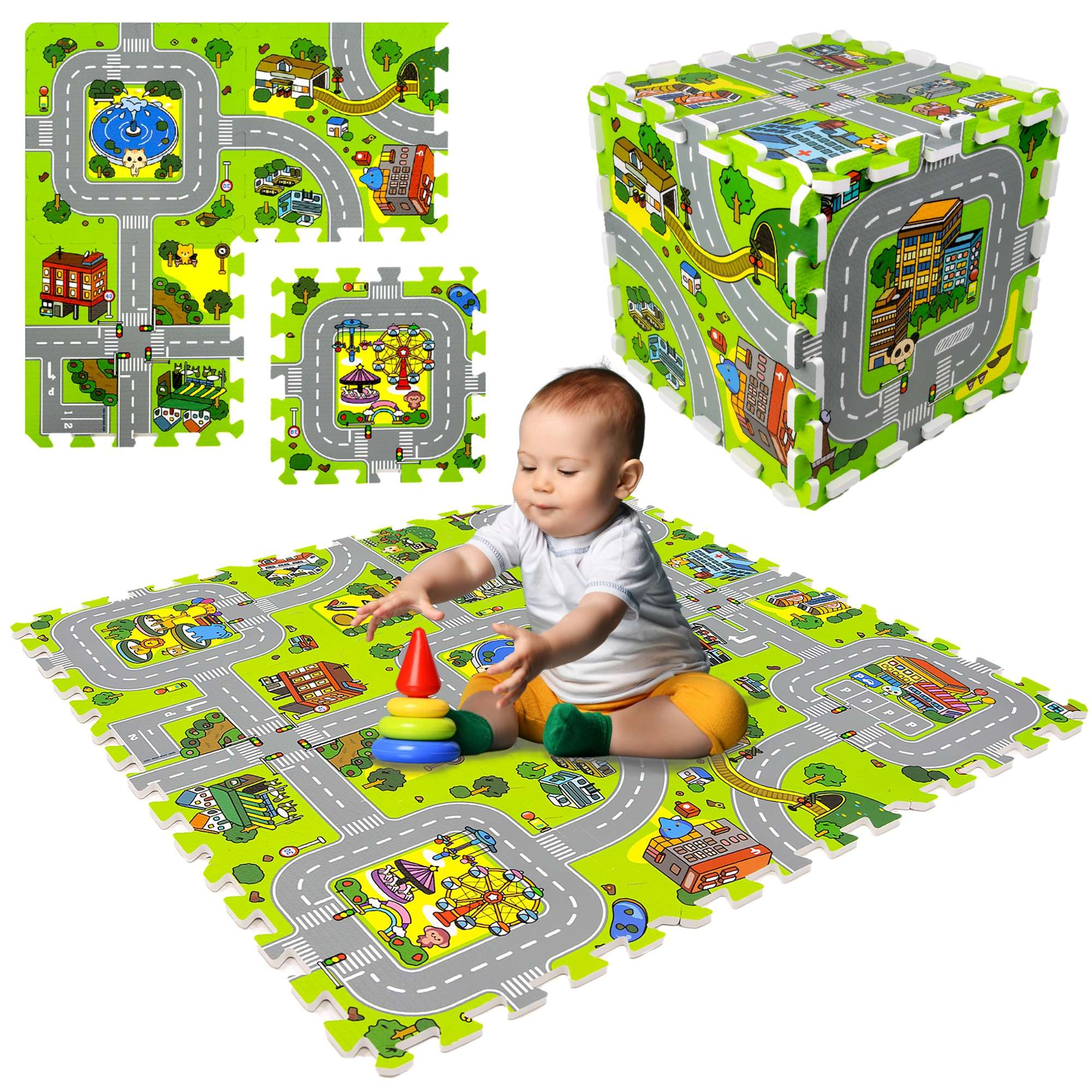 Mata piankowa to nie tylko dbanie o bezpieczeństwo najmłodszych, ale także wspieranie ich rozwoju. Jest wykonana z grubej i sprężystej pianki EVA, która skutecznie amortyzuje każdy upadek. Dziecko bez obaw może ćwiczyć przewracanie się na boki, raczkowanie czy pierwsze kroki. Gdy maluch podrośnie puzzle piankowe mogą służyć jako zabawka. Elementy można łączyć ze sobą na płasko, ale też przestrzennie tworząc np. sześcian. Taki zestaw pobudza dziecięcą wyobraźnię. Każdy z 9 puzzli posiada inny fragment miasteczka oraz liczne uliczki, dzięki czemu po złożeniu mata może posłużyć jako świetna podkładka dla samochodzików i urozmaicić zabawę najmłodszych.