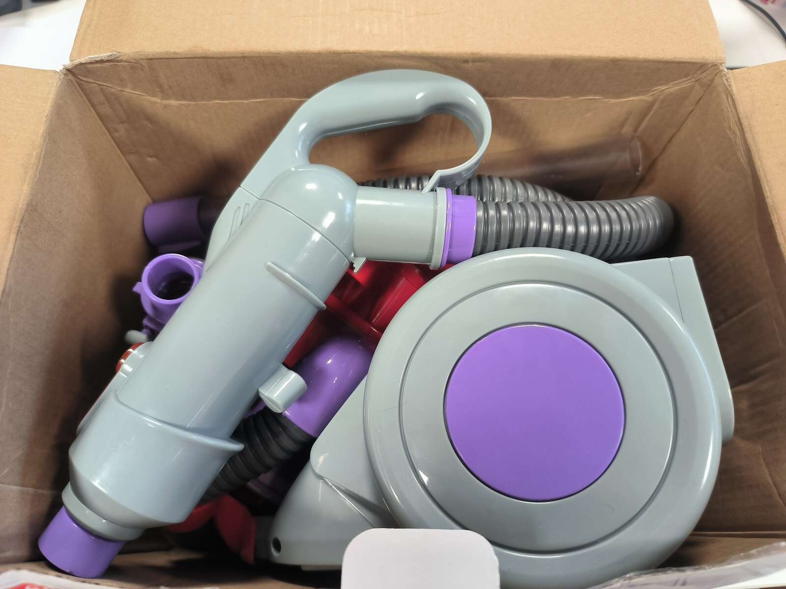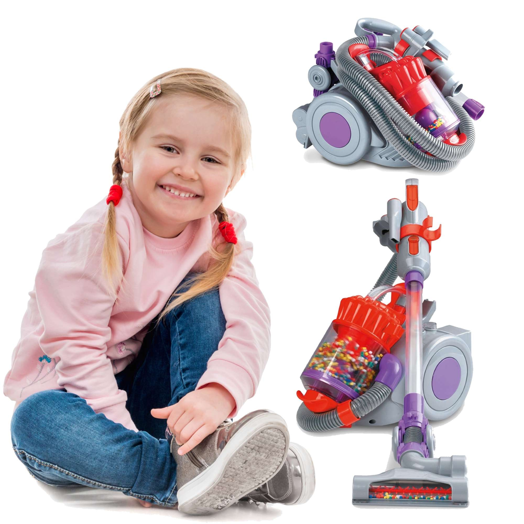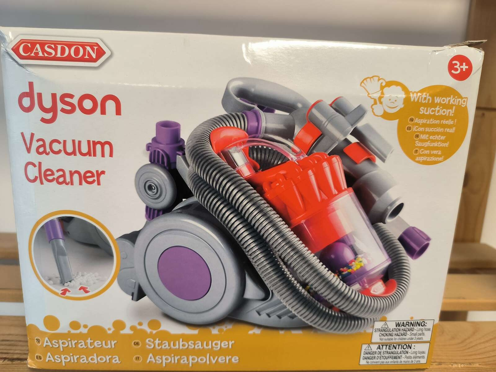 Odkurzacz Dyson działa jak prawdziwy odkurzacz, a po włączeniu wydaje dźwięki. Posiada zbiornik z wirującymi kolorowymi kuleczkami, oraz funkcję ssania, która pozwala posprzątać drobne kawałki np. papieru. Odkurzacz wciąga niewielkie, lżejsze śmieci do środka. Jest to odkurzacz-zabawka i jego siła ssąca jest dużo mniejsza , niż prawdziwego odkurzacza. Zabawka idealnie sprawdzi się jako narzędzie do zabawy w dom i zaangażuje dziecko w sprzątanie. Odkurzacz posiada pojemniczek na śmieci, który można samemu opróżniać. Po włączeniu zabawki dziecko może obserwować cyklonową akcję.
