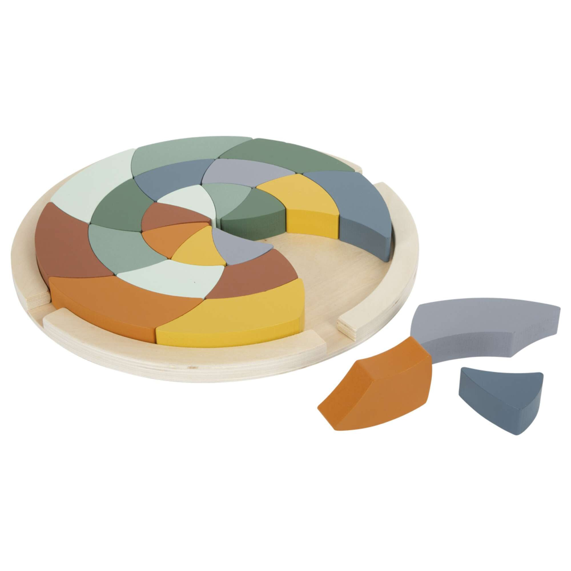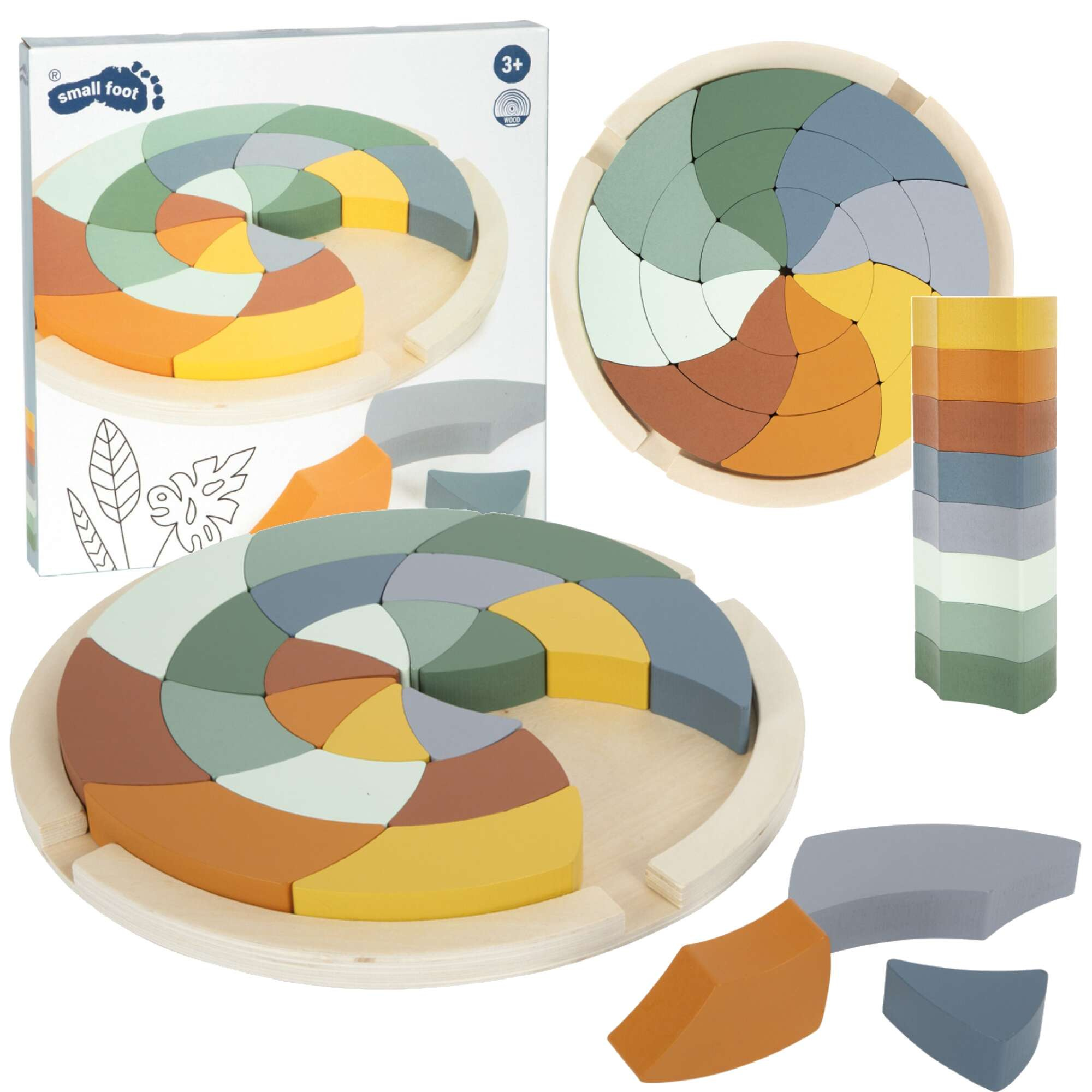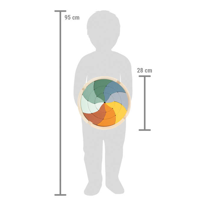 Układanka posiada 24 kolorowe elementy, razem składające się w większe koło. Do zestawu dołączona jest drewniana podkładka, która ułatwia zespolenie poszczególnych części. Wszystkie elementy kompletu zostały pomalowane na różne odcienie kojarzące się z ciepłymi barwami safari. Elementy można układać na wiele sposobów - kolorami, odcieniami lub kompletnie losowo. Niech twoje dziecko da ponieść się wyobraźni!
