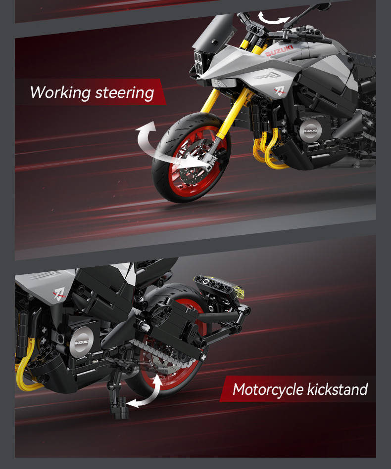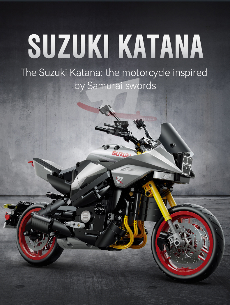 Zestaw składa się z 1104 elementów i umożliwia samodzielne złożenie motocykla Suzuki Katana w skali 1:6 inspirowanego mieczami samurajskimi. Pojazd stworzony został ze szczególną uwagą na detale, które zapewnią niesamowitą zabawę. Wyposażony jest w 2 gumowe koła, które umożliwiają mu poruszanie się po różnych powierzchniach. Motor ma czarny kolor z szarymi, żółtymi i czerwonymi elementami. Replika posiada wiele szczegółów, takich jak: reflektor, lusterka, przezroczysty silnik z ruchomymi tłokami, łańcuch, osłona przednia, miejsce do siedzenia, błotniki, deska rozdzielcza i tarcze hamulcowe oraz sprawne zawieszenie, 3-biegowa skrzynia biegów. W zestawie znajduje się też stojak na motocykl, podpórka, platforma i wydrukowana tabliczka znamionowa. Produkt na licencji.