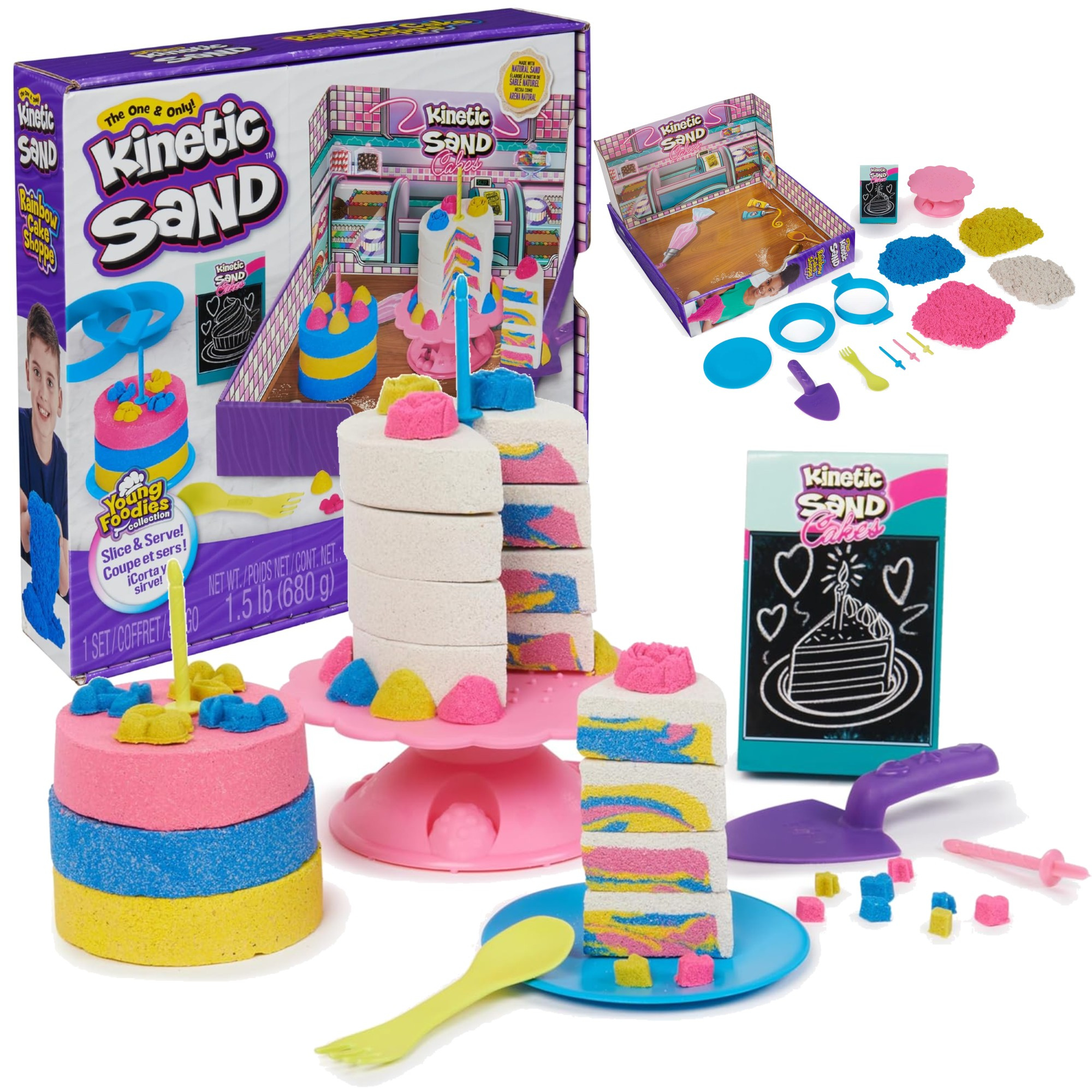 - Kinetic Sand Rainbow Cake Shoppe to zestaw inspirowany pieczeniem tortów i ciast. W pudełku znajdziemy 680 g kolorowego piasku w kolorze żółtym, różowym, niebieskim i białym o zapachu wanilii. Dzieci mogą tworzyć kolorowe, warstwowe wypieki.