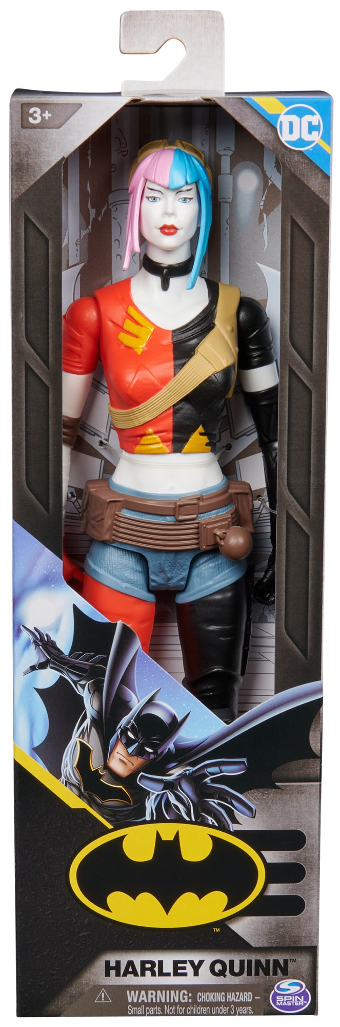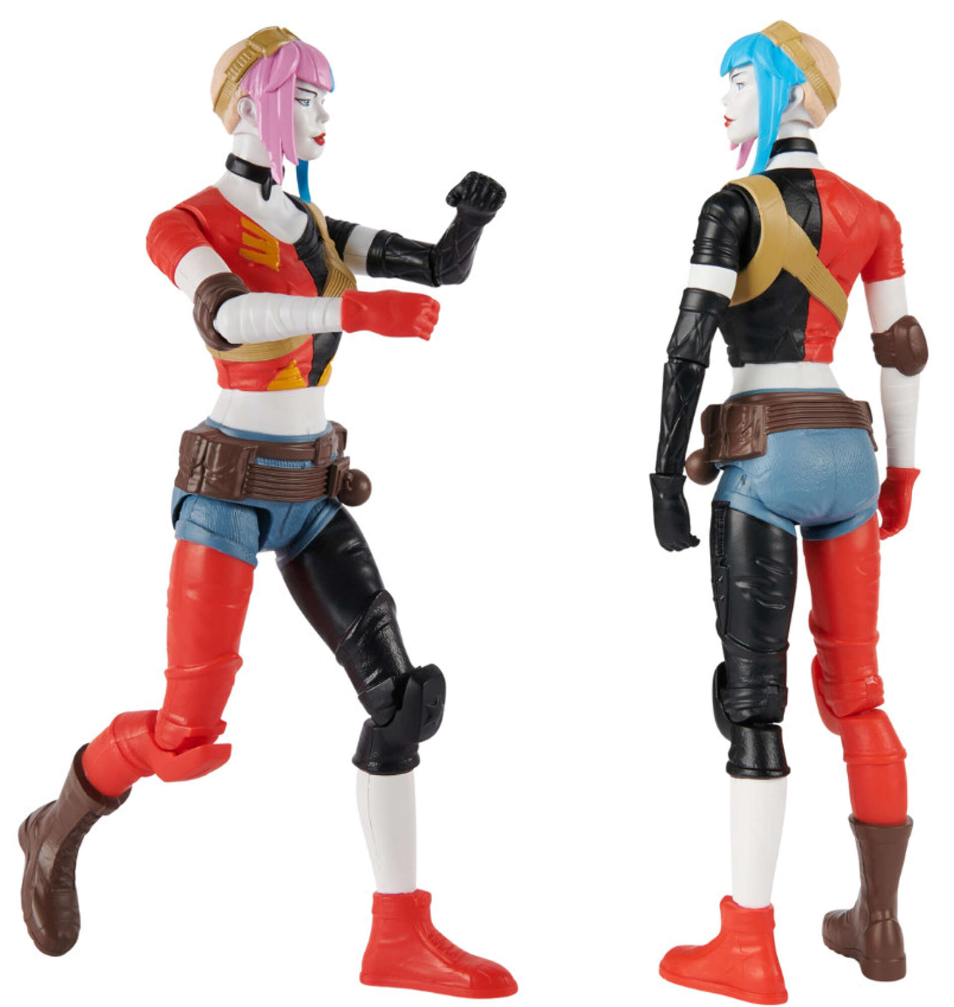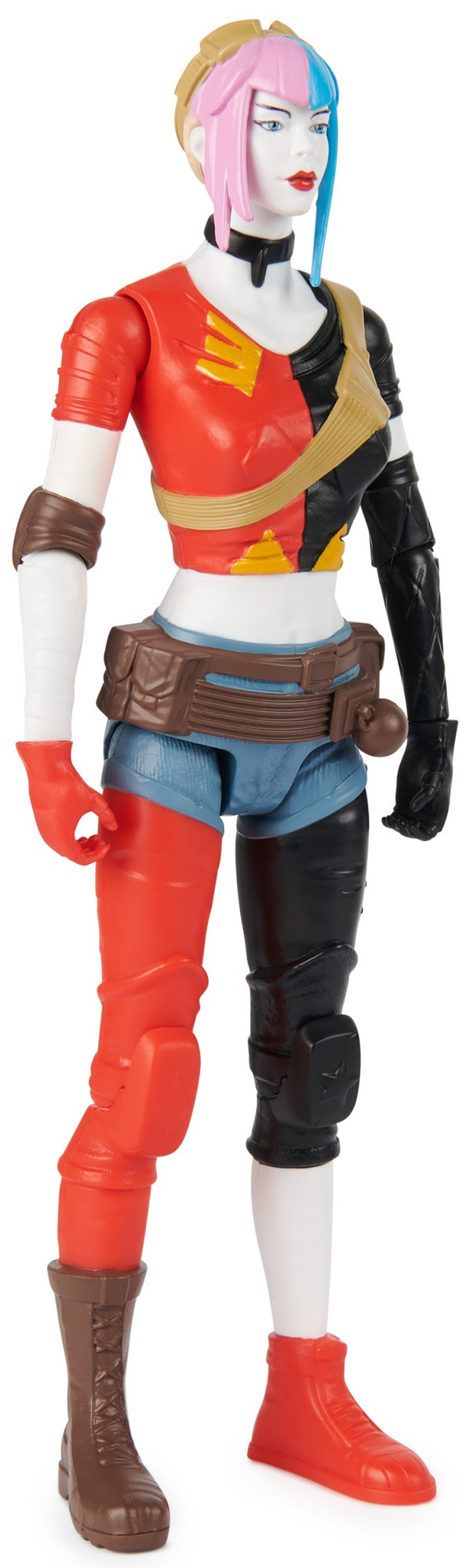 Figurka Harley Quinn ma około 30 cm wysokości i ubrana jest w krótki czarno-czerwony top, czarno czerwone spodnie oraz krótkie jasnoniebieskie spodenki.