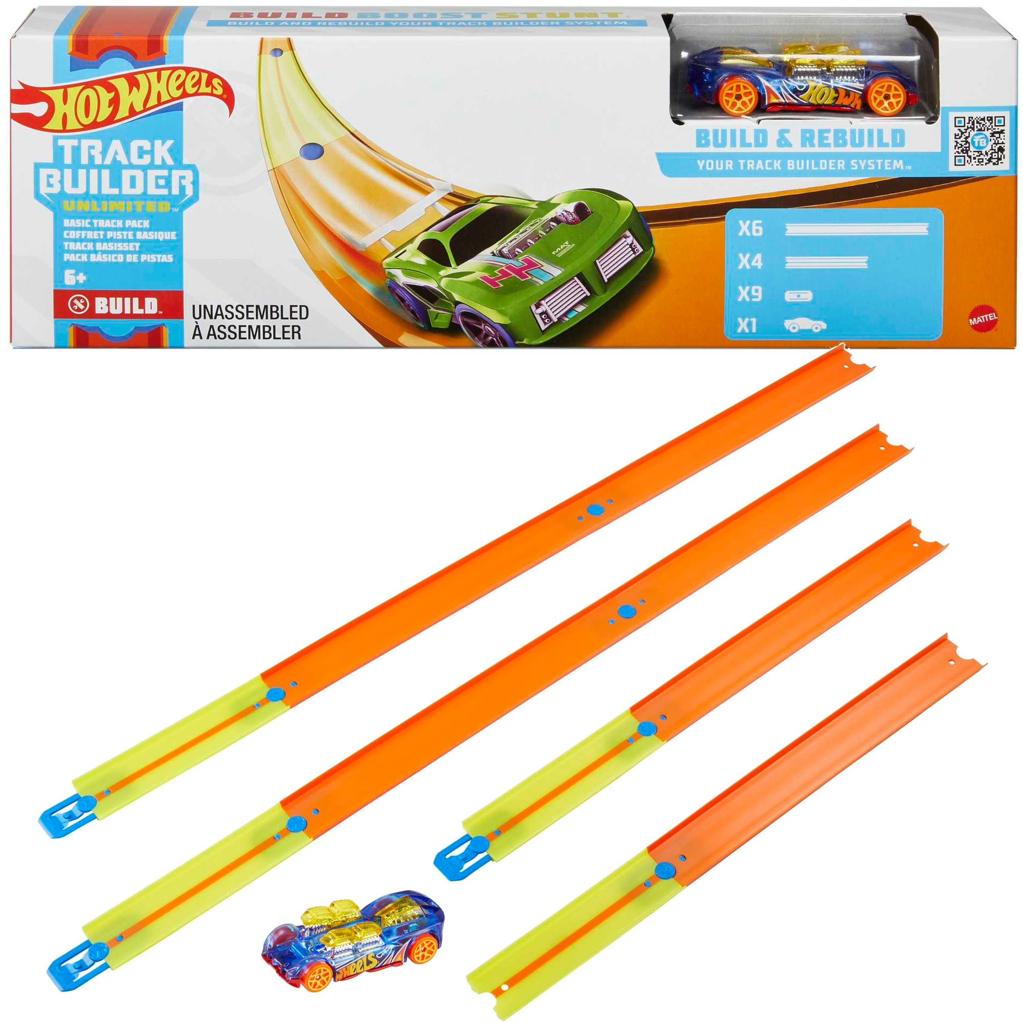 Tory Track Builder można układać na różne sposoby, tak aby samochodziki mogły pokonywać coraz to trudniejsze trasy. W zestawie znajduje się jeden pojazd Hot Wheels w skali 1:64.