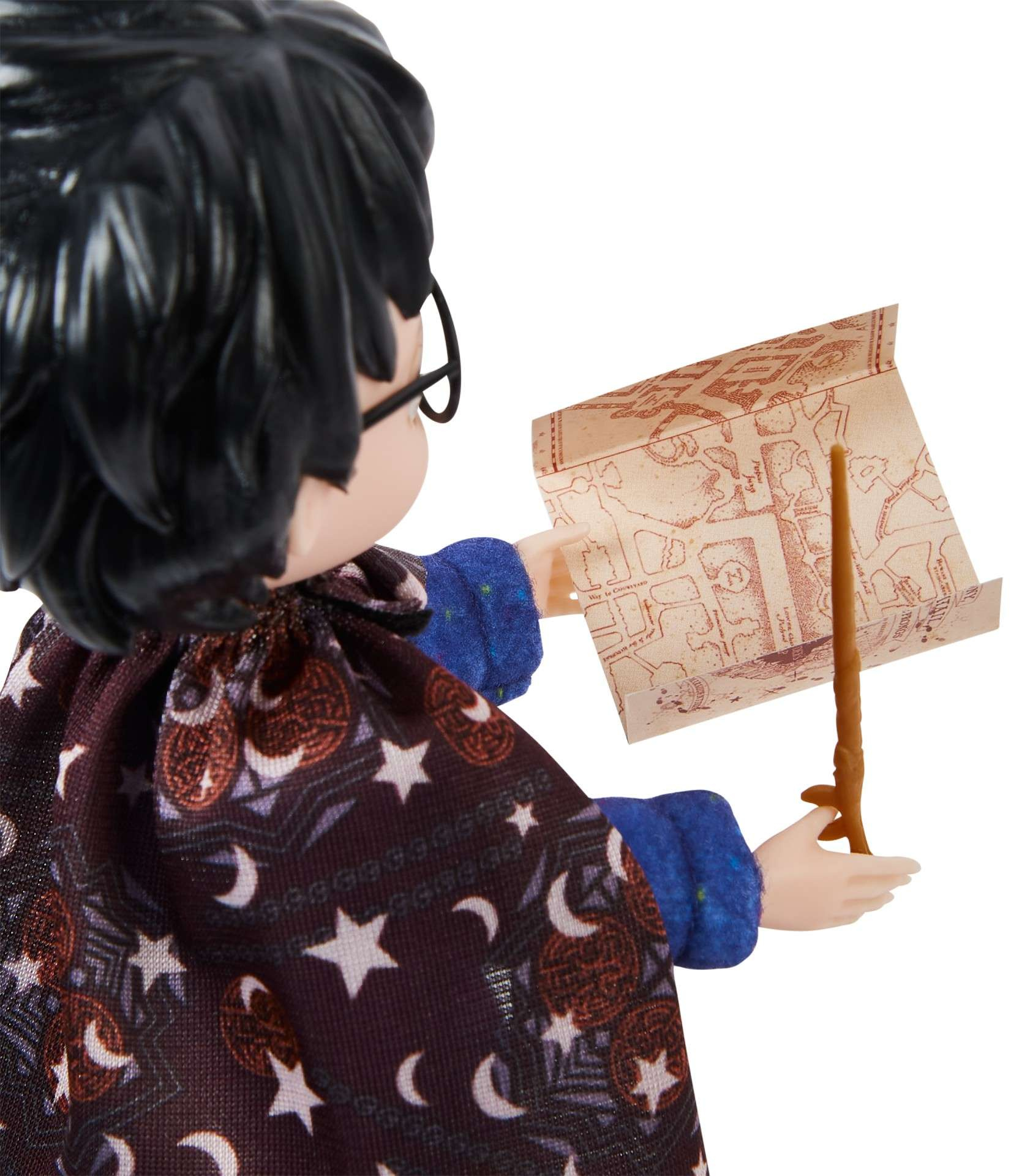 Harry Potter ma czarne, plastikowe włosy i zielone oczy. Ubrany jest w granatowy sweter z literką "H", brązowe spodnie oraz czarne buty. Dodatkowo w zestawie znajduje się peleryna niewidka i koszula w kratę. Lalka posiada wiele punktów artykulacji, dzięki czemu można ustawić ją w różnych pozach. Ma ok. 20 cm wysokości.