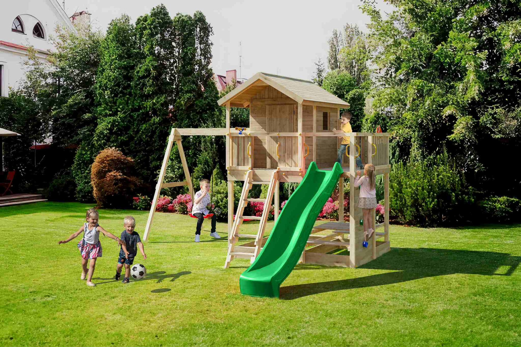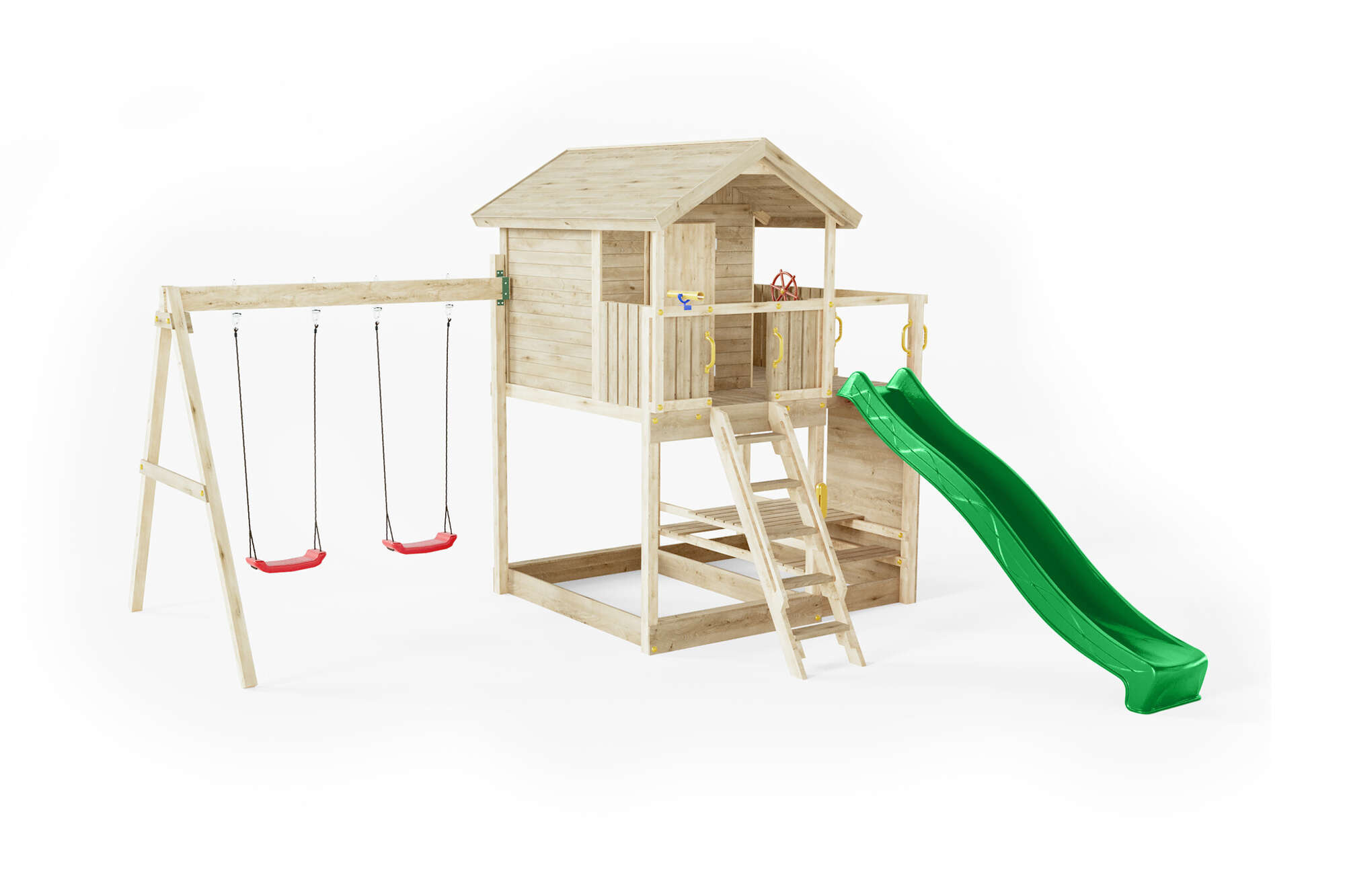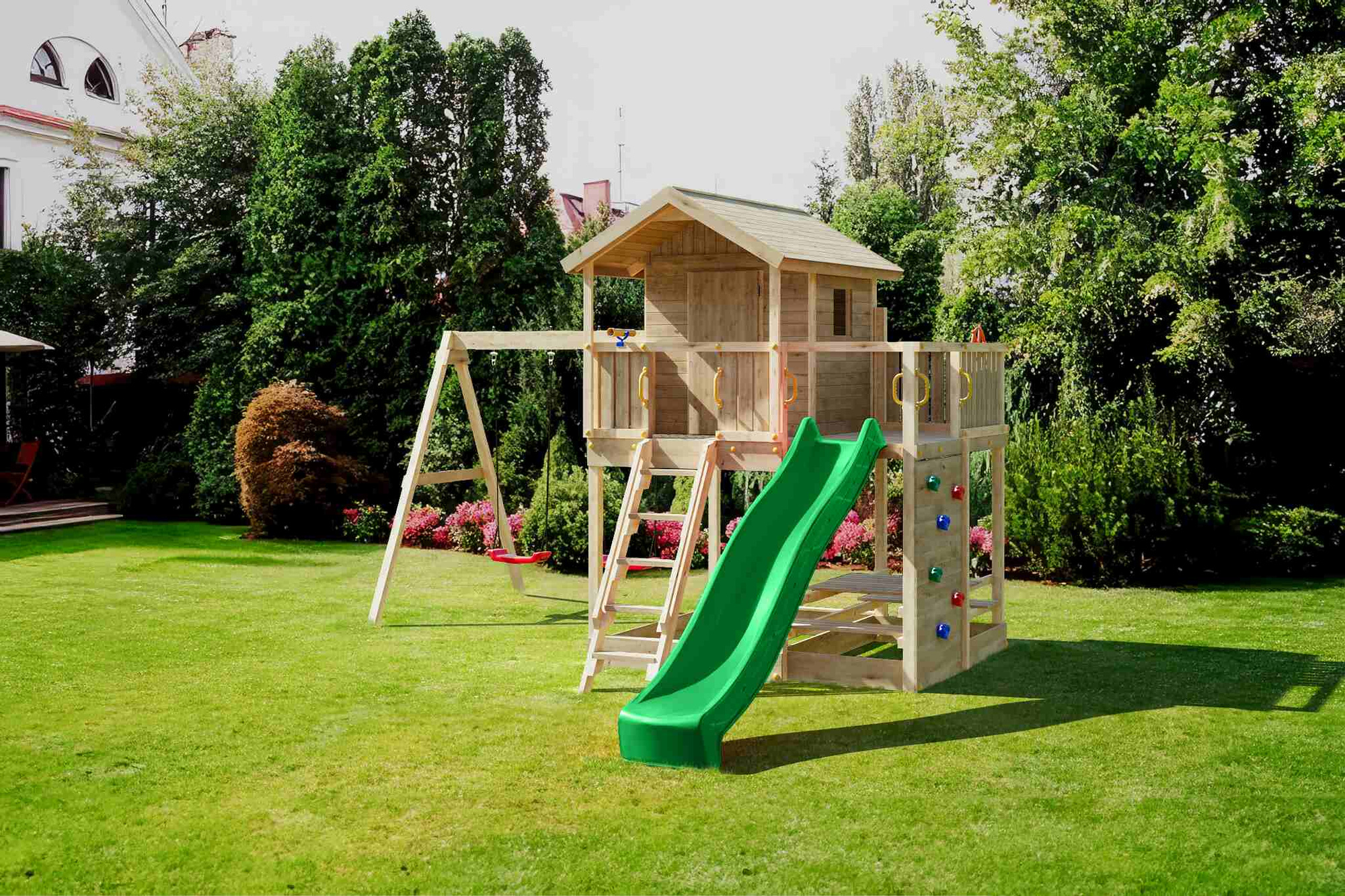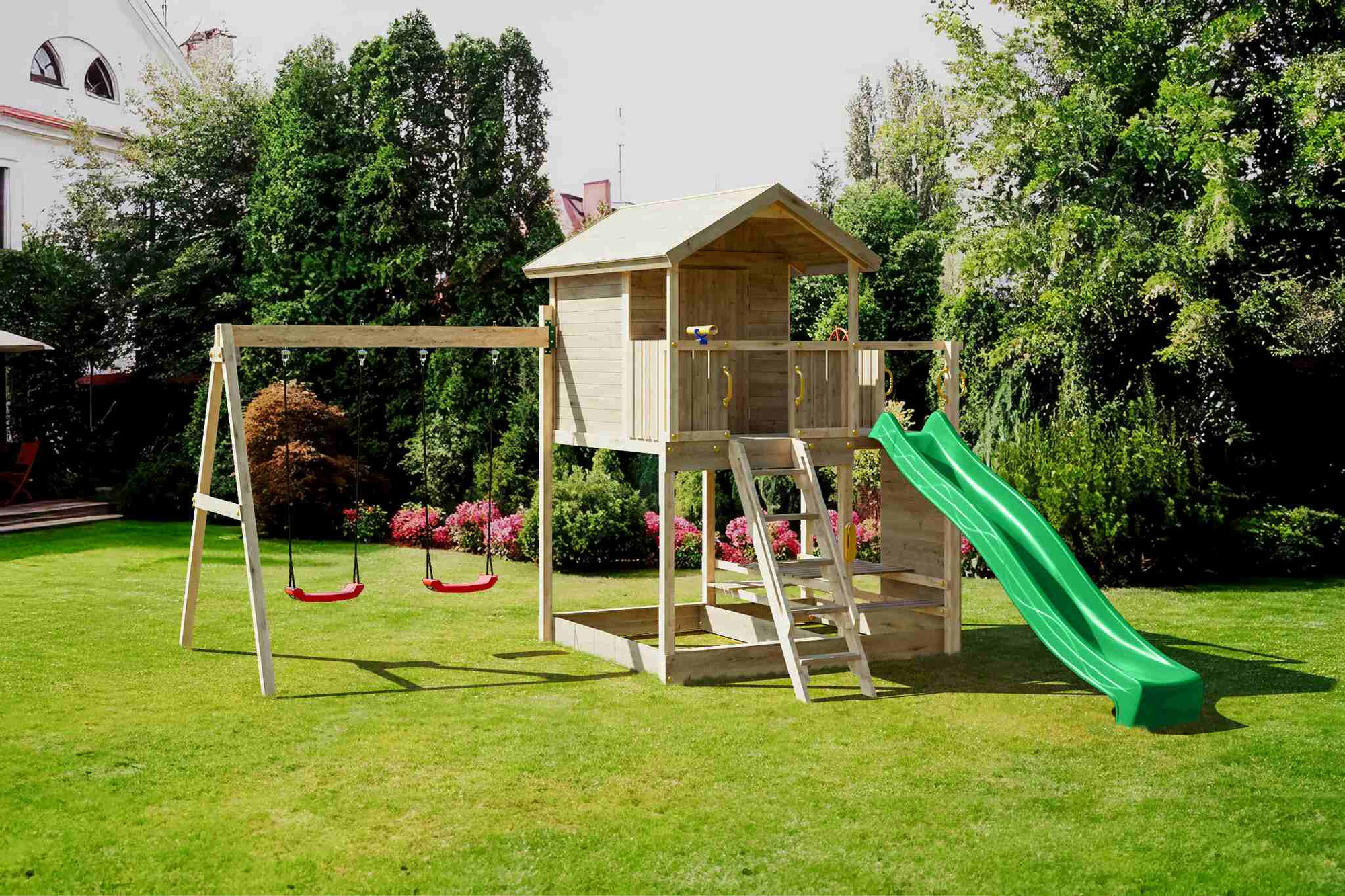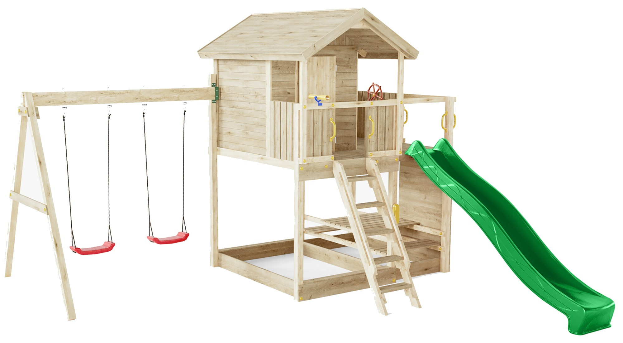 Plac zabaw składa się z drewnianego domku z daszkiem i drzwiami, 2 huśtawek, zjeżdżalni, ścianki wspinaczkowej, stołu piknikowego oraz schodków, co daje dzieciom miejsce i możliwości do wielogodzinnej zabawy na świeżym powietrzu. W zestawie znajdują się też akcesoria, takie jak: telefon, ster i teleskop.