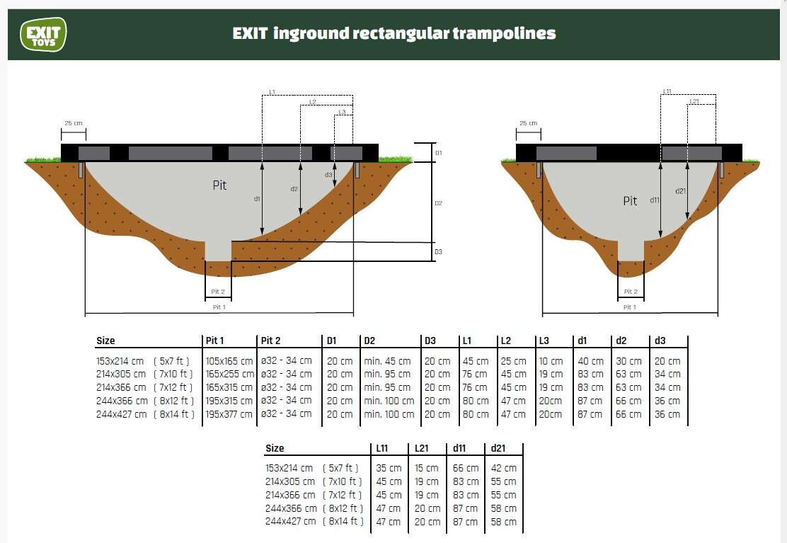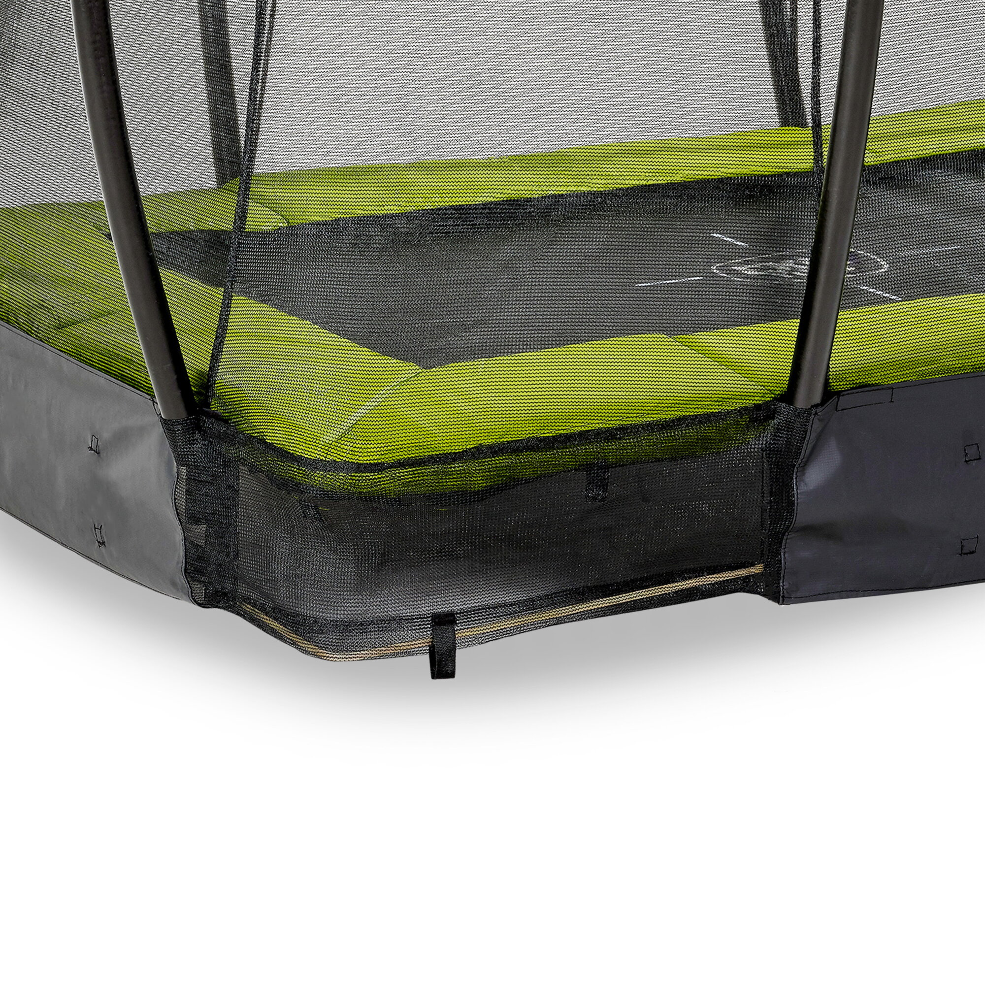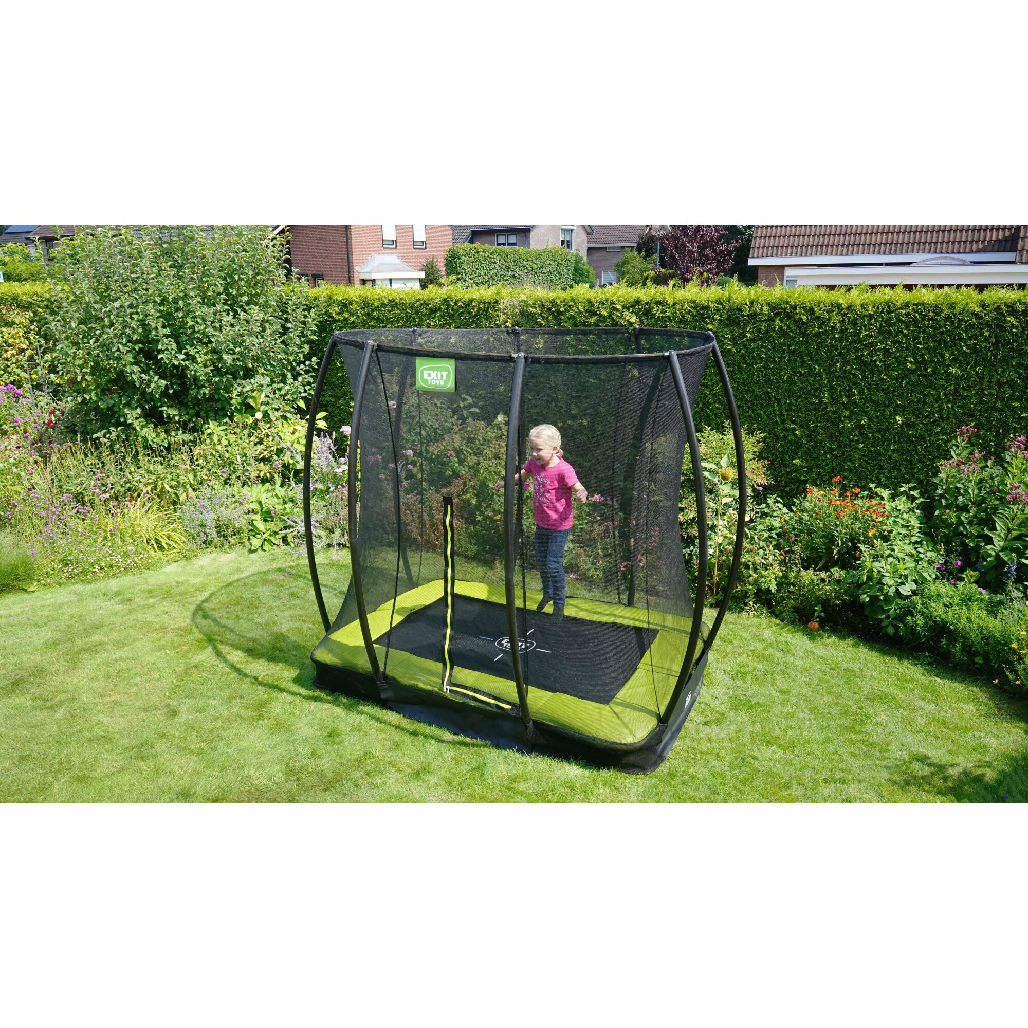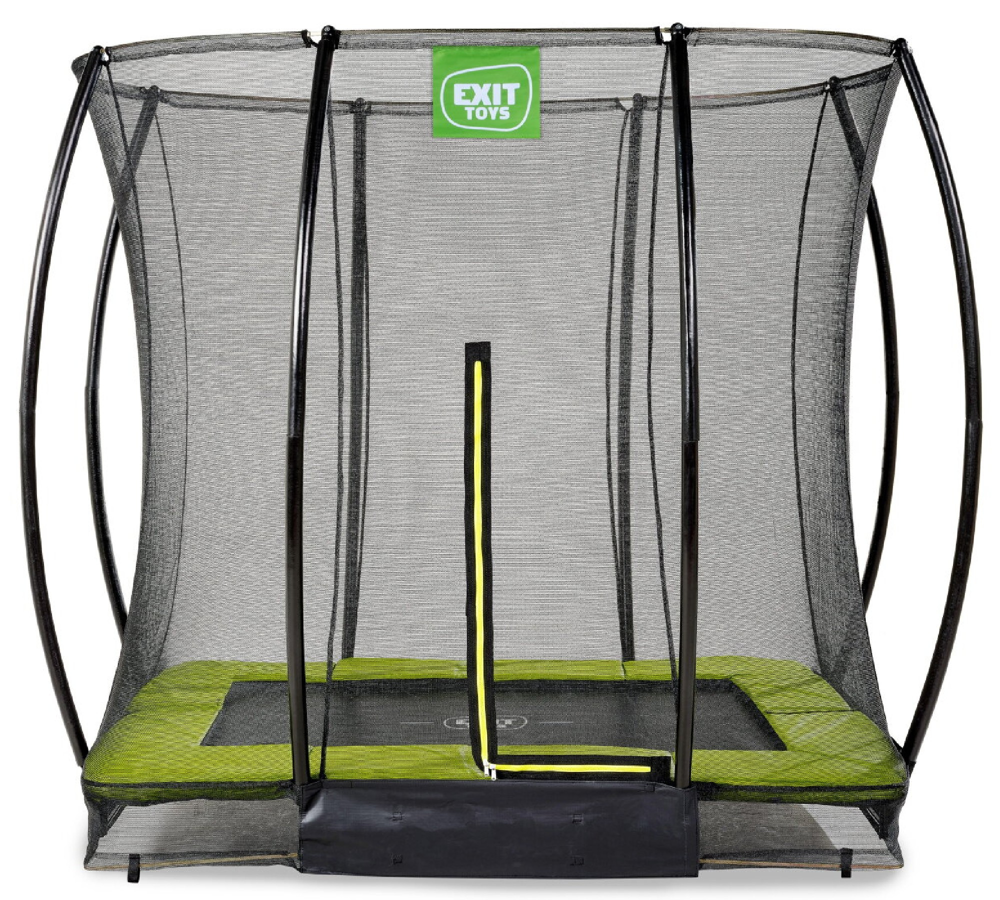 - Trampolina EXIT Sillhouette, o wymiarach 153x214 cm, to kompaktowa, prostokątna trampolina z zieloną krawędzią ochronną i siatką zabezpieczającą. Jej zamontowanie jest proste, wystarczy wykopać dół, w którym ma stanąć trampolina i umieścić ją tam.