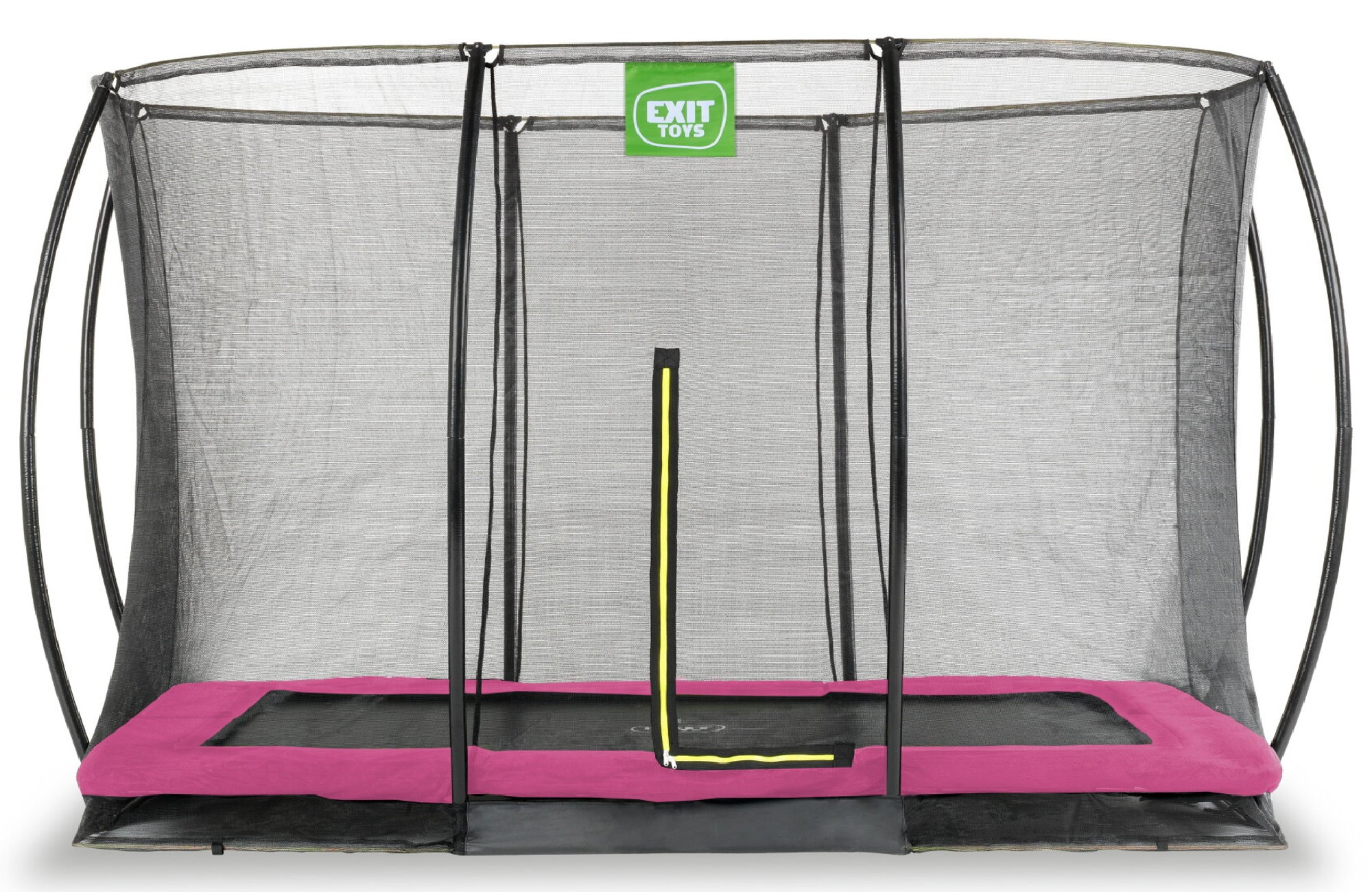 - Trampolina EXIT Sillhouette, o wymiarach 214x305 cm, to prostokątna trampolina z różową krawędzią ochronną i siatką zabezpieczającą. Jej zamontowanie jest proste, wystarczy wykopać dół, w którym ma stanąć trampolina i umieścić ją tam.