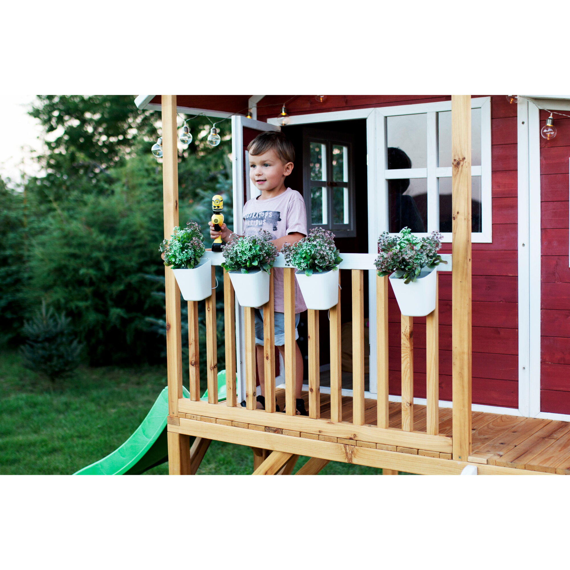 Drewniany domek ogrodowy Exit Loft 750 w kolorze czerwonym sprawi, że dzieci nie będą się nudzić. Domek ten stoi na wysokich nóżkach i ma długą, zieloną zjeżdżalnię oraz przybudówkę. Wyższa rama umożliwia dzieciom w każdym wieku zabawę w piaskownicy znajdującej się pod spodem. Posiada też schodki i taras z balustradą, co zwiększa jego funkcjonalność. Wstępnie zmontowane elementy zapewniają szybki montaż. Jego elegancki, skandynawski design z pewnością będzie dobrze się dobrze prezentować w ogrodzie!