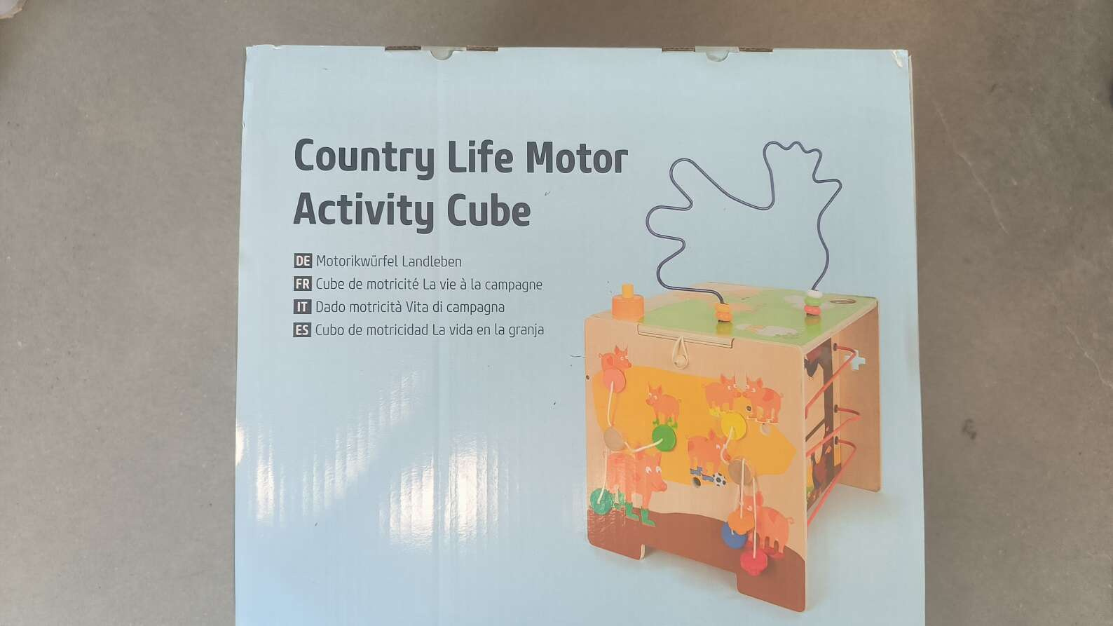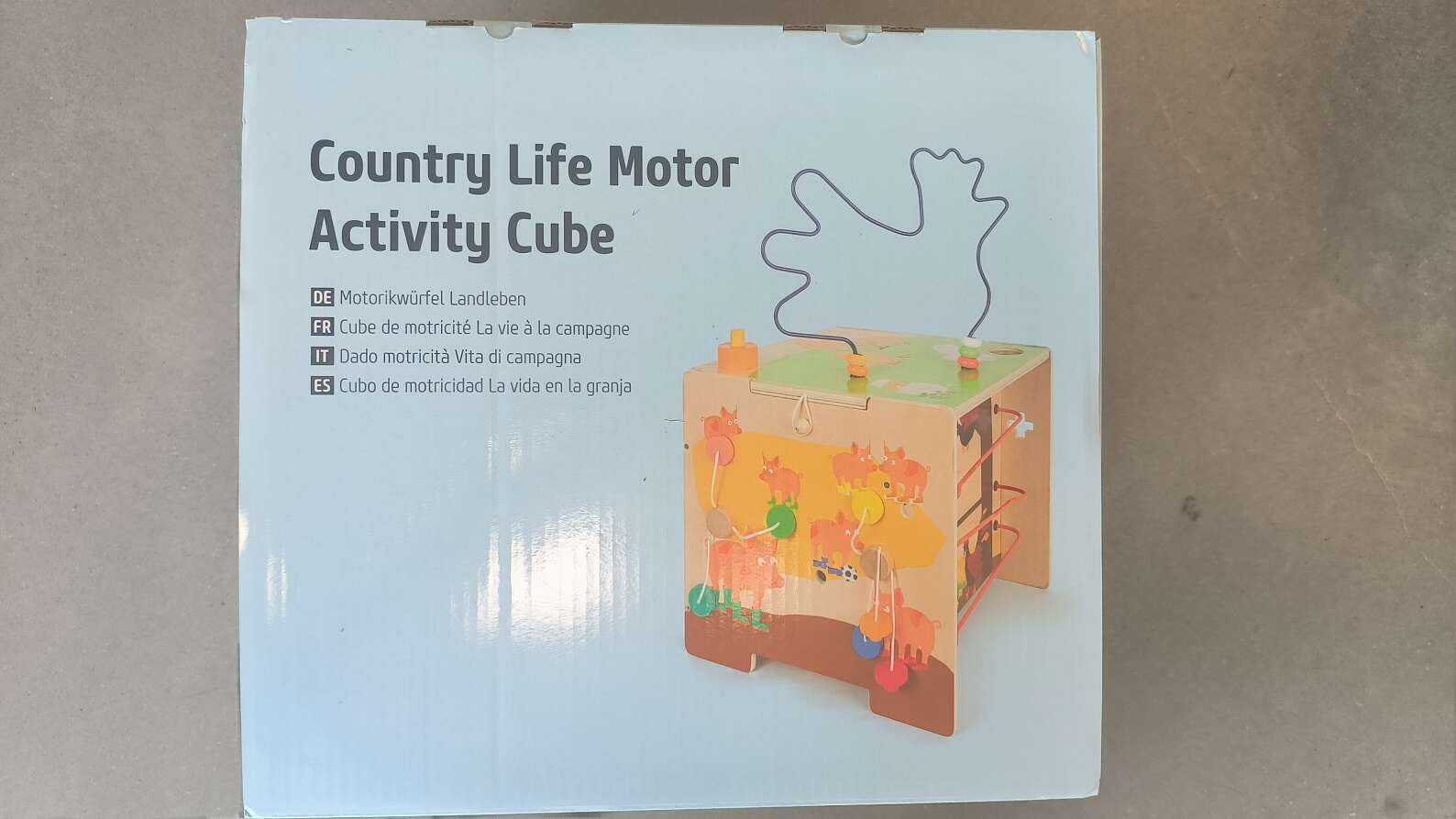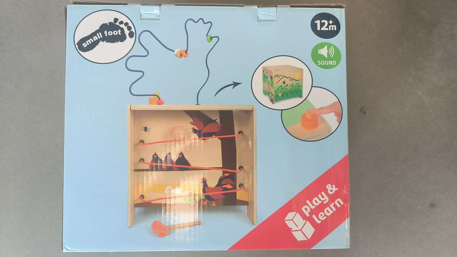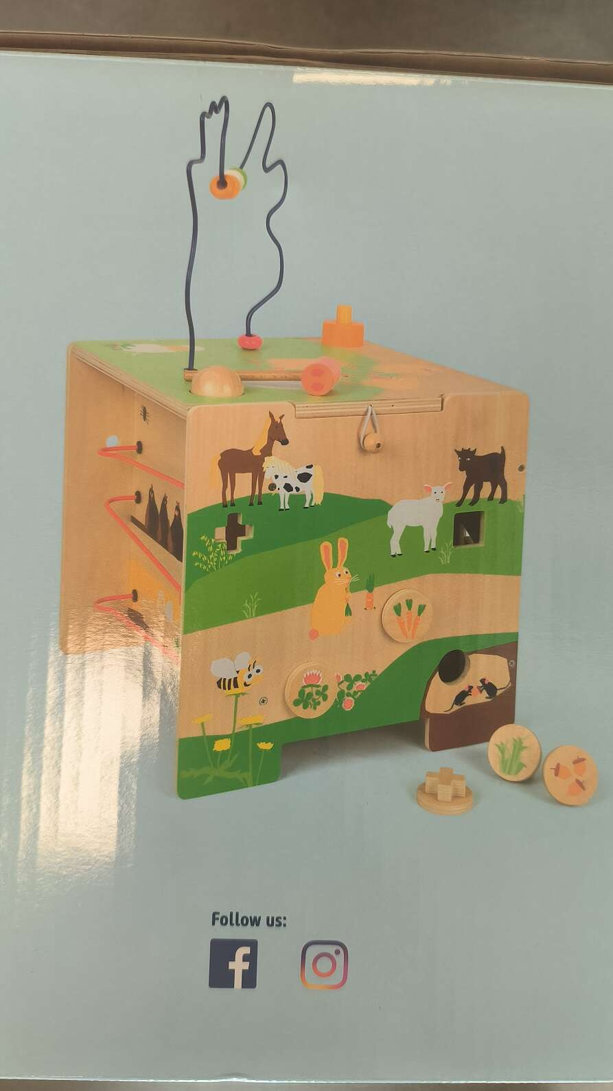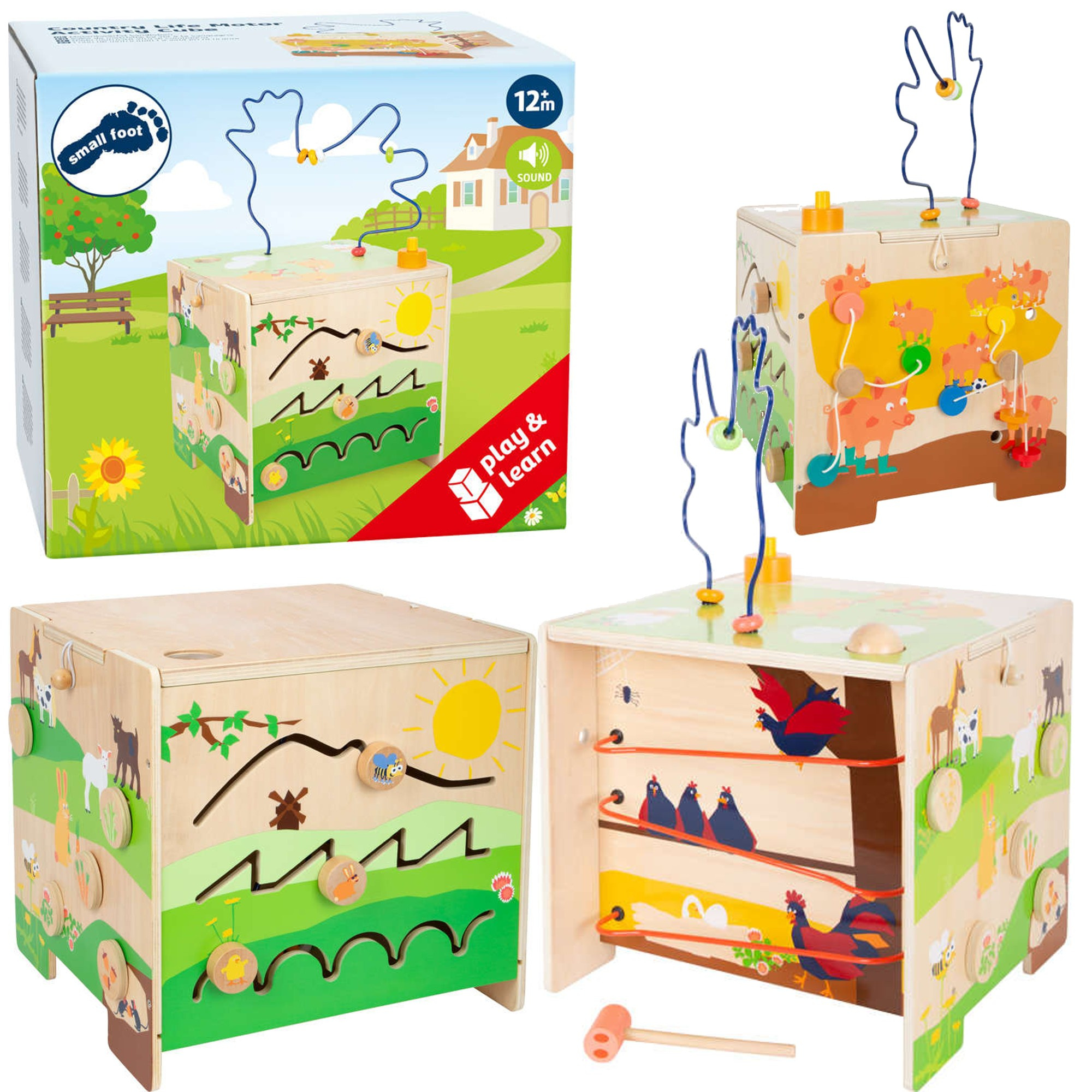 - Small Foot Kostka aktywności farma, ze ściankami na których znajdują się różne atrakcje, takie jak sorter, labirynt, przeplatanka. Zabawka uczy kolorów kształtów i poszerza podstawową wiedzę o zwierzętach w gospodarstwie.
