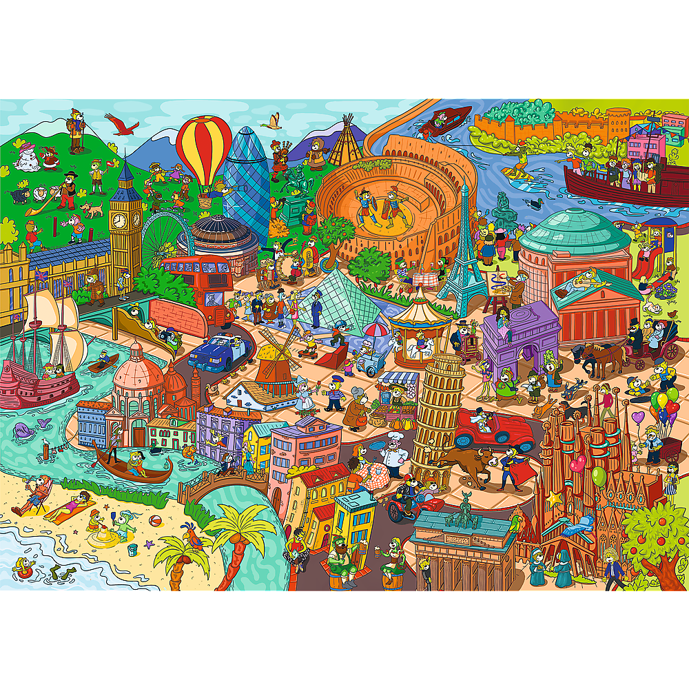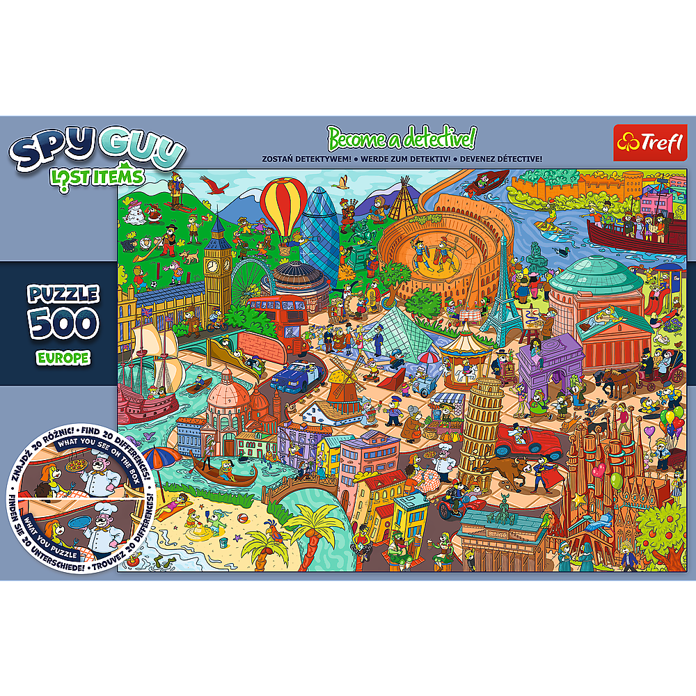 Puzzle Spy Guy Lost Items: Europe składają się z 500 elementów z niezwykle kolorowym nadrukiem przedstawiającym pełen akcji obrazek ze scenami odgrywającymi się w Europie.