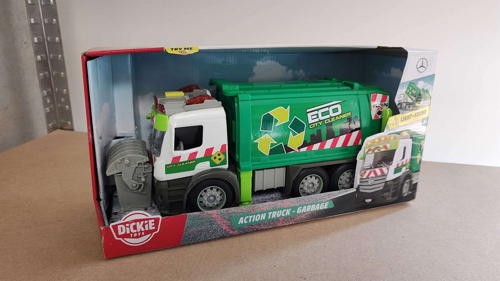Śmieciarka marki Mercedes posiada otwieraną klapę-wywrotkę, do której można wsypać zawartość szarego kosza na śmieci. Na dachu pojazdu znajduje się przycisk, który uruchamia efekty świetlne; migotanie świateł pojazdu oraz dźwiękowe; odgłosy prawdziwego pojazdu.