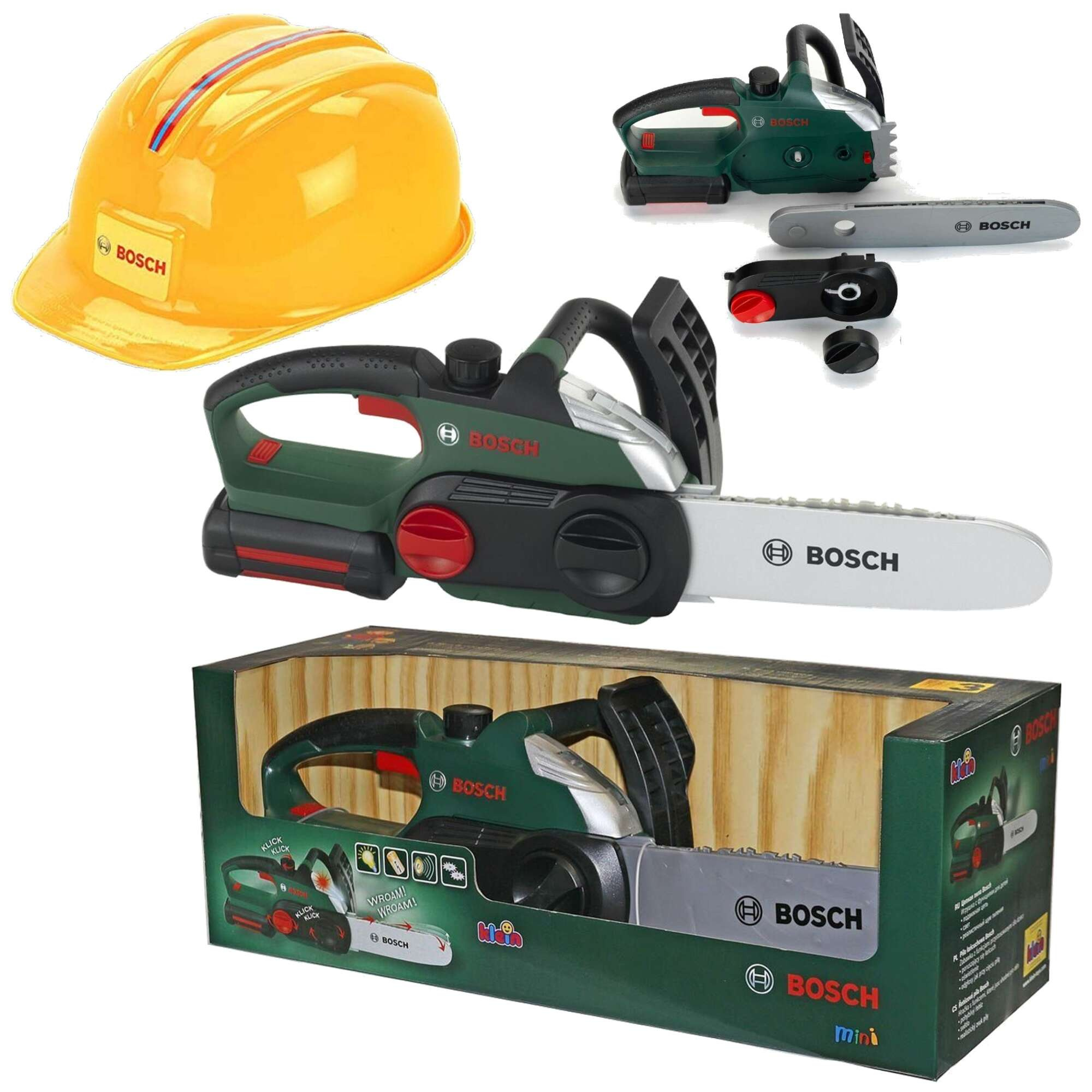 Zestaw Bosch bezprzewodowa Piła z ruchomym łańcuchem Bosch II z dźwiękiem i światłem dla dzieci + żółty kask