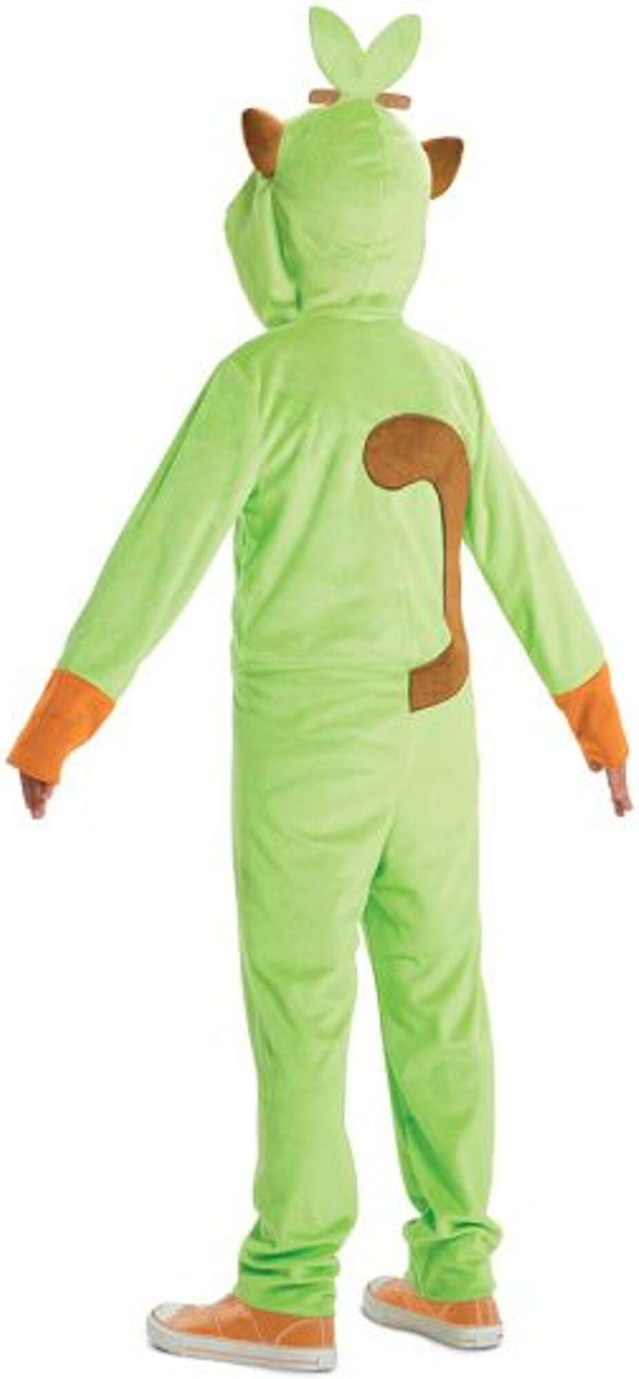 Zawiera zielony kostium z kapturem, dzięki czemu dziecko może upodobnić się do liściastego Pokemona - Grookey'a.
