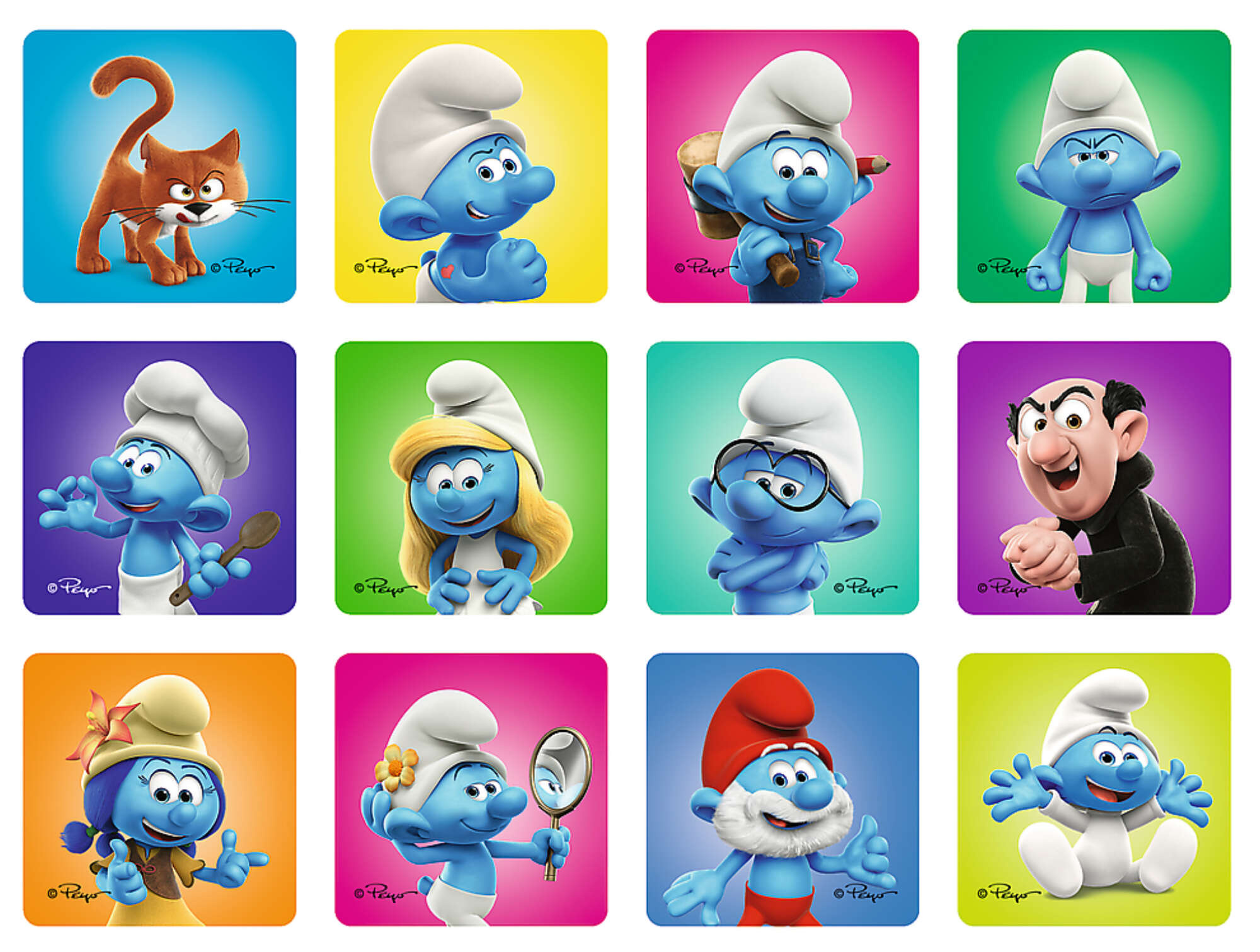 Zestaw zawiera ilustracje przedstawiające ulubione postacie z magicznego świata Smerfów, takich jak Papa Smerf, Smerfetka czy Sasetka!