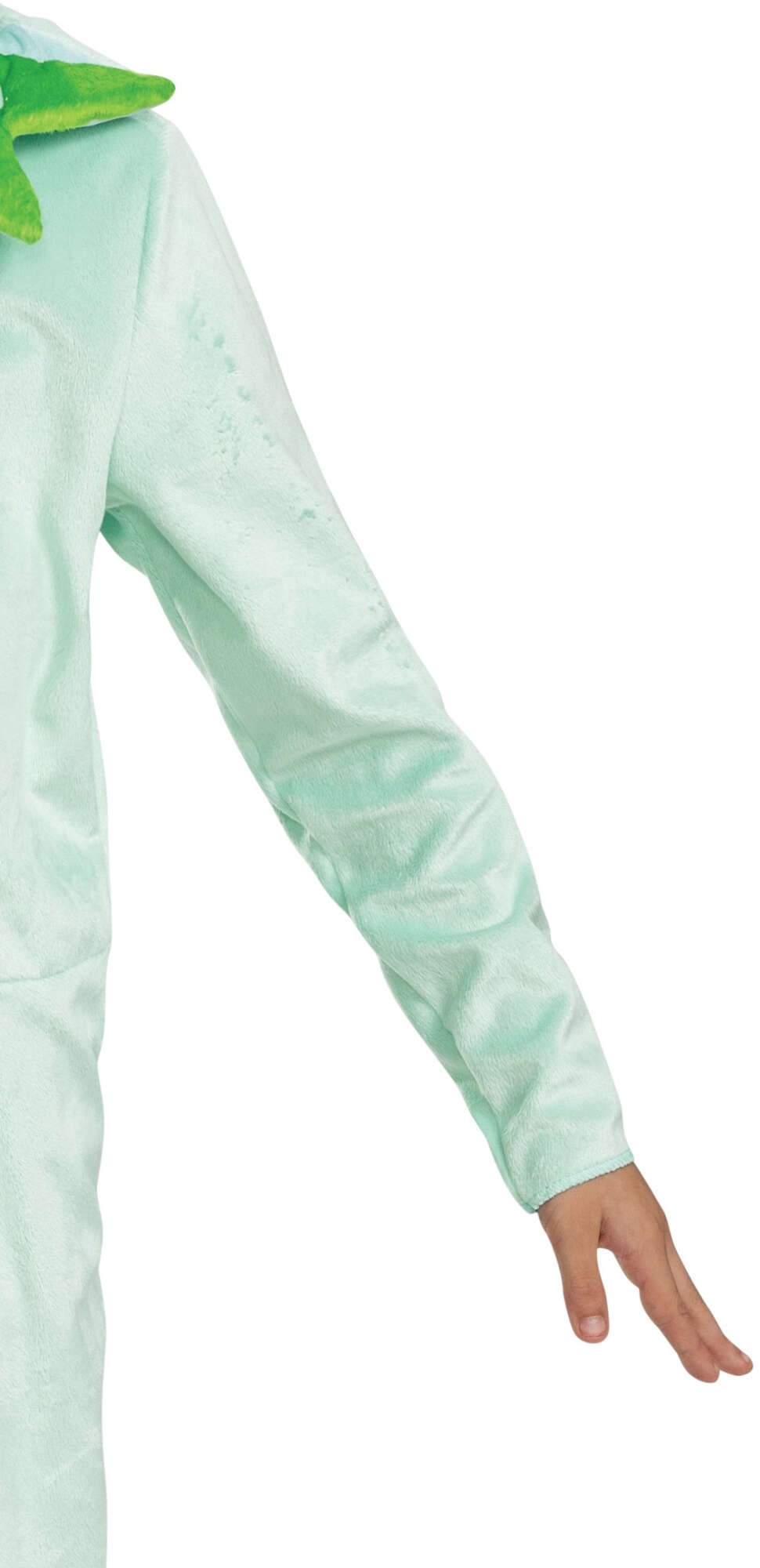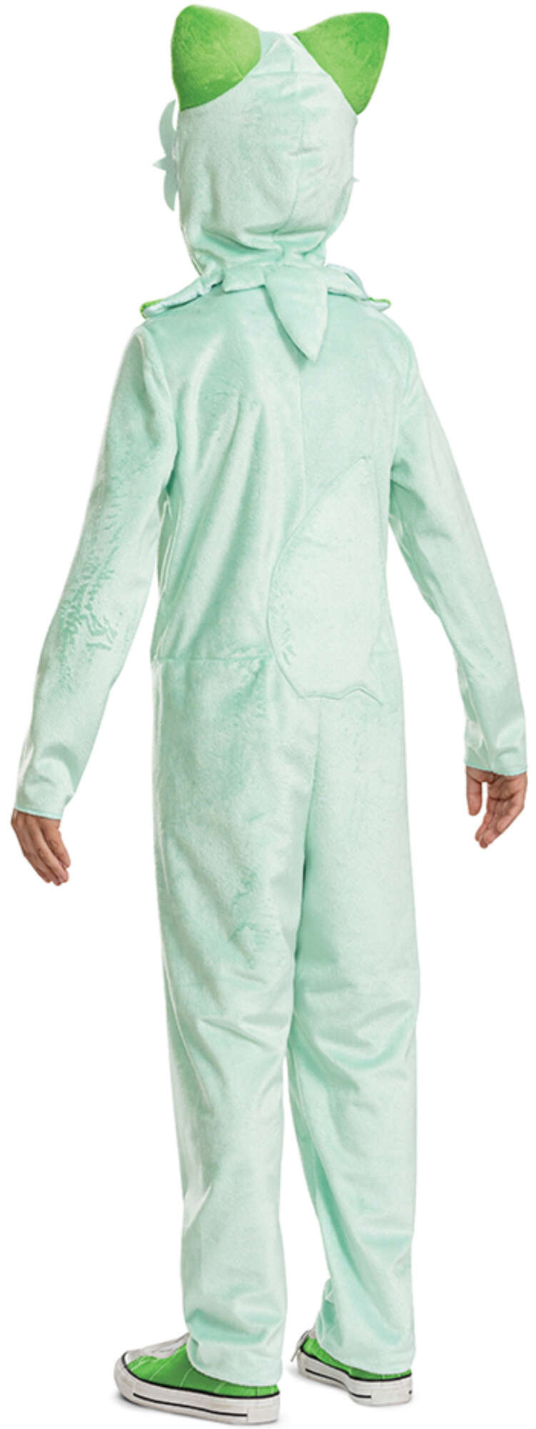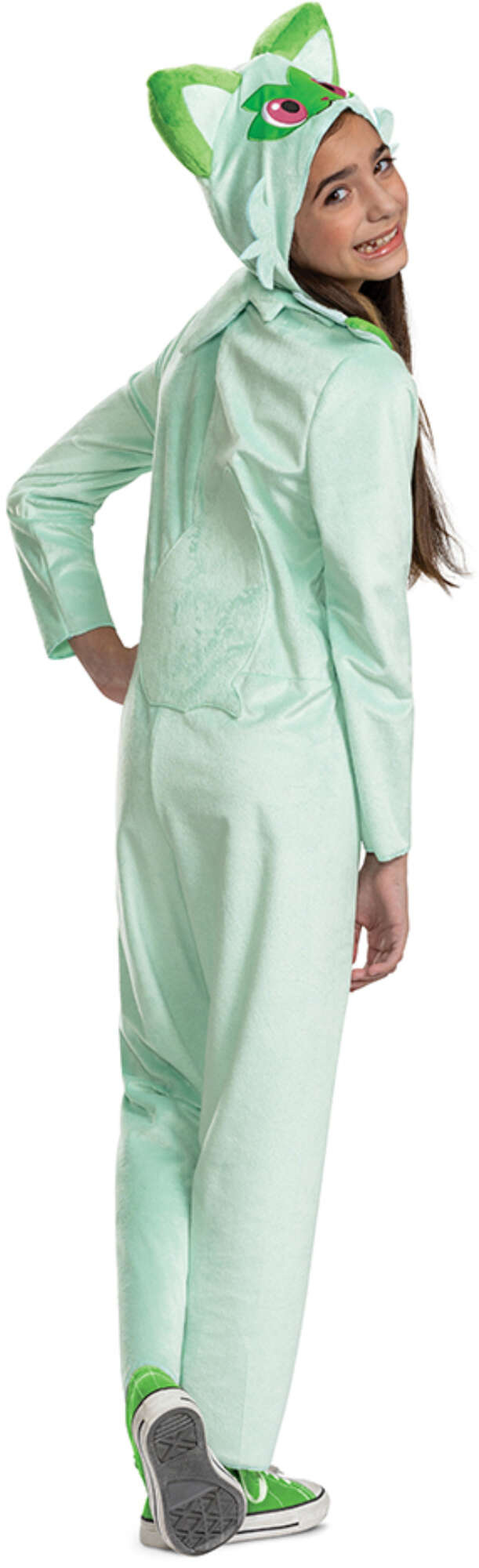 Zawiera zielony kostium z kapturem, dzięki czemu dziecko może upodobnić się do liściastego Pokemona - Sprigatito.