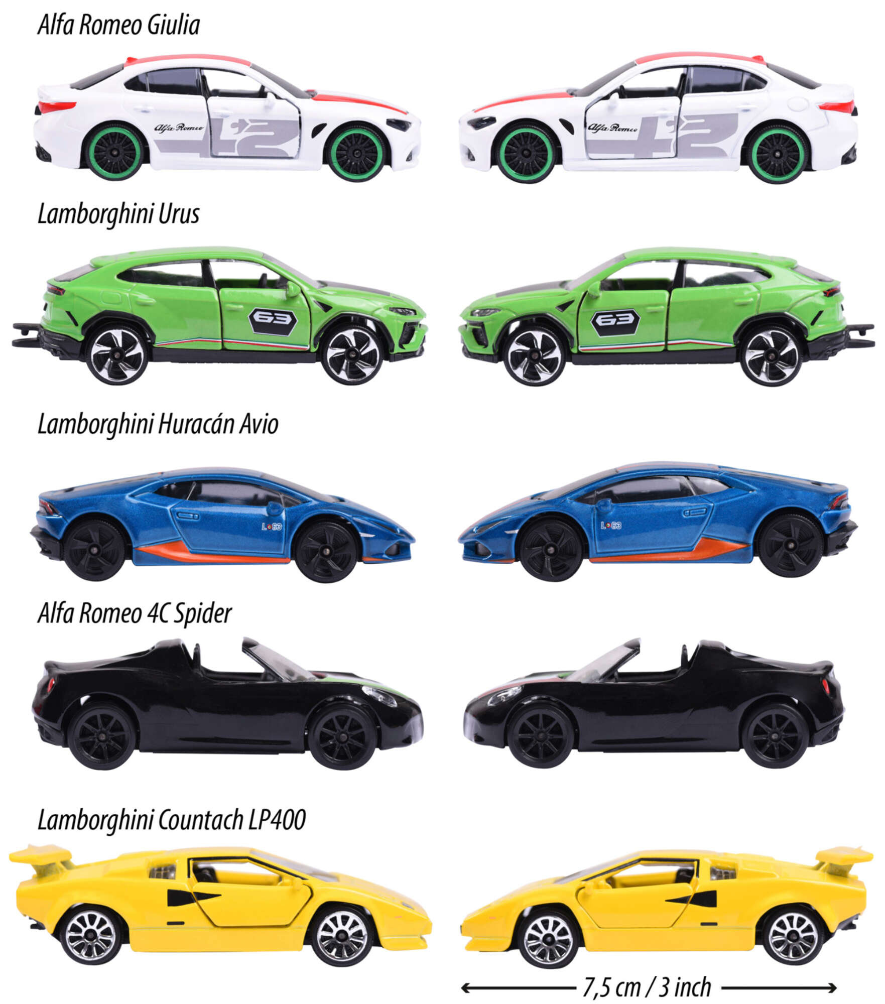 Auta mają długość ok 7-7,5 cm. Niektóre mają otwierane drzwi lub maskę.