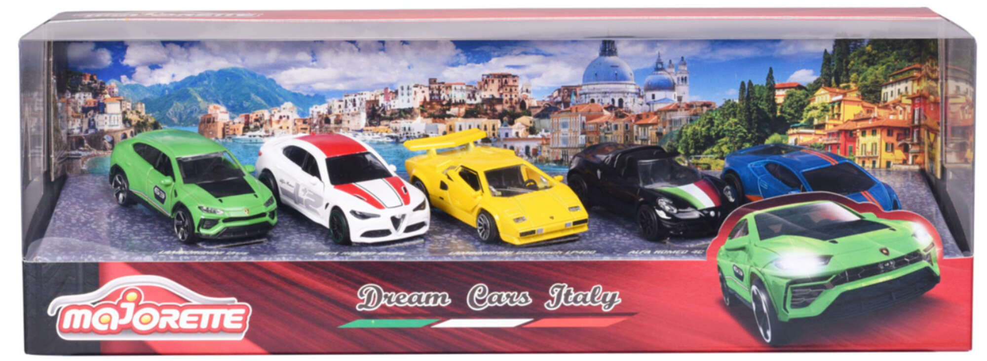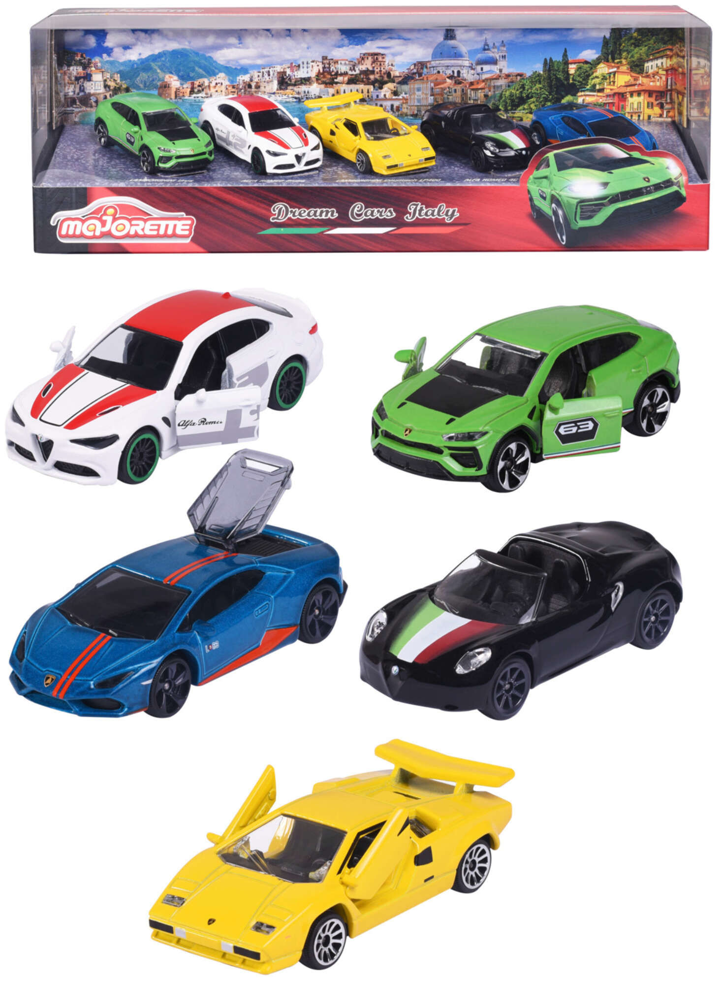 Zestaw zawiera 5 samochodów z serii Dream Cars Italy.