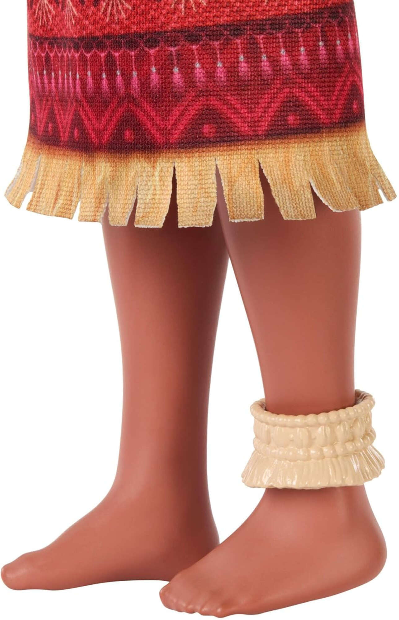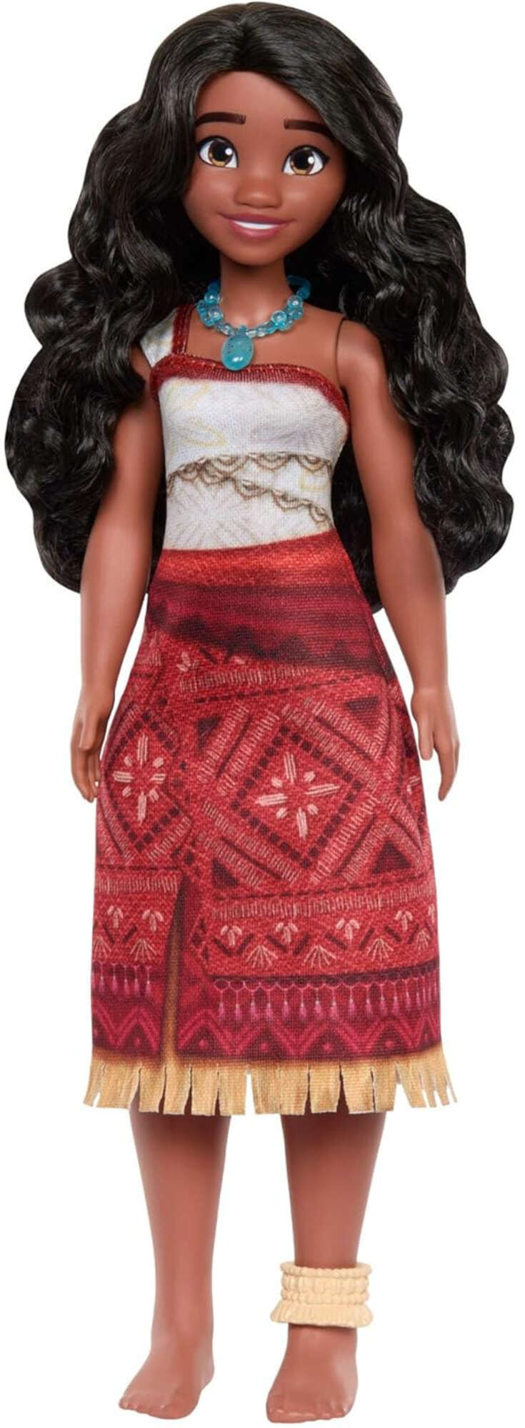 - Lalka Vaiana od Mattel zachwyca wiernym odwzorowaniem filmowego wyglądu bohaterki. Ma ciemnobrązowe, długie i lekko falowane włosy, które można stylizować. Jej strój składa się z jasnego topu z białymi wzorami oraz czerwonej spódnicy z tropikalnym nadruki