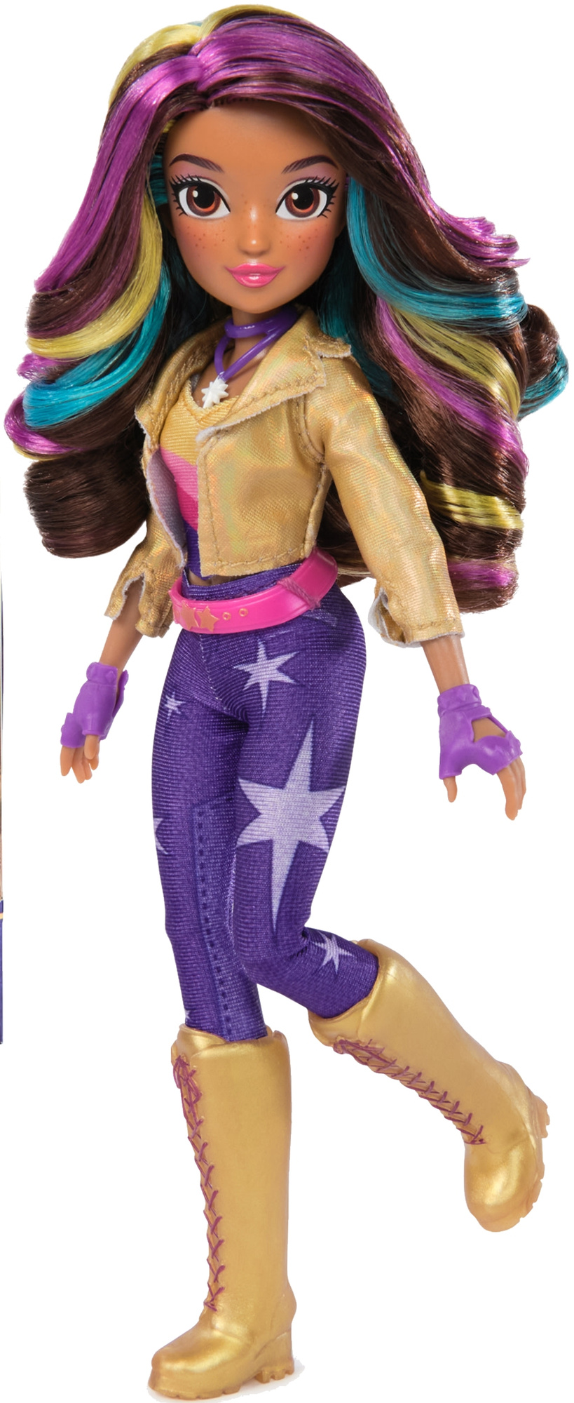 Sophia ma długie, ciemne włosy z różowymi, niebieskimi i blond pasemkami, które podkreślają jej magiczny styl. Ubrana jest w tęczowy top, złotą metaliczną kurtkę oraz jeździeckie spodnie z unikalnymi wzorami, a jej look dopełniają sznurowane buty i akcesoria.