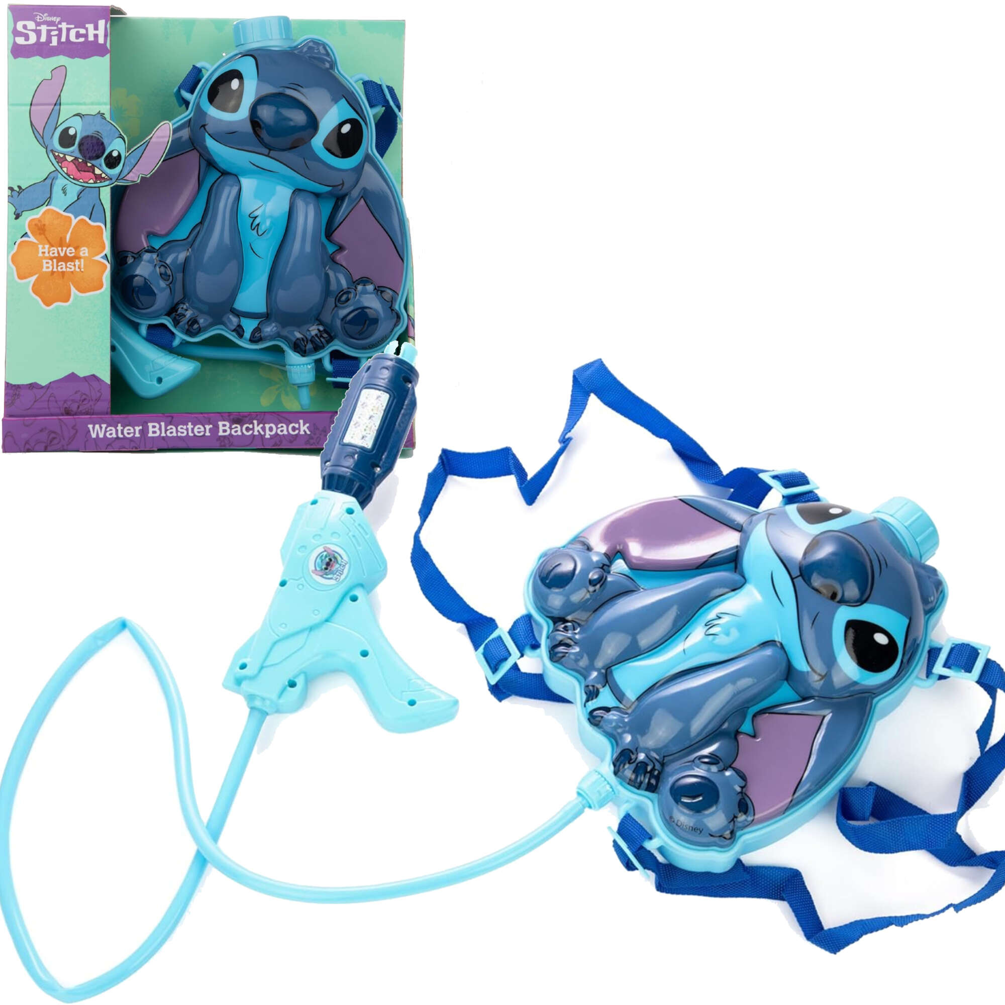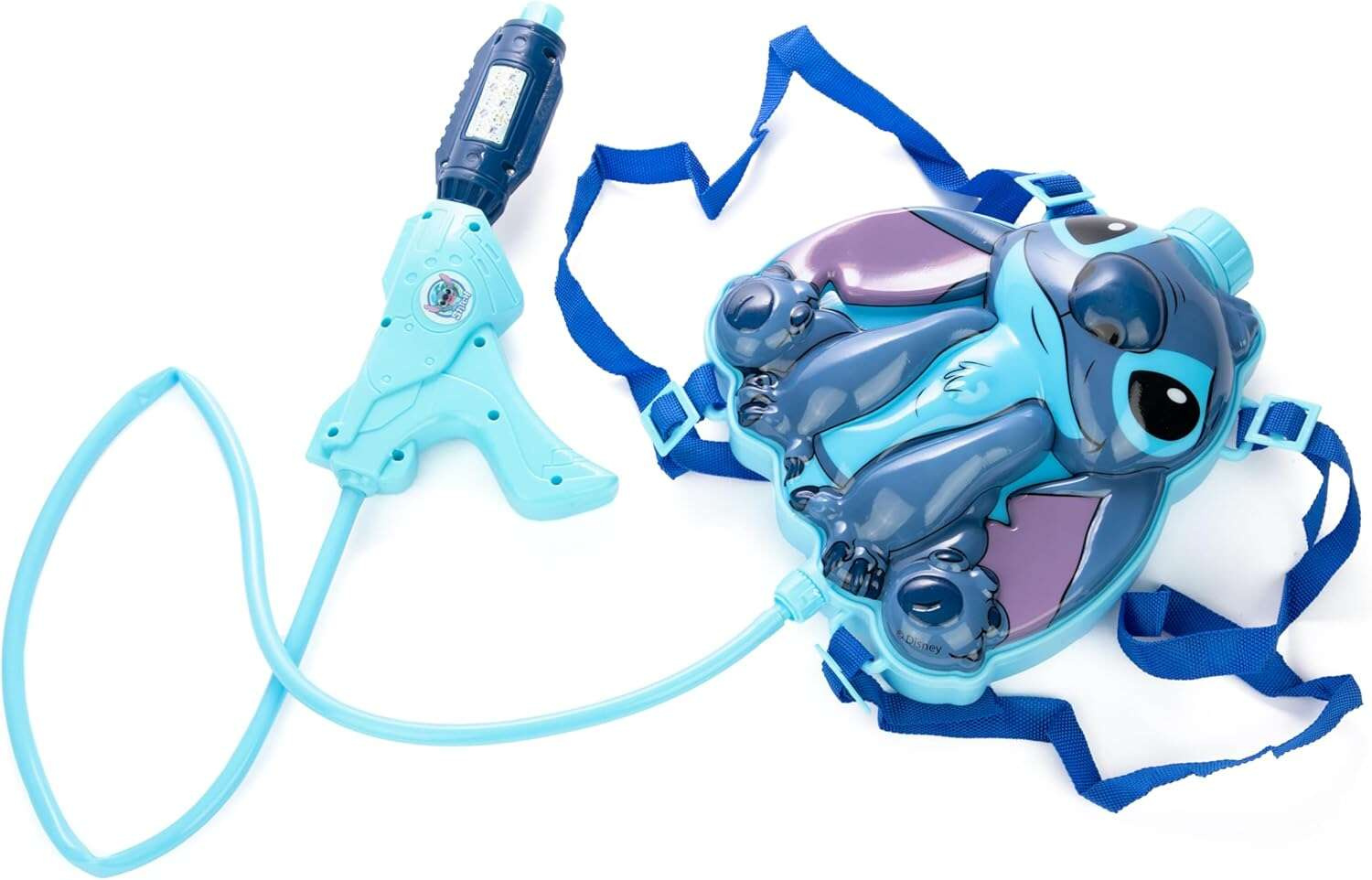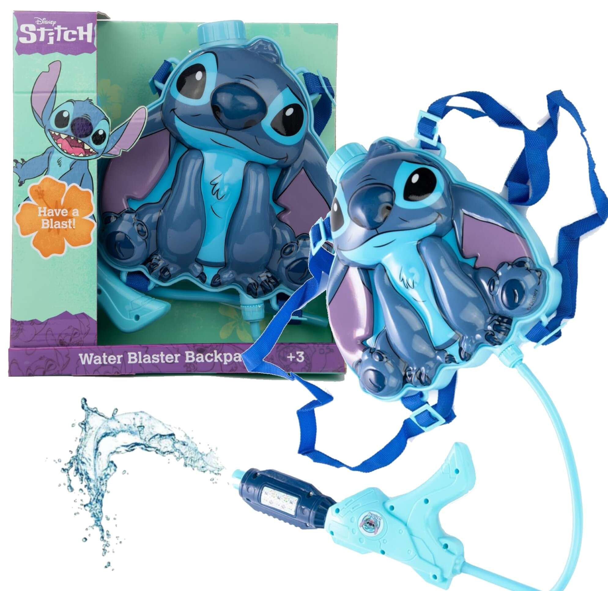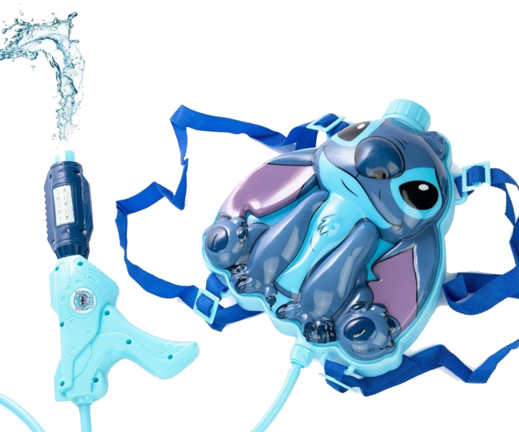 Ten niezwykły zestaw składa się ze zbiornika na wodę w kształcie bohatera bajki – sympatycznego Stitcha, oraz ręcznej psikawki połączonej elastyczną rurką. Zbiorniczek posiada regulowane szelki, dzięki czemu dziecko może nosić go jak plecak. U góry zbiornika znajduje się zamykany otwór do wlewania wody, a psikawkę obsługuje się na zasadzie pompy.