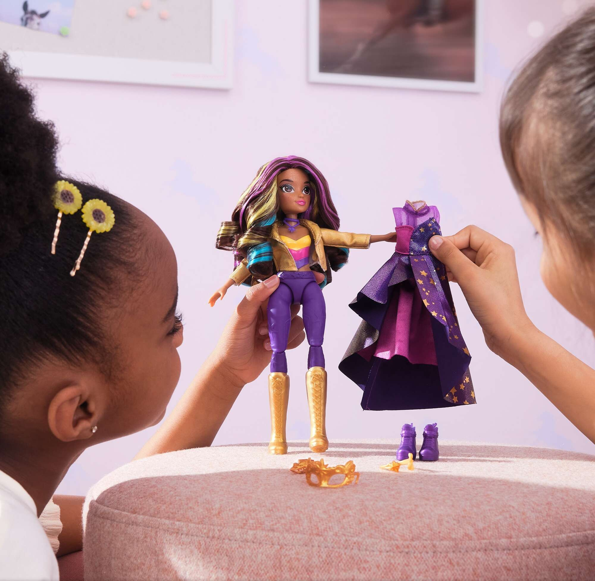 - Dodatkowa suknia balowa: W zestawie znajduje się efektowna, dwuwarstwowa sukienka w odcieniach fioletu i różu, ozdobiona gwiazdkami, idealna na wieczorne przyjęcia w Akademii Jednorożców.