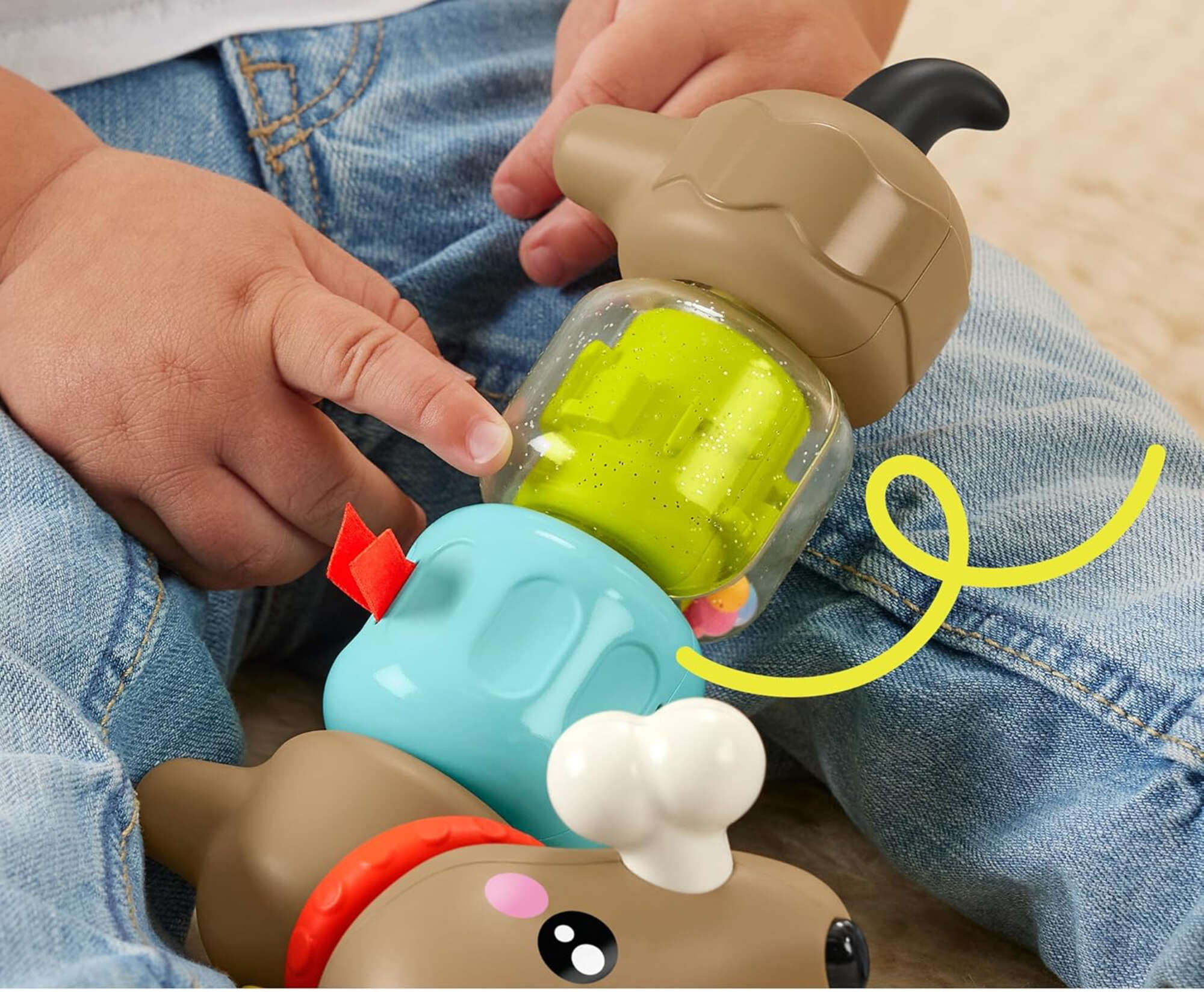 Piesek ma brązowy korpus z segmentową budową, a jego głowa przypomina uroczego szczeniaka z czarnym nosem, różowymi policzkami i dużymi, filcowymi uszami. Poszczególne części ciała wyróżniają się różnymi kolorami i fakturami – niebieski moduł ma wypustki do dotykania, przezroczysty segment zawiera grzechotkę z kolorowymi koralikami, a czarny ogonek wydaje dźwięk klikania podczas obracania.