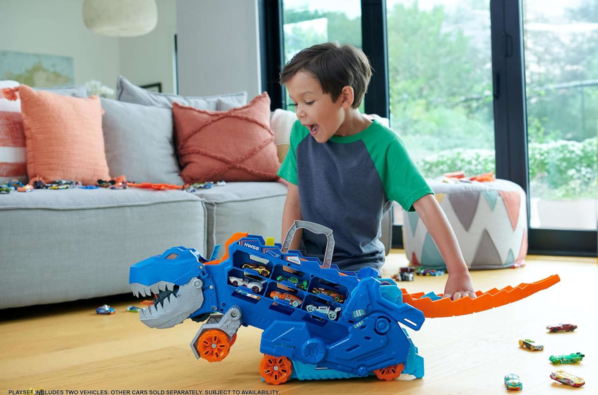 Na grzbiecie przekształconego T-Rexa znajduje się tor wyścigowy, na którym dzieci mogą rywalizować dołączonymi samochodzikami Hot Wheels. -