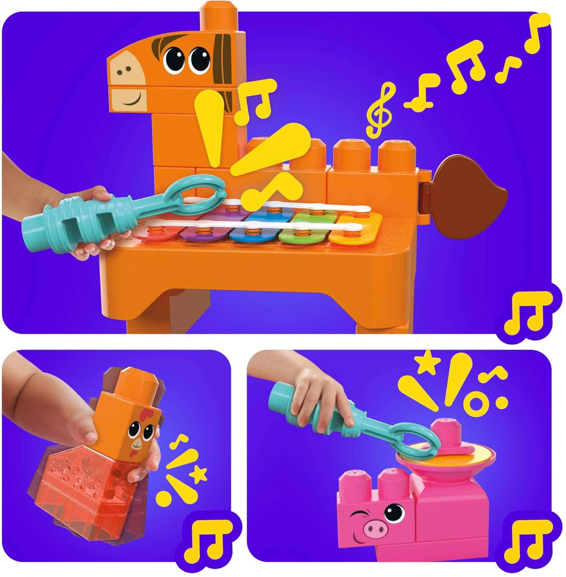- 8 muzykalnych zwierzątek do zbudowania: Każde zwierzątko ma inną funkcję dźwiękową – konik z ksylofonem, krówka z bębenkiem, świnka z dzwoniącym talerzem i inne!