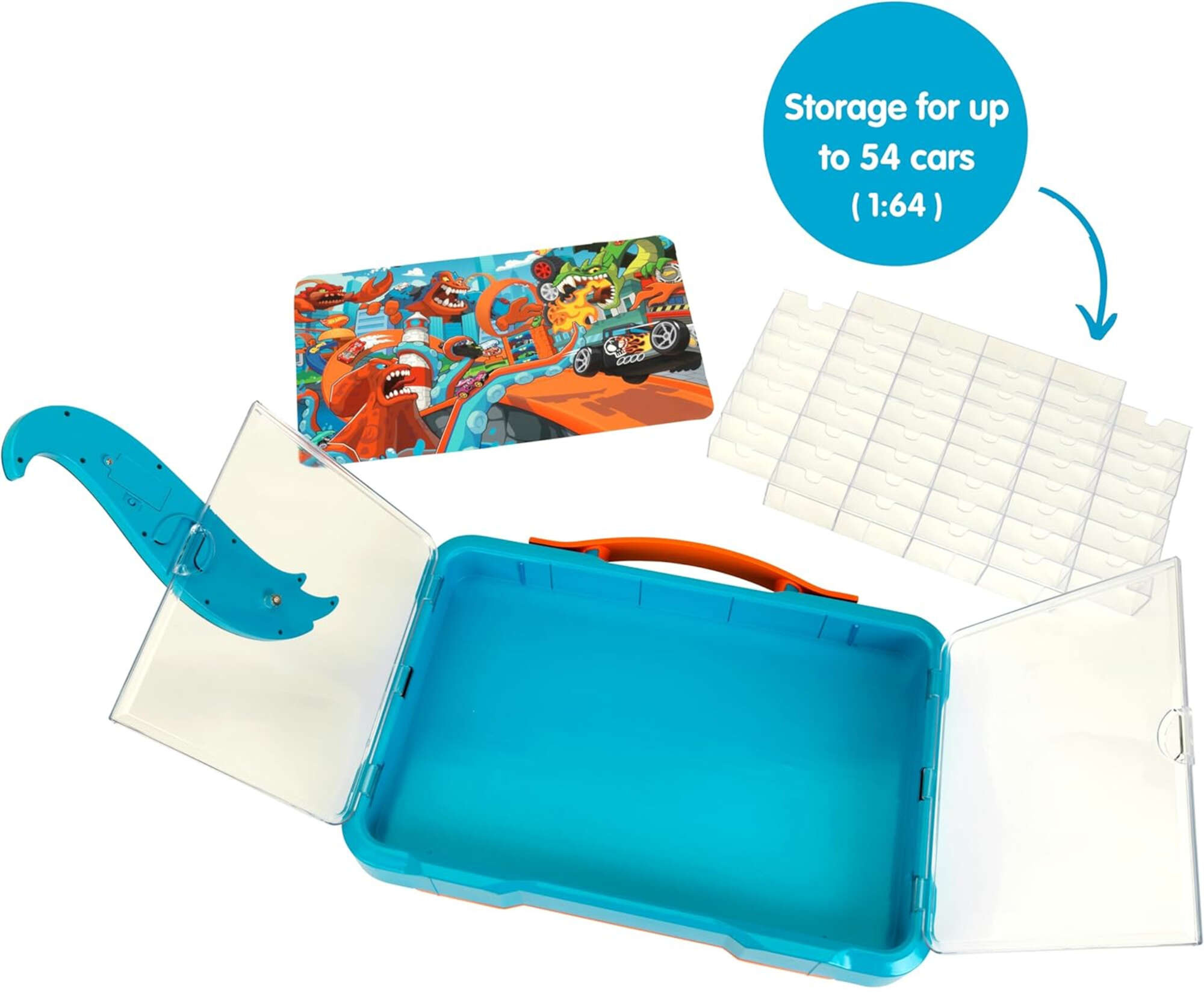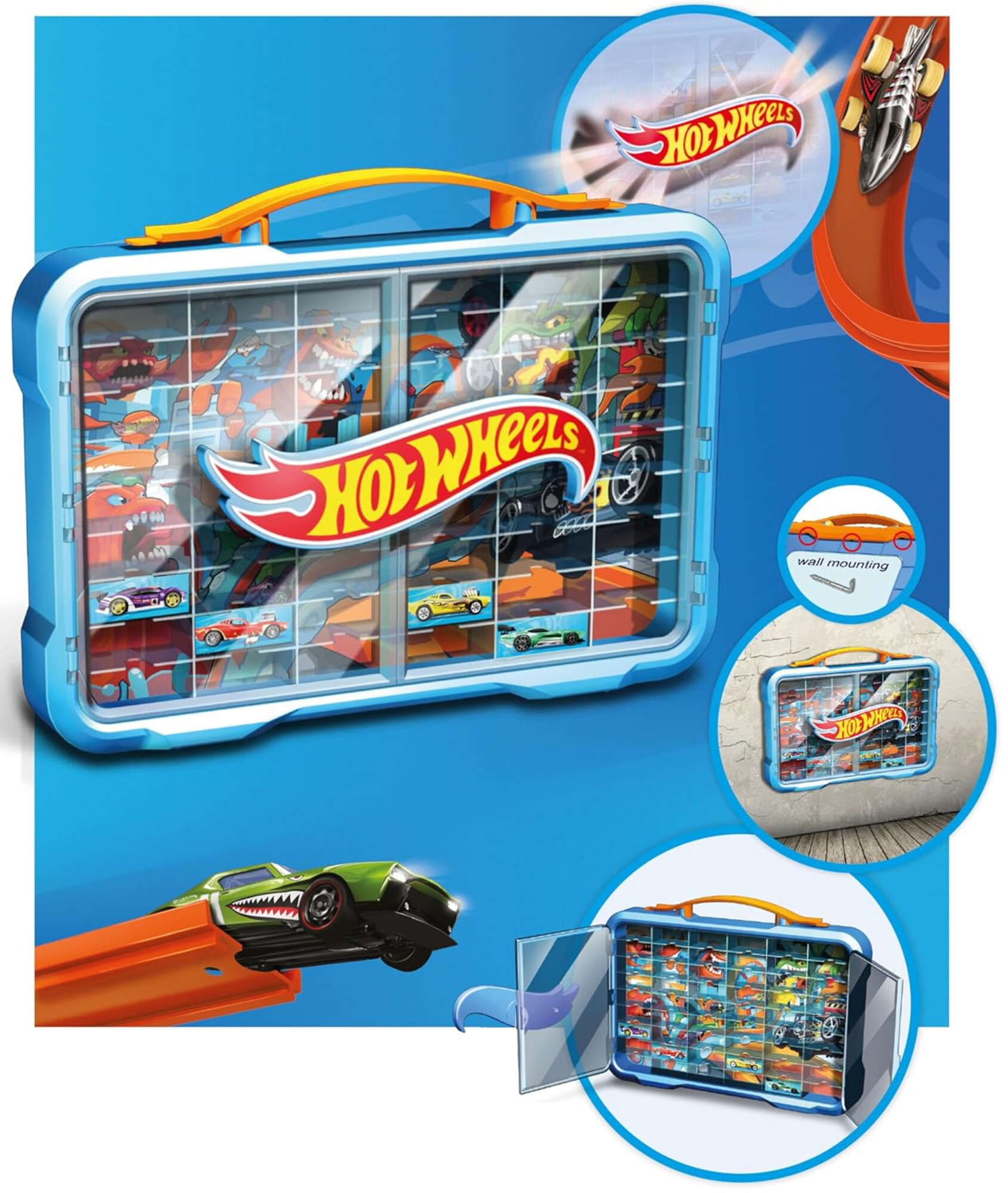 - Ta elegancka walizka to nie tylko praktyczny organizer, ale i imponująca gablota dla fanów Hot Wheels! Zaprojektowana z myślą o miłośnikach małych samochodzików, oferuje miejsce na 54 pojazdy w skali 1:64 oraz podświetlane logo Hot Wheels, które dodaje je