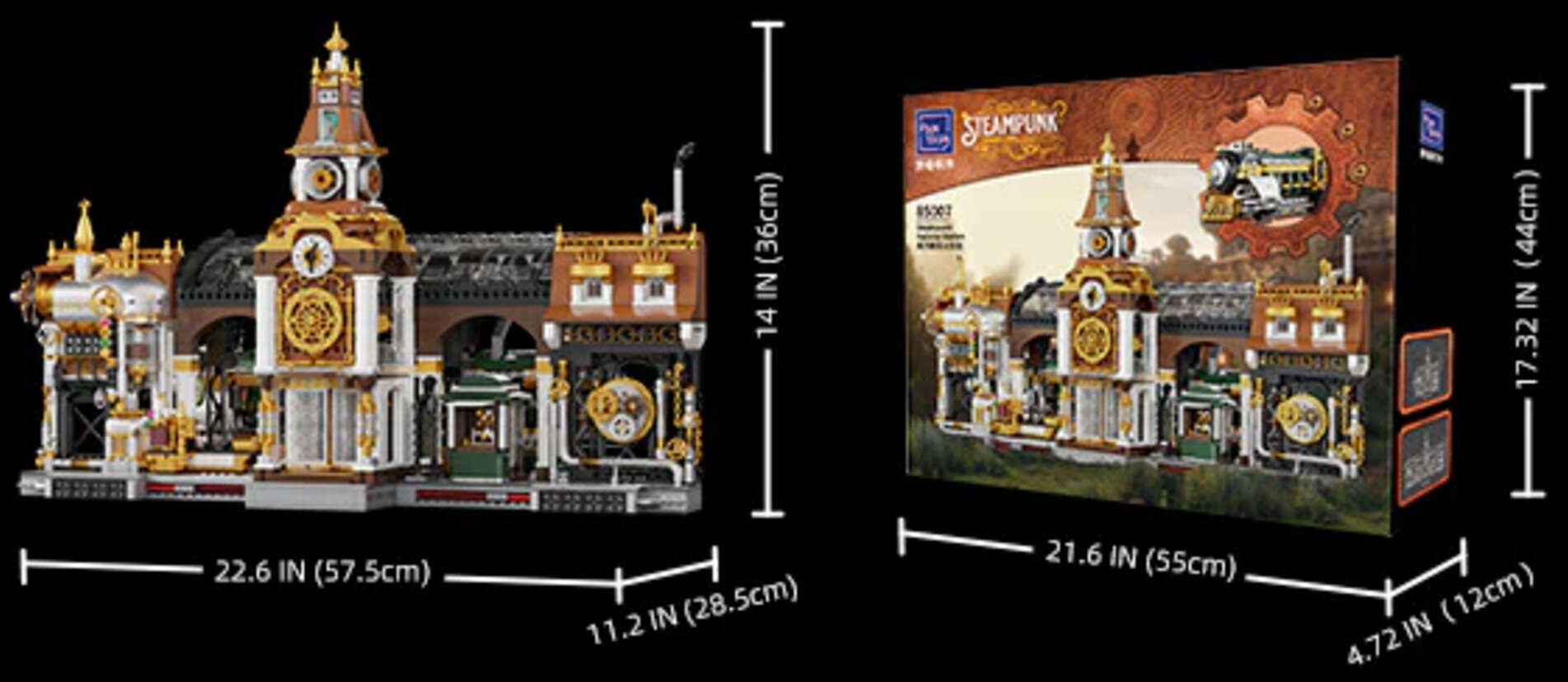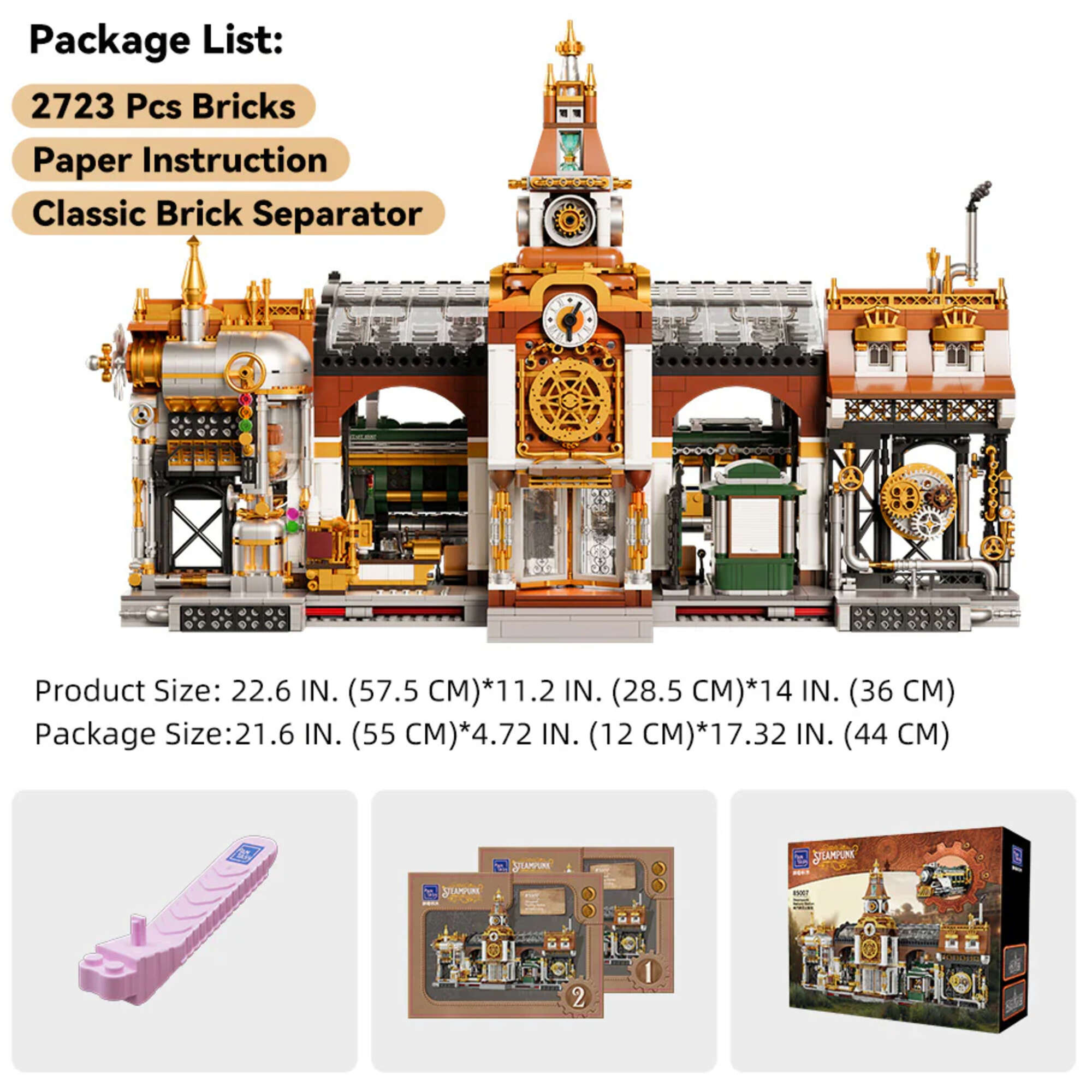 - Zestaw Steampunk Series Railway Station to imponująca konstrukcja, która przenosi użytkownika w świat industrialnego steampunka i retro-futurystycznej architektury. Model wyróżnia się unikalnym designem, łączącym surowe, metaliczne odcienie mosiądzu i brą