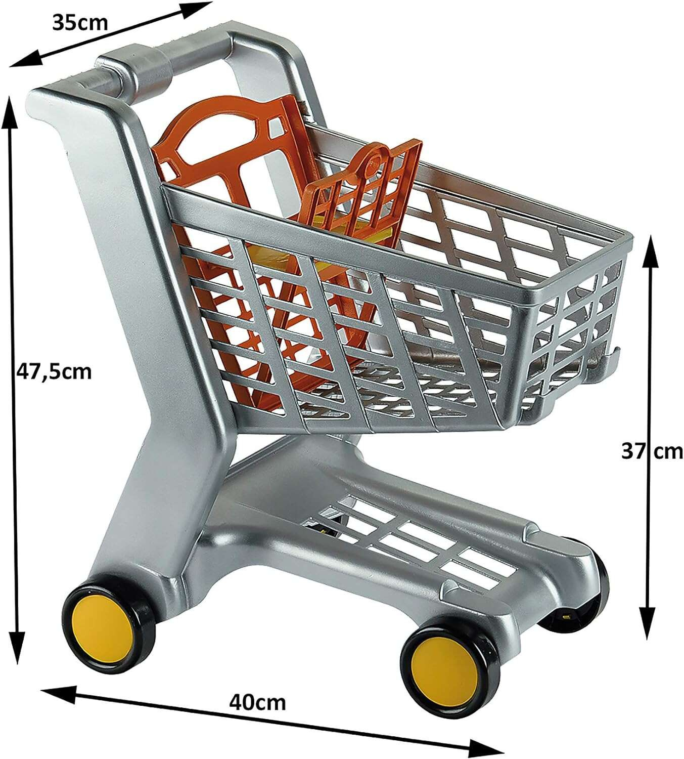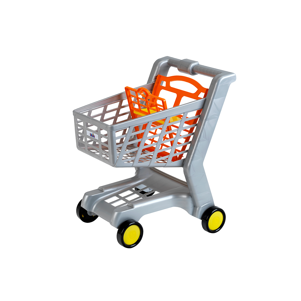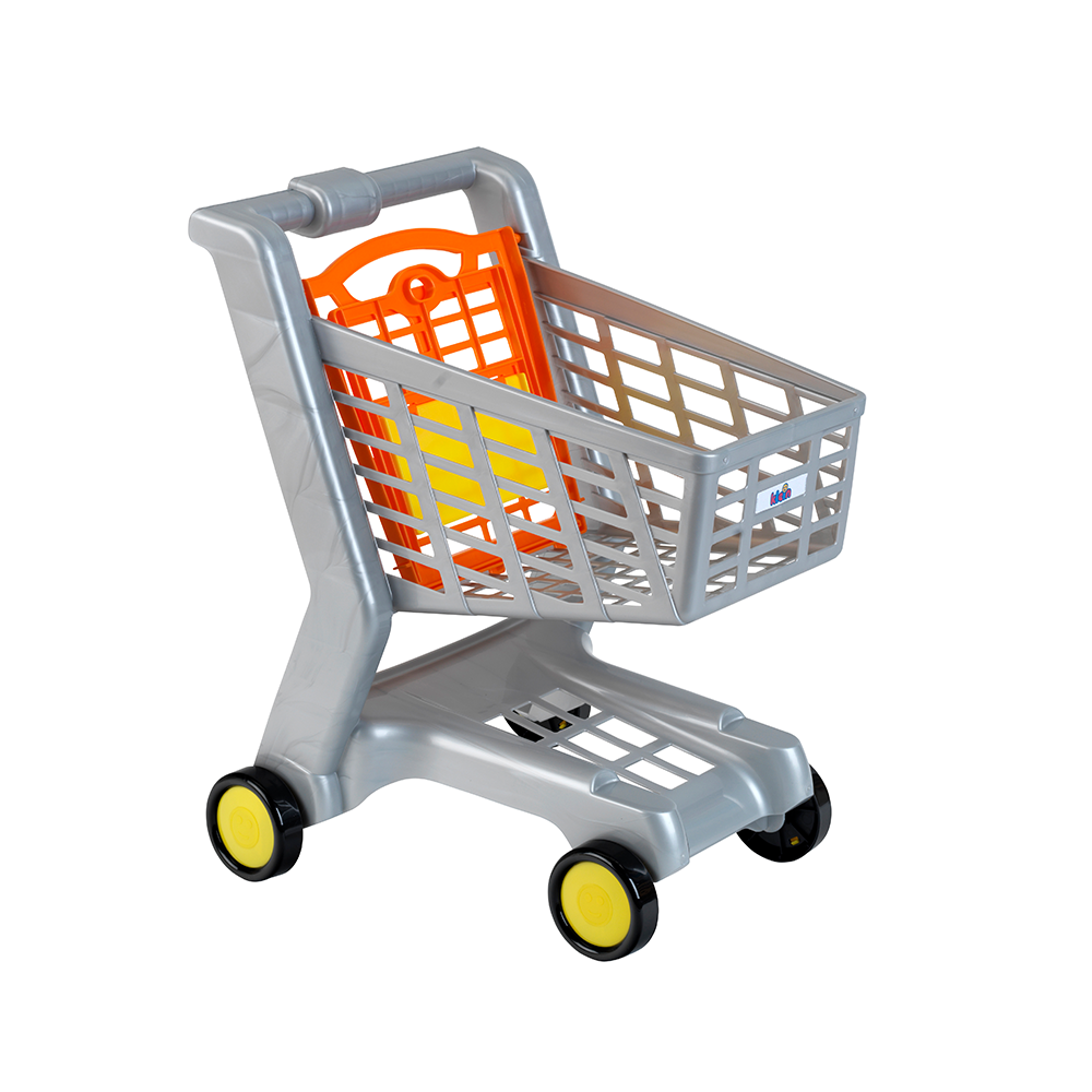 Wózek sklepowy jest w kolorze szarym. Posiada miejsce na monetę, czteryczarne kółka oraz pomarańczowo-żółte siedzisko, w którym dziecko może posadzić swoją ulubioną lalkę lub misia W wózku pomieszczą się wszystkie niezbędne drobiazgi podczas zabawy w sklep. Rozmiar wózka dopasowany jest do wielkości i potrzeb dziecka oraz jest zupełnie bezpieczny w użytkowaniu.
