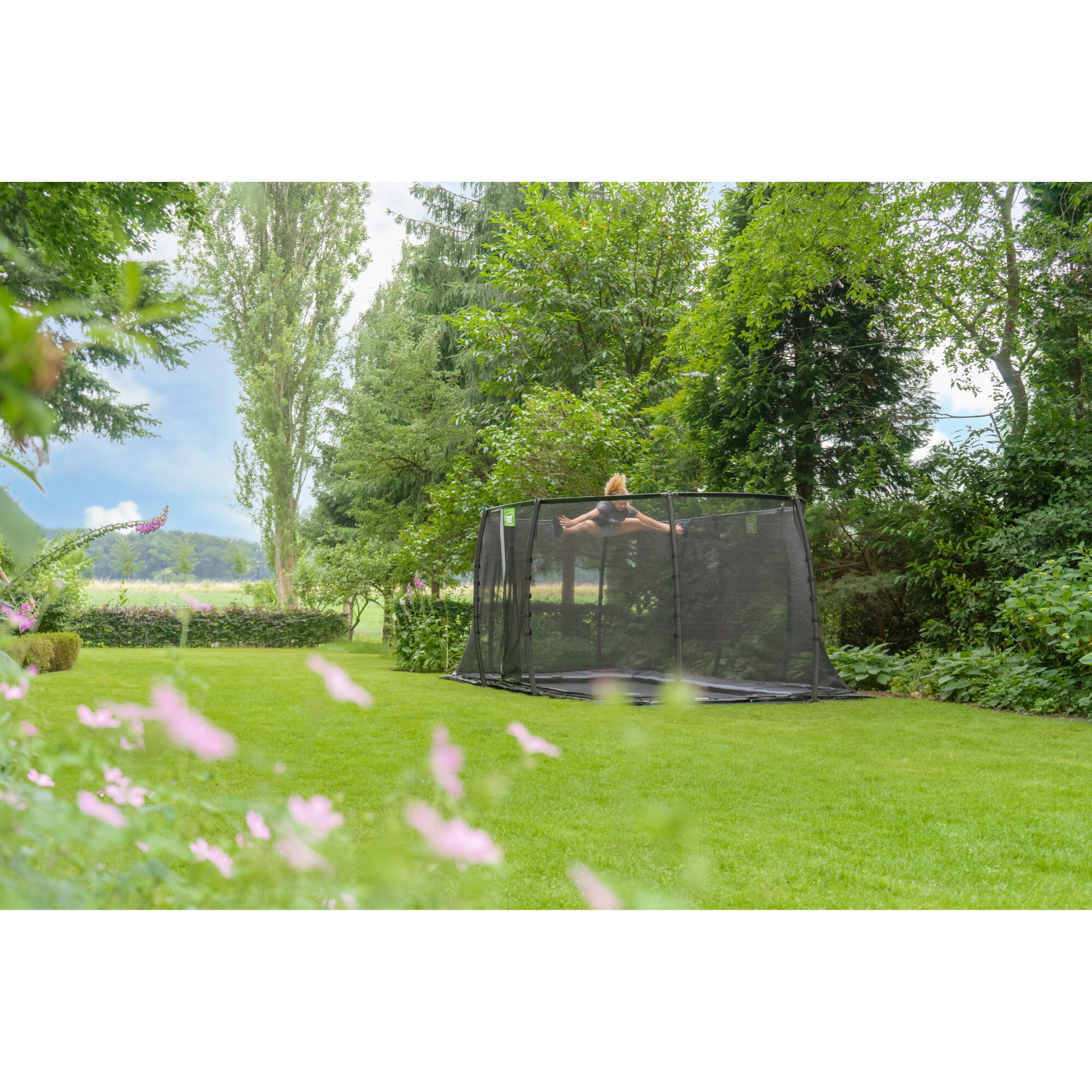 Trampolina ogrodowa naziemna Dynamic EXIT z siatką zabezpieczającą 275 x 458 cm czarna
