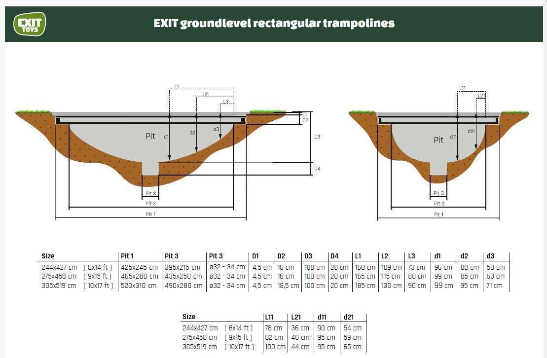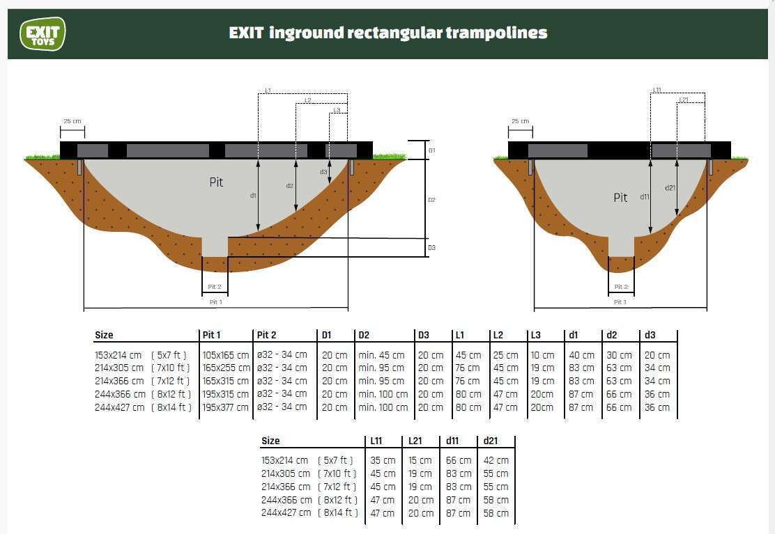 Trampolina jest modelem ziemnym, co oznacza, że przed jej montażem należy wykopać odpowiedni otwór w gruncie (zgodnie ze schematem producenta). Zapewnia to stabilność konstrukcji oraz ułatwia bezpieczne wchodzenie i schodzenie z trampoliny bez konieczności korzystania z drabinki. Dokładne wymiary i kształt wykopu można znaleźć w instrukcji producenta. Dzięki temu rozwiązaniu trampolina harmonijnie wtapia się w otoczenie ogrodu, zachowując estetyczny wygląd przestrzeni.