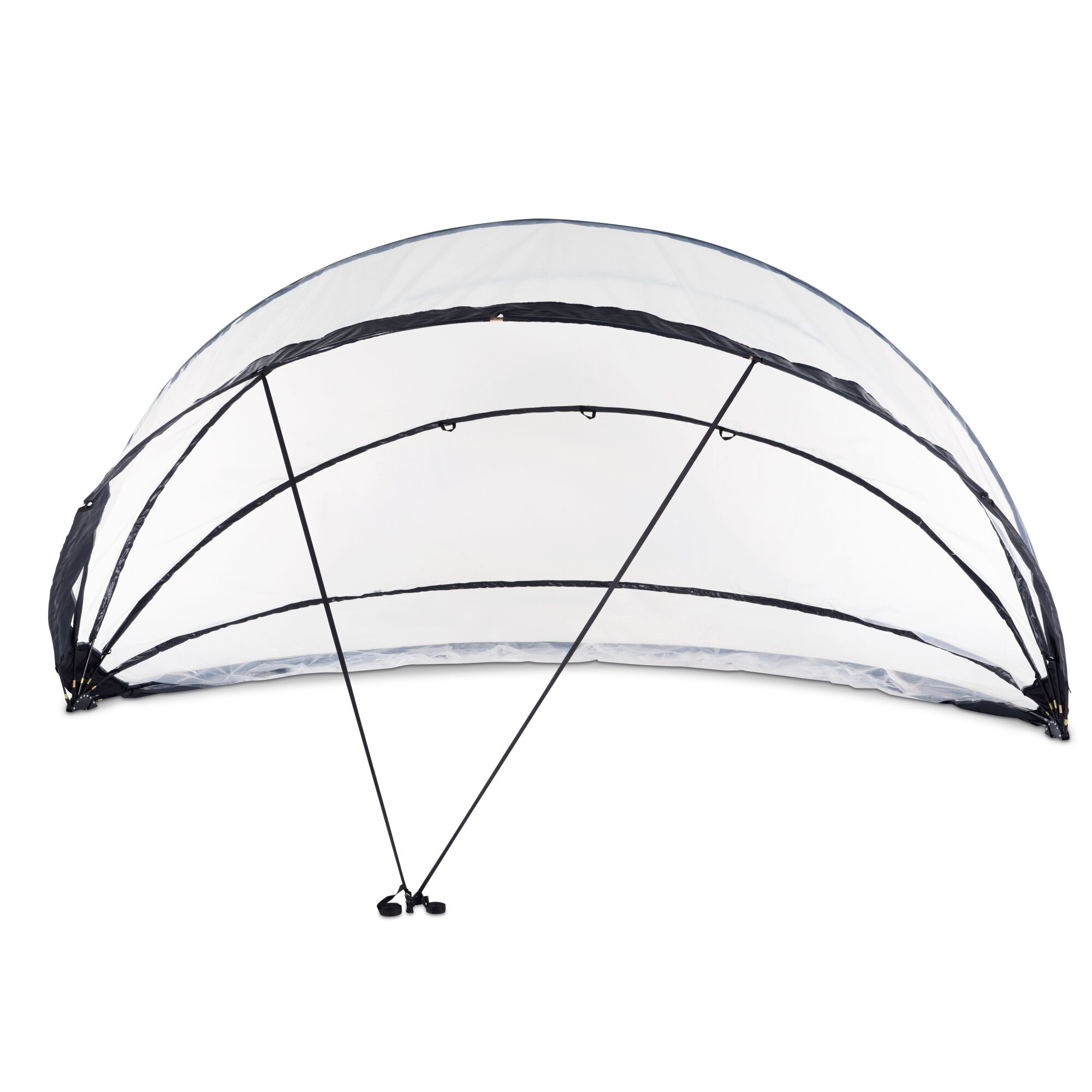 Dzięki imponującej wysokości 278 cm w kopule możesz swobodnie stać w pozycji wyprostowanej, a dodatkowa przestrzeń umożliwia zabawę czy relaks, na przykład podczas rzucania piłką. Wytrzymałe słupki z włókna szklanego i metalowe zawiasy gwarantują stabilność nawet przy silnym wietrze. Dodatkowo, wbudowane haki pozwalają na zawieszenie dekoracyjnych elementów, takich jak lampki czy girlandy, nadając przestrzeni wyjątkowy, przytulny charakter.