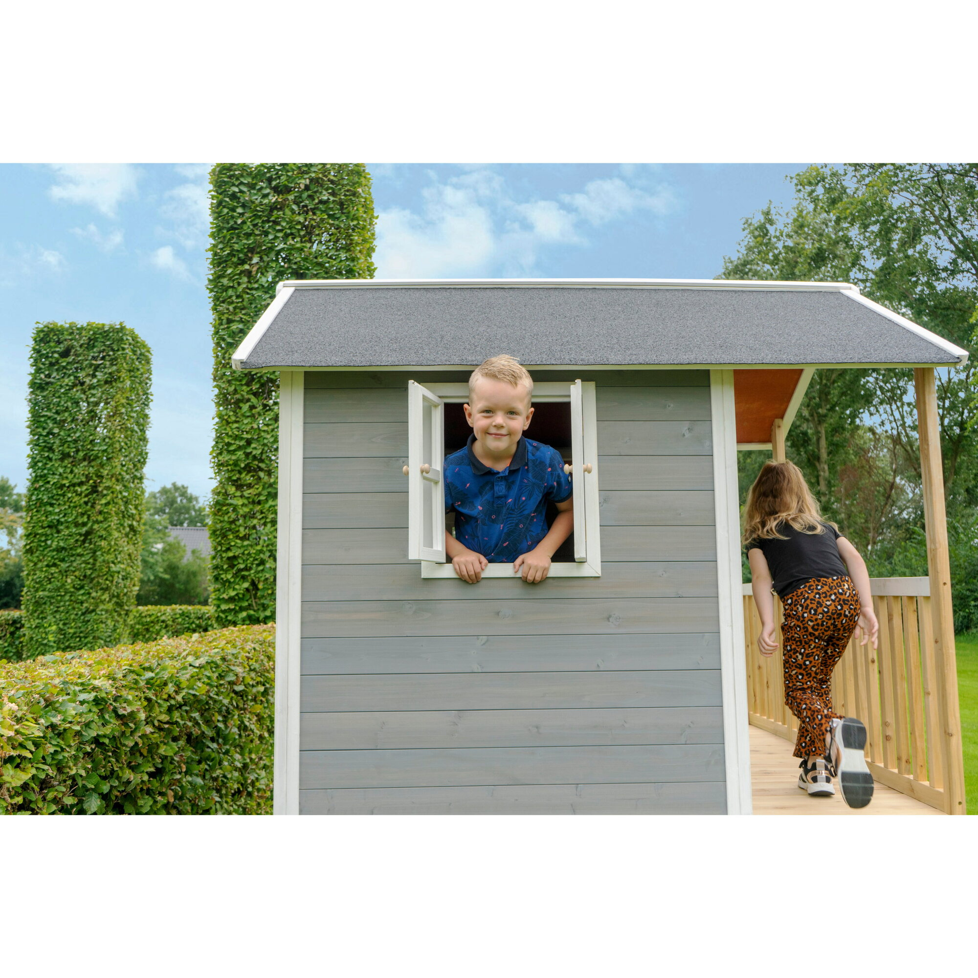 Drewniany domek ogrodowy Exit Loft 300 w kolorze szarym sprawi, że dzieci nie będą się nudzić. Stoi na nogach i wyposażony jest w drabinę oraz zjeżdżalnię, które można zamontować zarówno z lewej, jak i z prawej strony. Wstępnie zmontowane elementy zapewniają szybki montaż. Jego elegancki, skandynawski design z pewnością będzie dobrze się dobrze prezentować w ogrodzie!