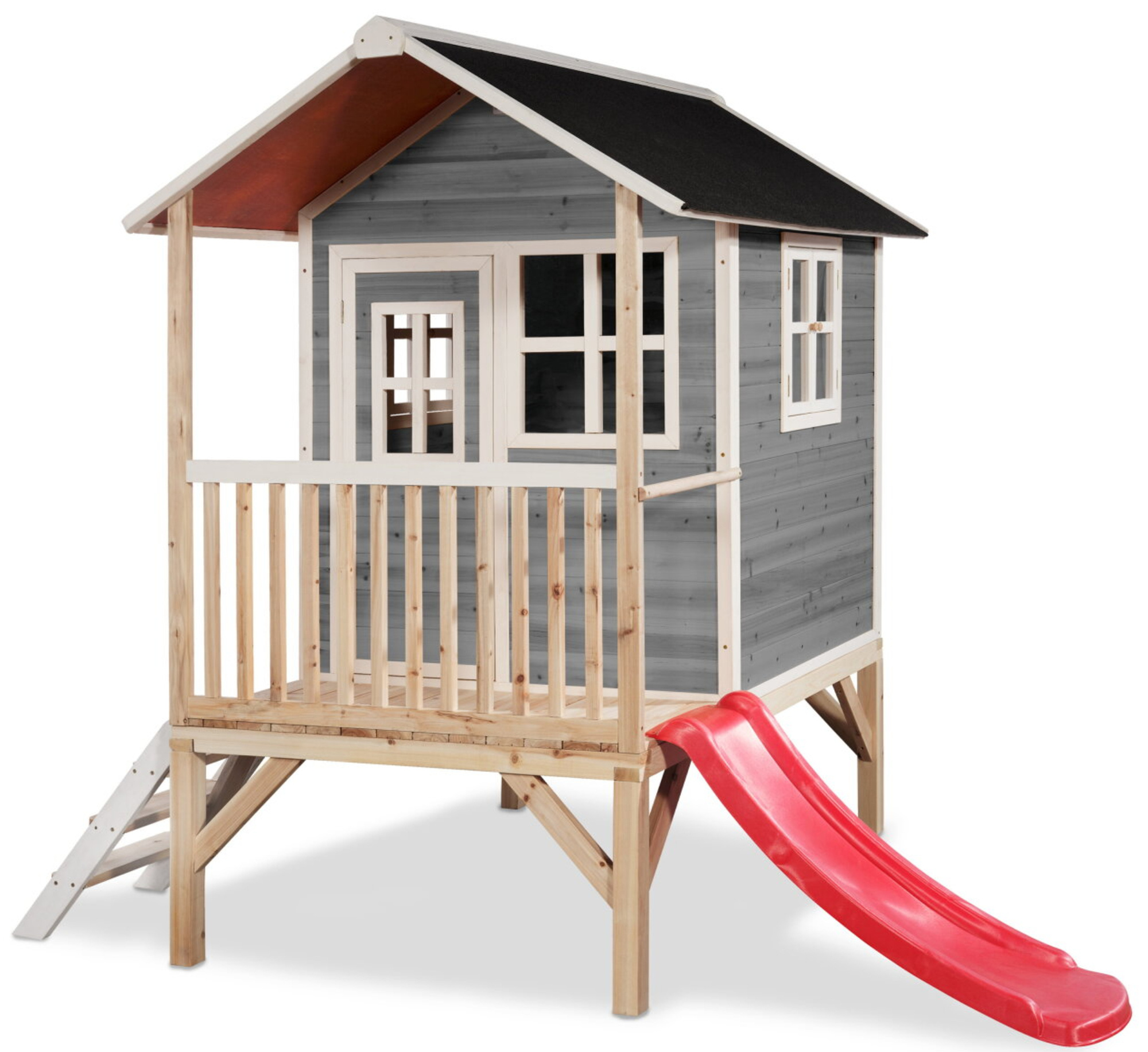 - Drewniany domek ogrodowy Exit Loft 300 w kolorze szarym sprawi, że dzieci nie będą się nudzić. Stoi na nogach i wyposażony jest w drabinę oraz zjeżdżalnię, które można zamontować zarówno z lewej, jak i z prawej strony. Wstępnie zmontowane elementy zapew