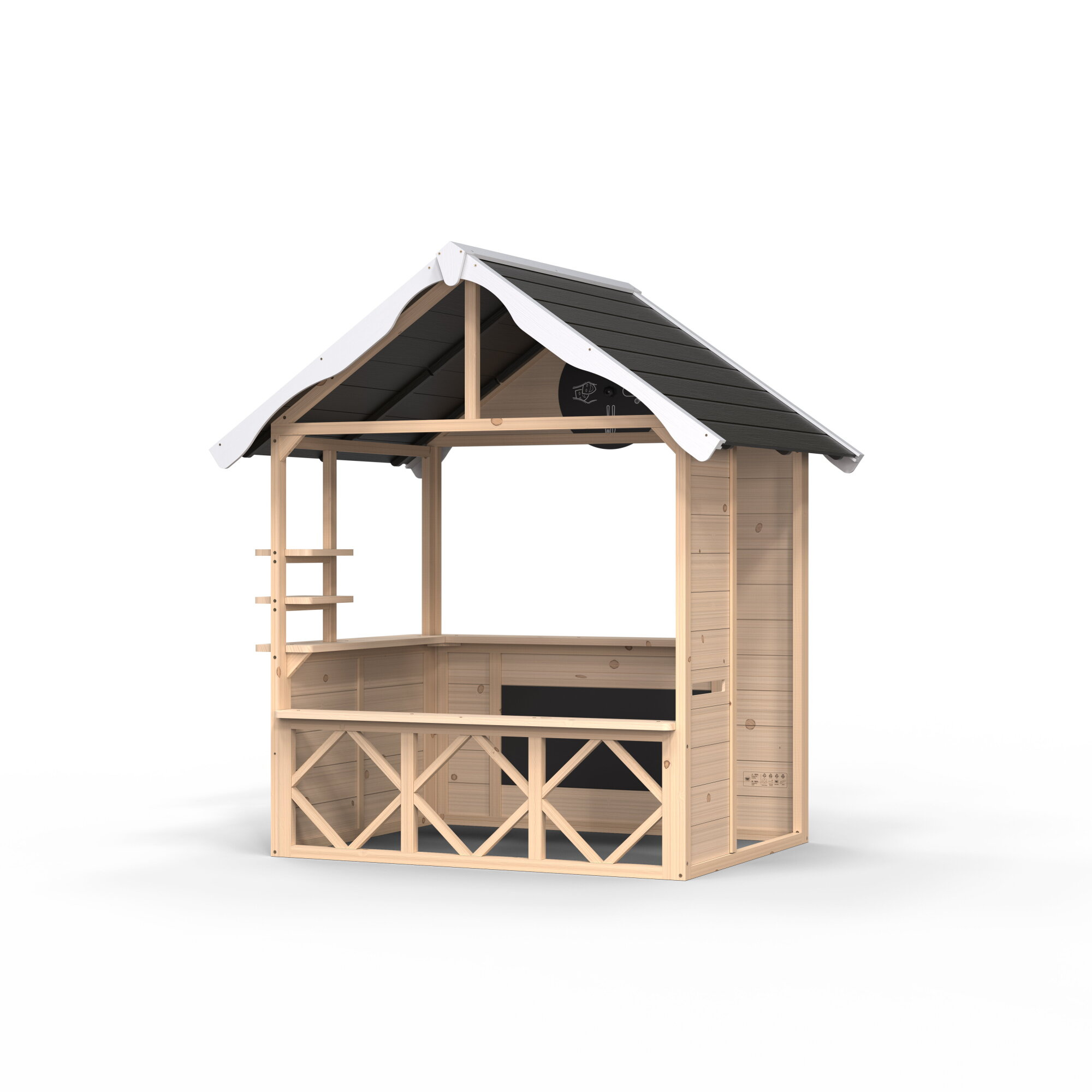 Kompaktowy, otwarty design domku sprawia, że doskonale wpisuje się w każdy ogród, stając się nie tylko miejscem do zabawy, ale również stylowym elementem przestrzeni. Przemyślane detale, takie jak blat, ogrodzenie, półki pokryte farbą tablicową oraz zabawny dach z kołem do zmiany motywów, dodają domkowi charakteru i pozwalają na realizację najbardziej fantazyjnych scenariuszy – od przyjęcia w restauracji po wizyty u lekarza weterynarii.