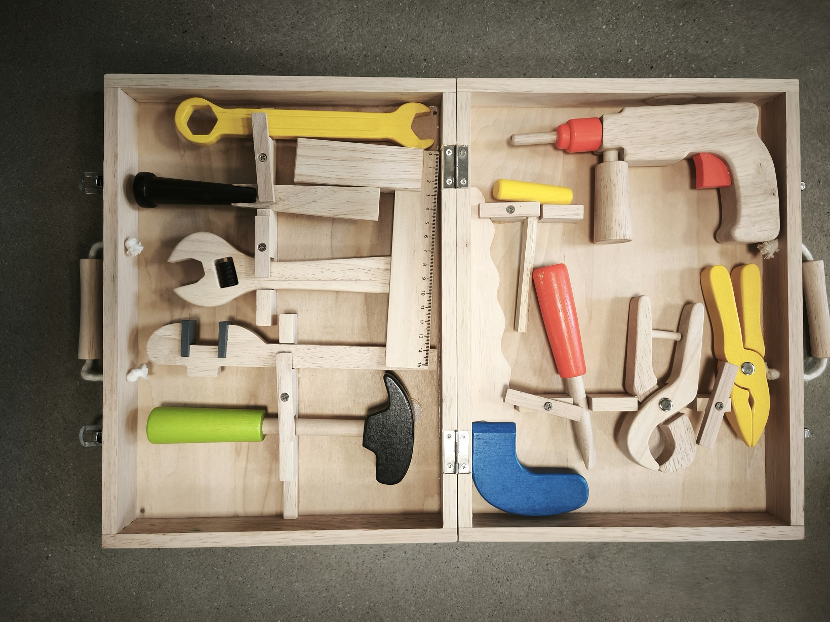 - Small Foot Drewniany Przybornik z Narzędziami , zawierający najważniejsze narzędzia dla małego majsterkowicza.