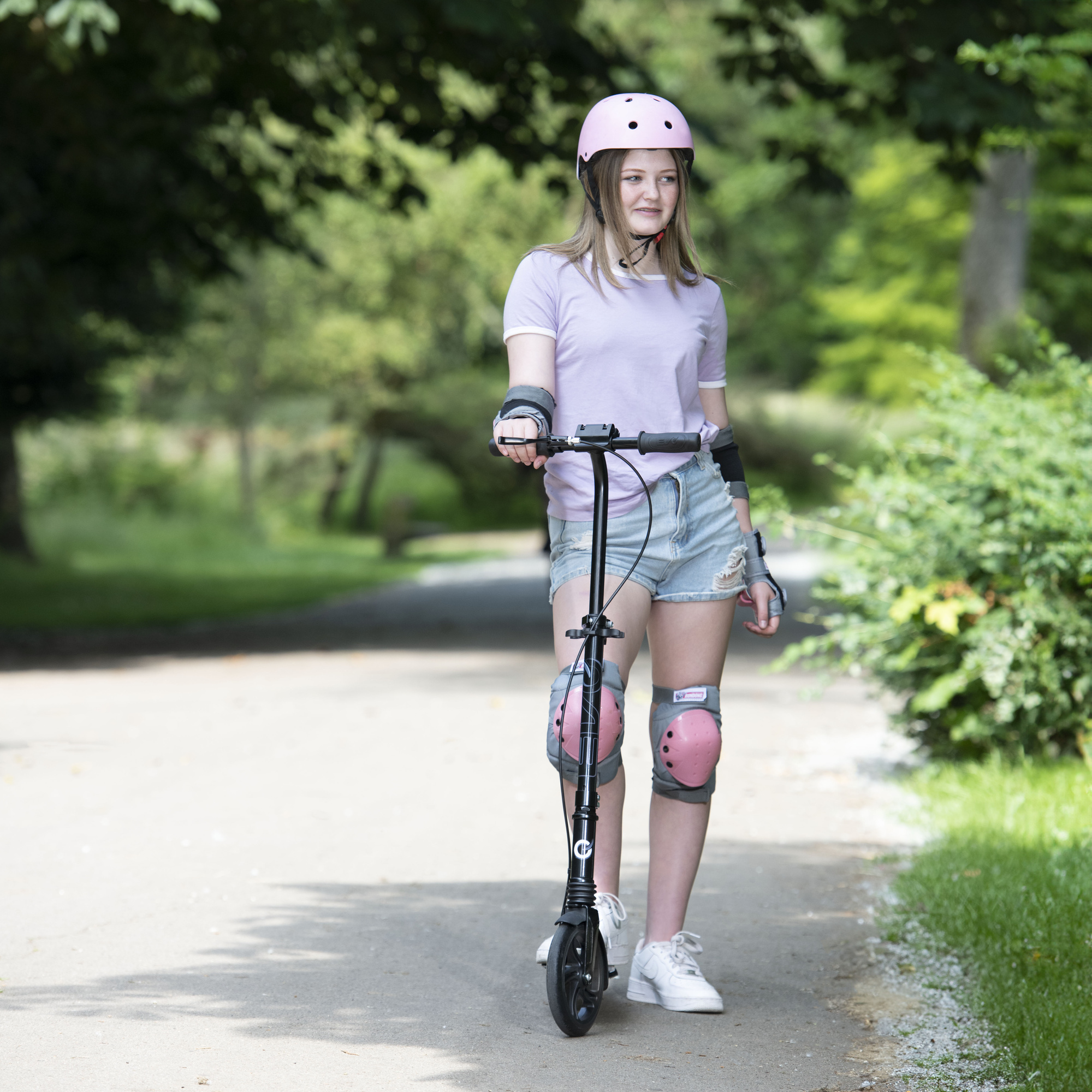 Kierownica posiada uchwyty typu TPR, stworzone z gumy i silikonu, które zapewniają wygodne trzymanie bez ślizgania. Hulajnoga została wyposażona w elastyczne zawieszenie, które niweluje odczuwanie nierówności różnych powierzchni. Ponad to hulajnoga posiada stopkę, chroniącą pojazd przed uszkodzeniami podczas odkładania na podłodze bądź opieraniu o nawierzchnie w domu czy na świeżym powietrzu. Dodatkowo, pojazd posiada funkcje składania, która ułatwi przechowywanie.