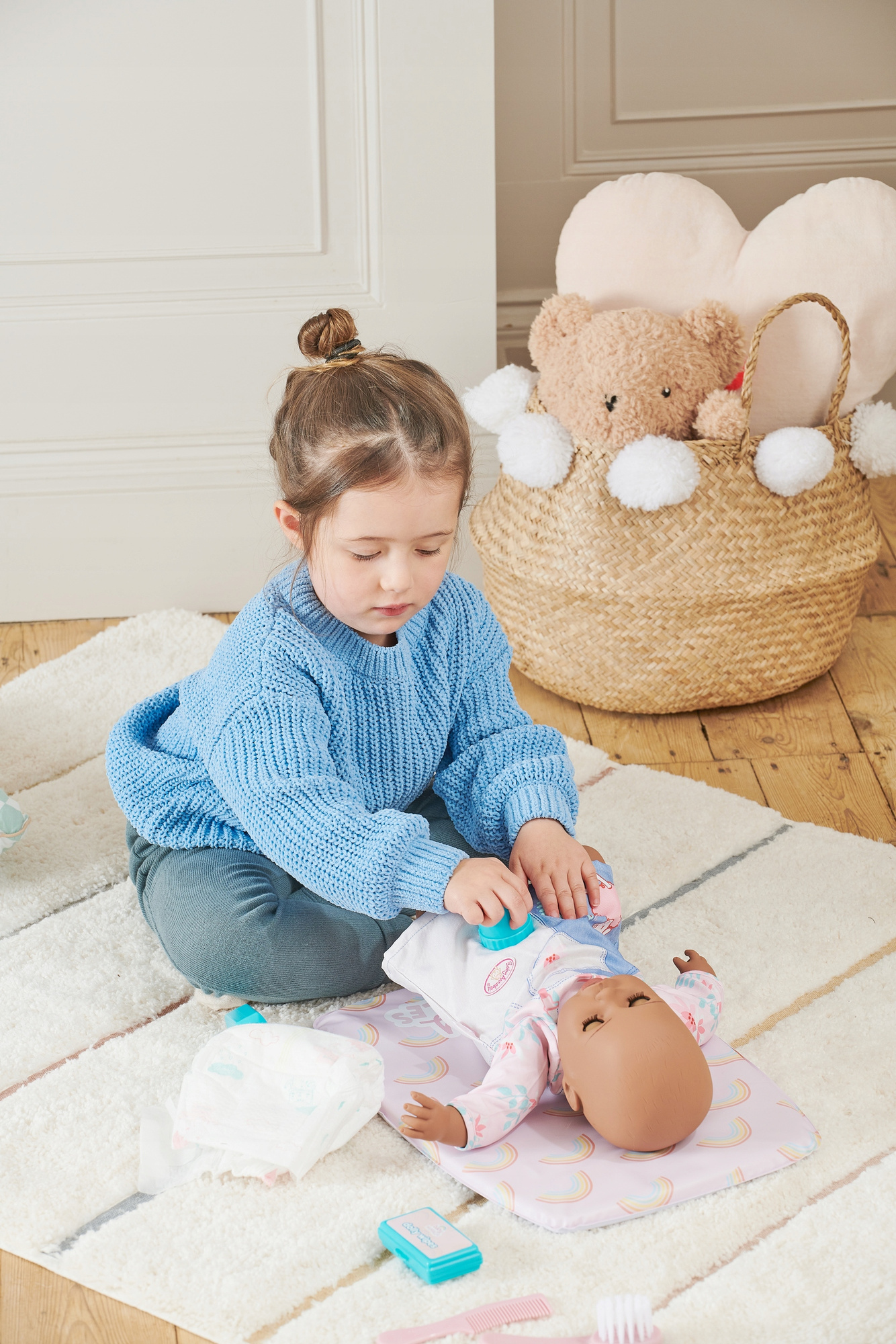 Dziecko może poczuć się jak prawdziwy opiekun małego dziecka. Pieluszka i mata idealnie sprawdzą się dla lalek o wielkości ok 46 cm.
