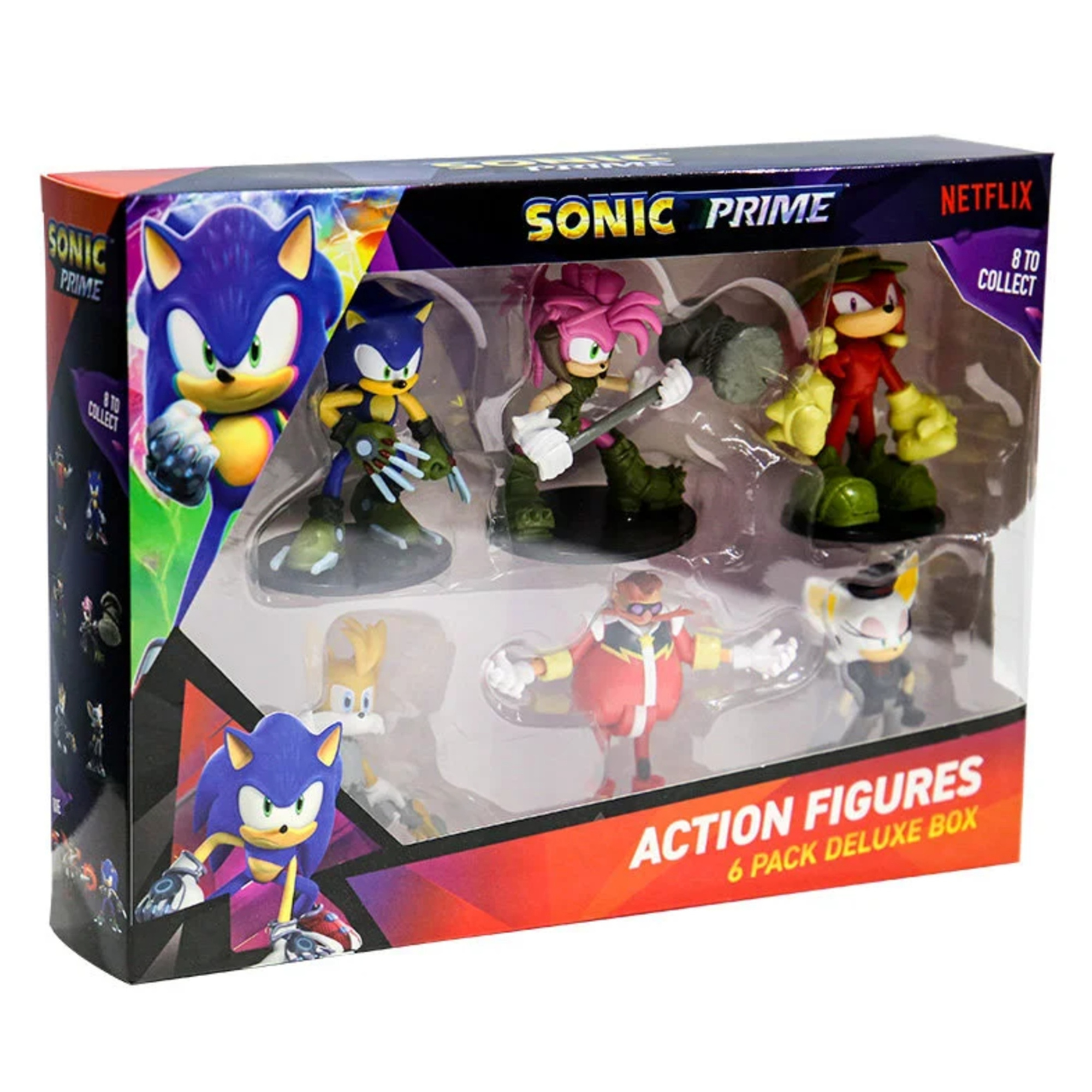 Zestaw zawiera 6 figurek z bohaterami animacji Sonic Prime. Do zebrania jest 8 figurek, w tym 2 rzadkie.