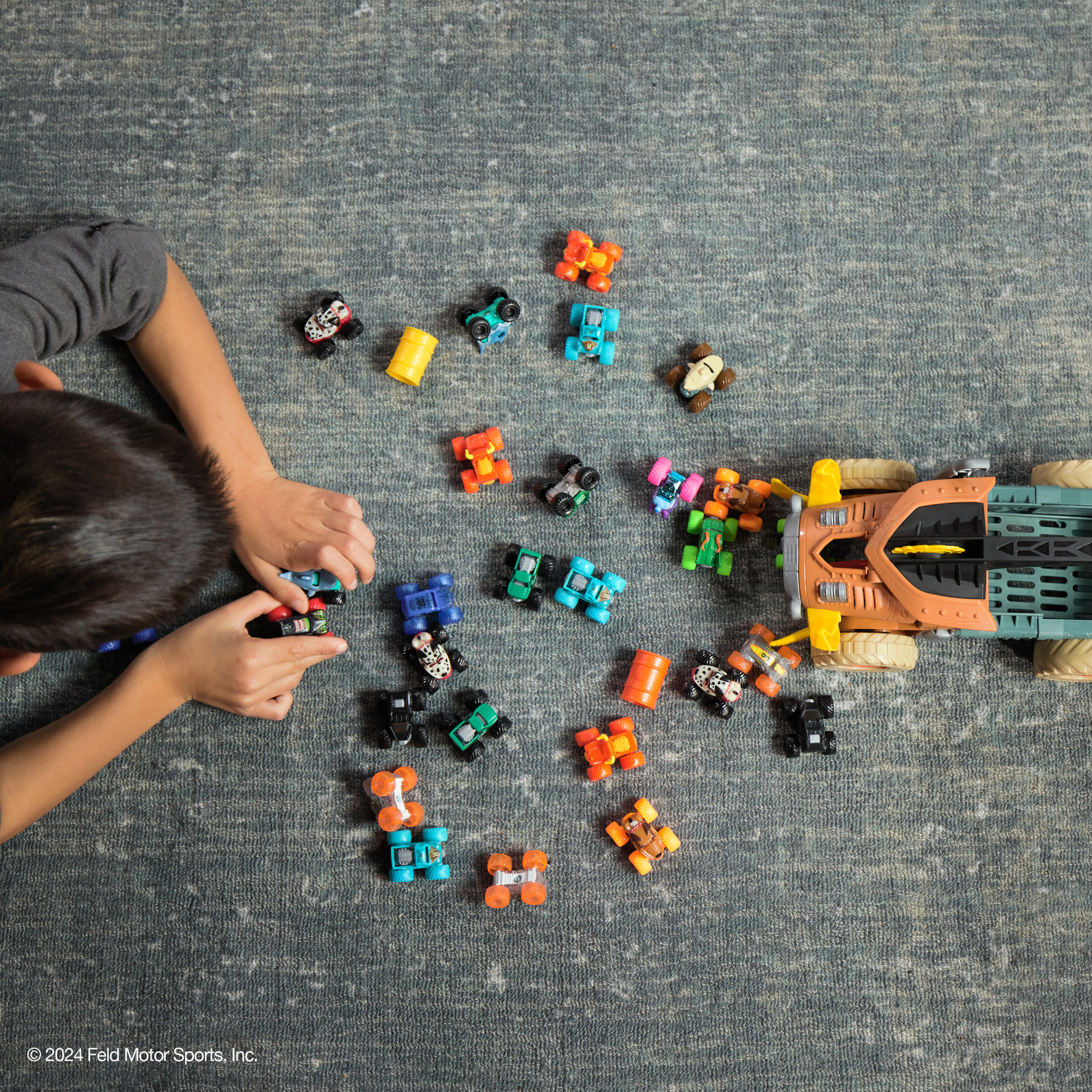 Zgodność z wszystkimi Monster Jam Mini Jams w skali 1:87 oznacza, że zestaw można łączyć z innymi truckami, tworząc własne tory przeszkód i niekończące się bitwy na podłodze.