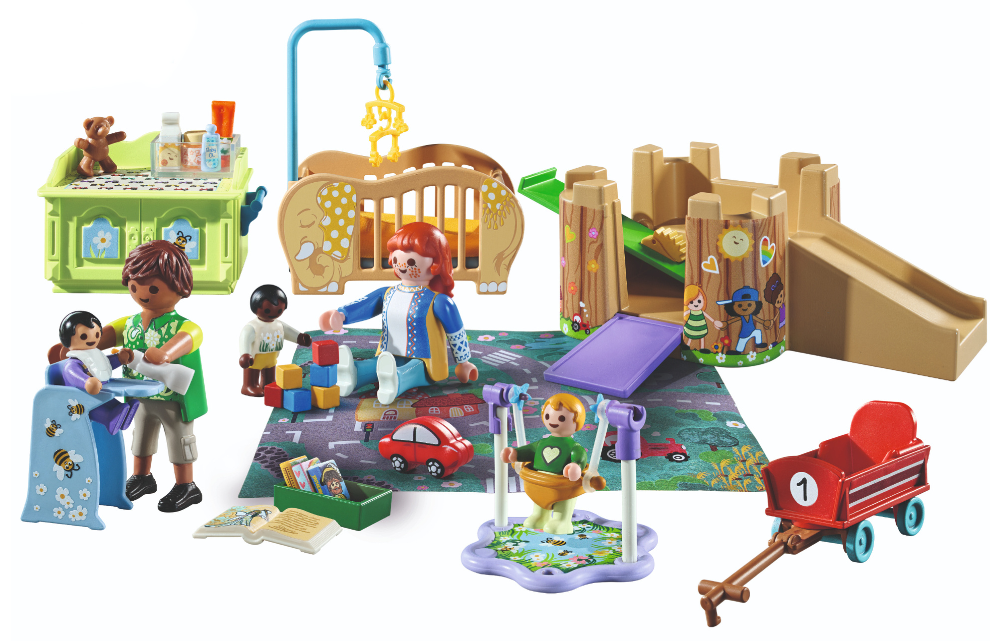 - Ten zestaw przedstawia opiekunów zajmujących się trójką maluchów w przyjaznym, bezpiecznym otoczeniu pełnym zabawek i akcesoriów do pielęgnacji. Dzieci mogą bawić się w opiekunów i wcielać w codzienne sytuacje z życia przedszkola czy żłobka.