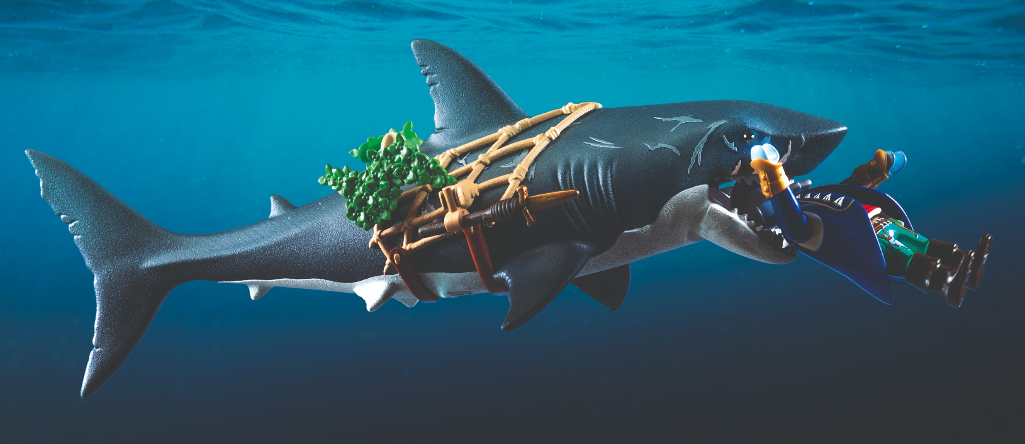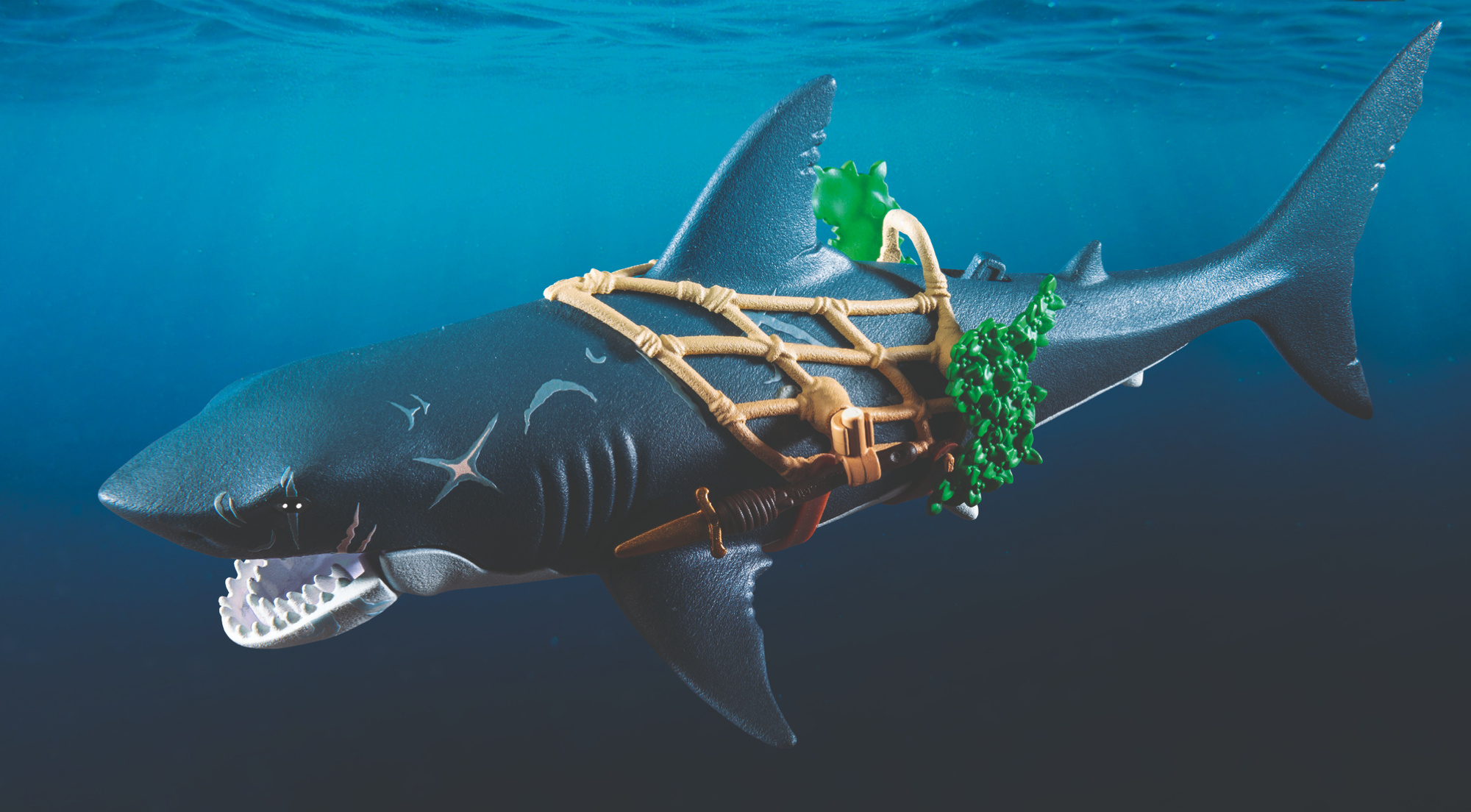 - Gigantyczny rekin: z realistycznymi detalami, pływający w wodzie, z ruchomą paszczą sterowaną dźwignią na płetwie grzbietowej.